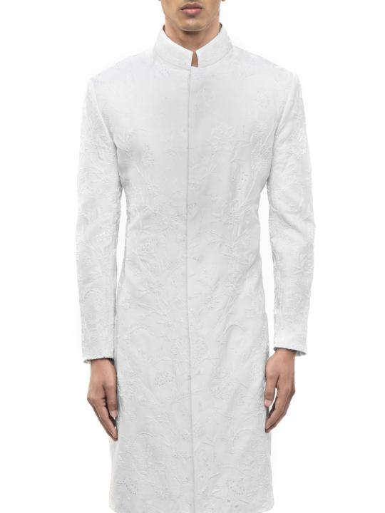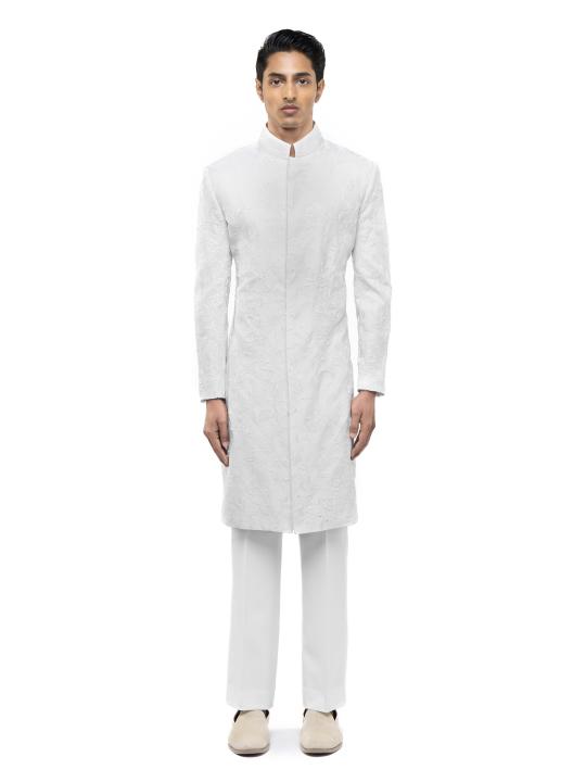 Classic and graceful, this White Silk Floral Embroidery Sherwani Set is a timeless choice for elegant celebrations. Crafted from premium silk, it features delicate floral embroidery that adds a refined charm to its minimalist design. The stand collar, concealed placket, and Mother of Pearl buttons lend a polished finish, while the regular fit and straight hem ensure all-day comfort. Perfect for weddings, engagements, or formal festivities.