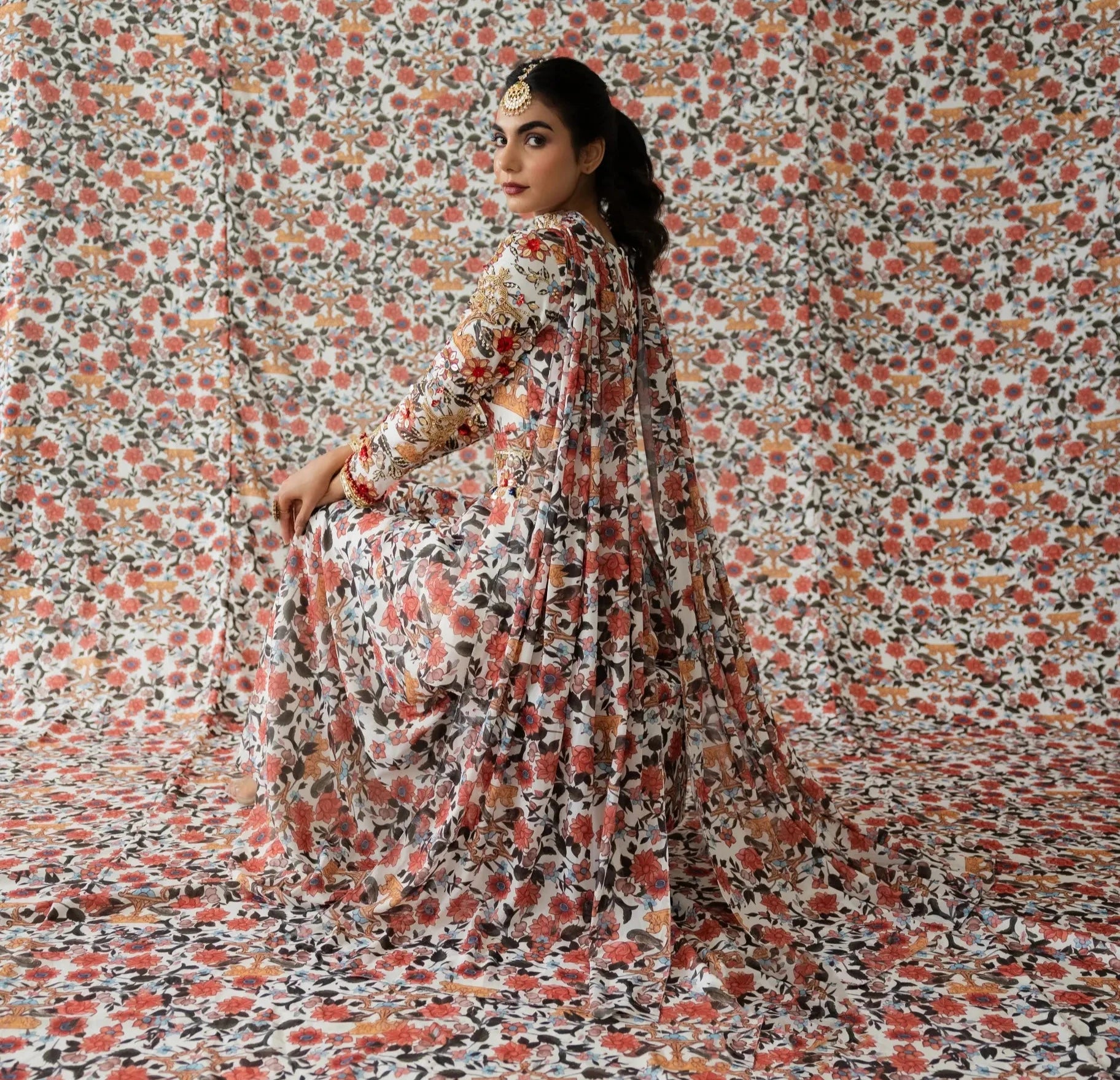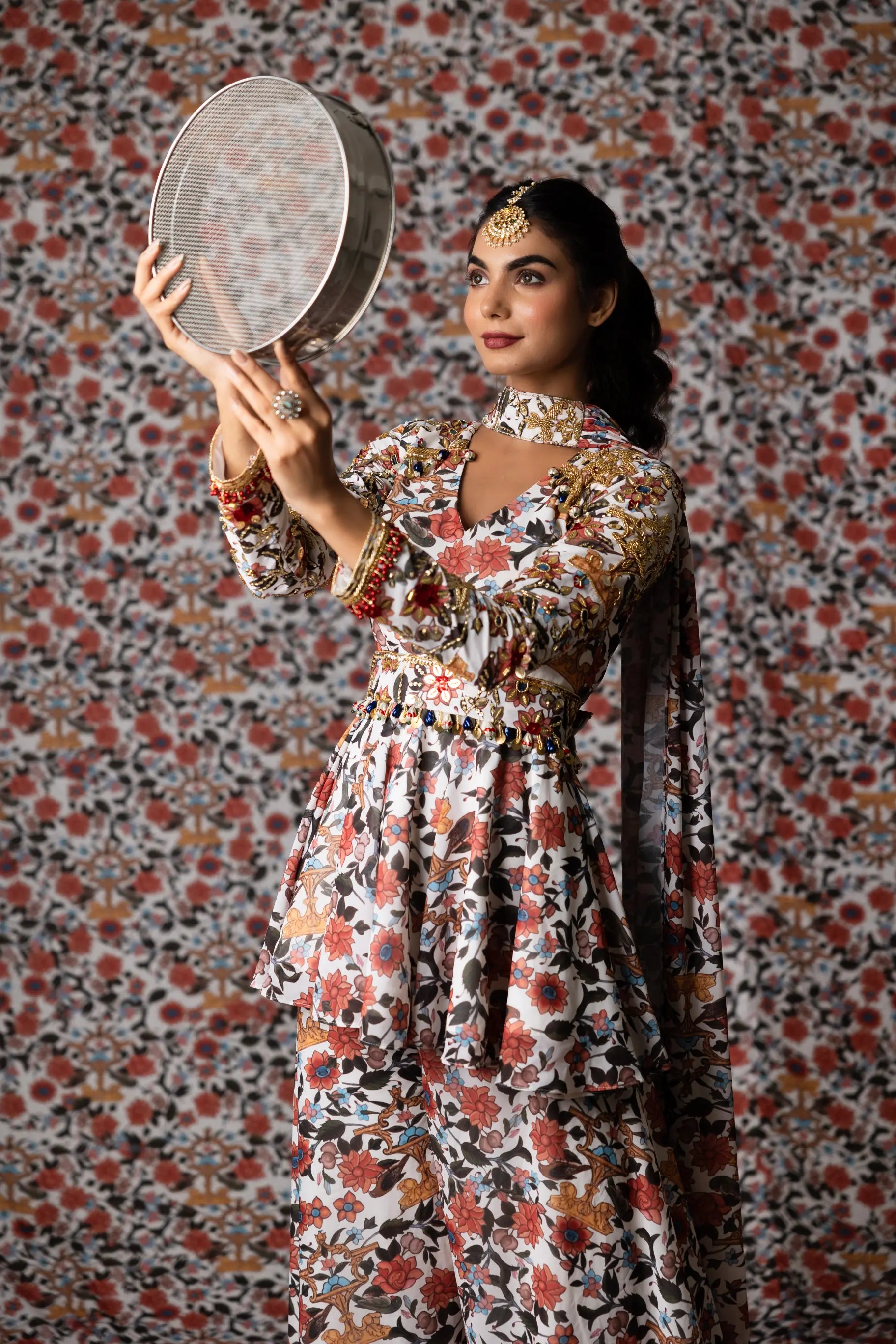 This white floral peplum top paired with flared pants is a stunning combination of modern sophistication and floral elegance. The peplum top, adorned with delicate floral patterns, offers a flattering, feminine silhouette, while the flared pants provide a bold, retro-inspired touch for a stylish, contemporary look. This ensemble is perfect for casual outings, festive gatherings, or evening events where you want to make a statement with your fashion.
