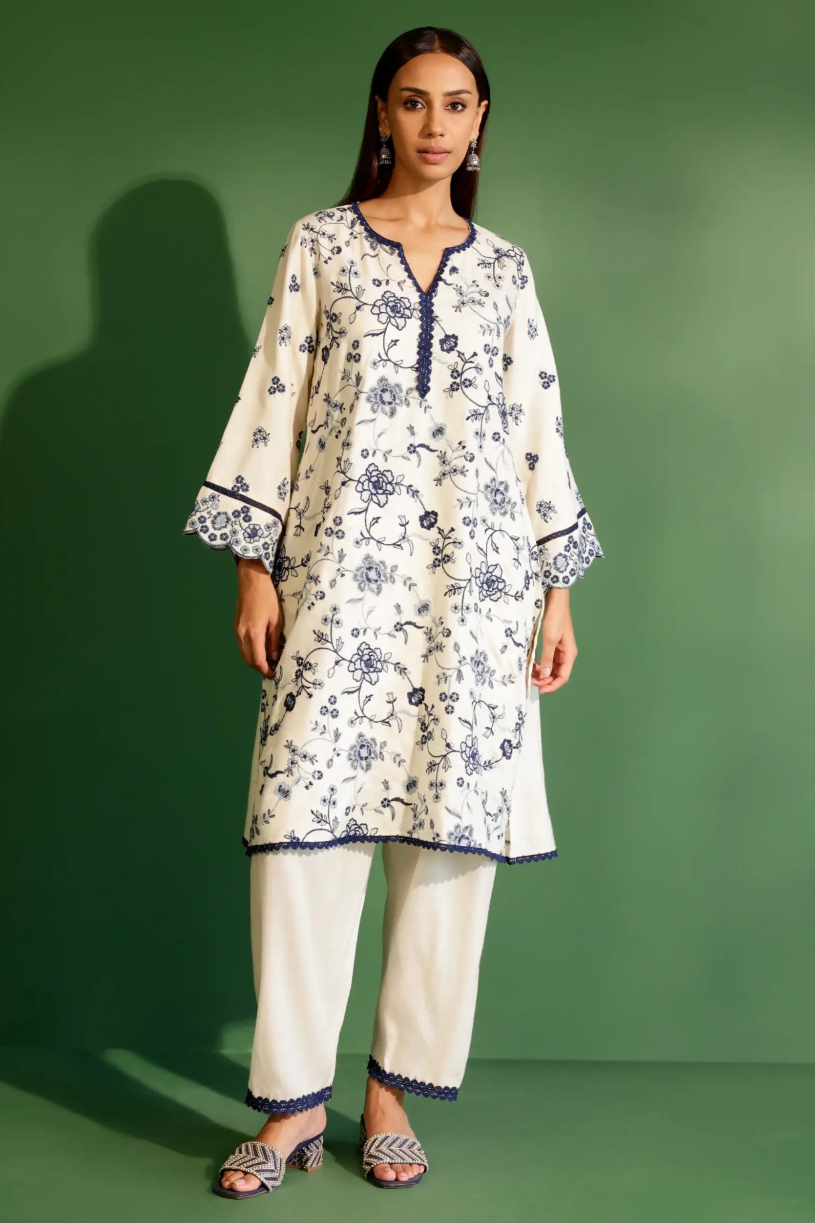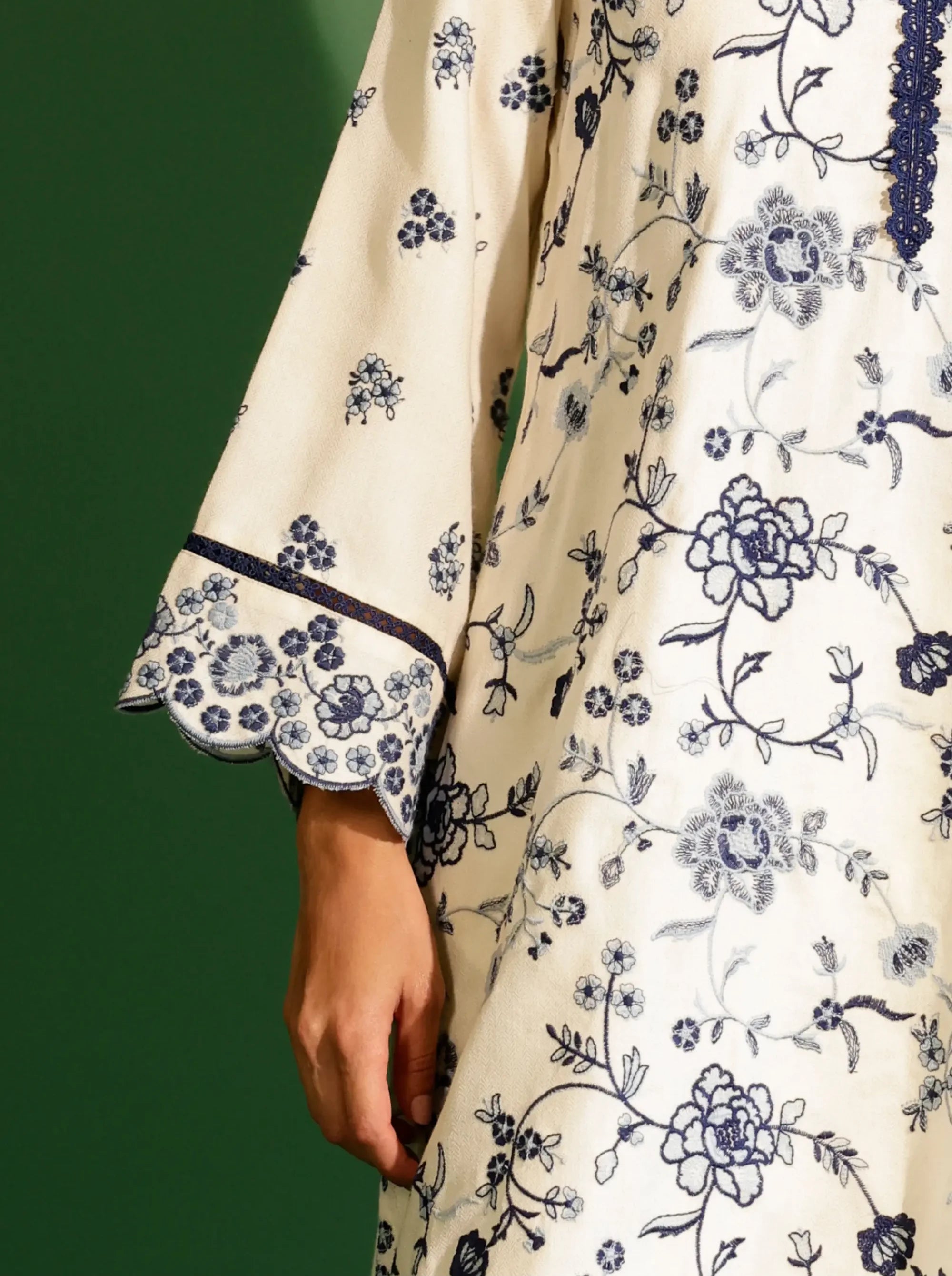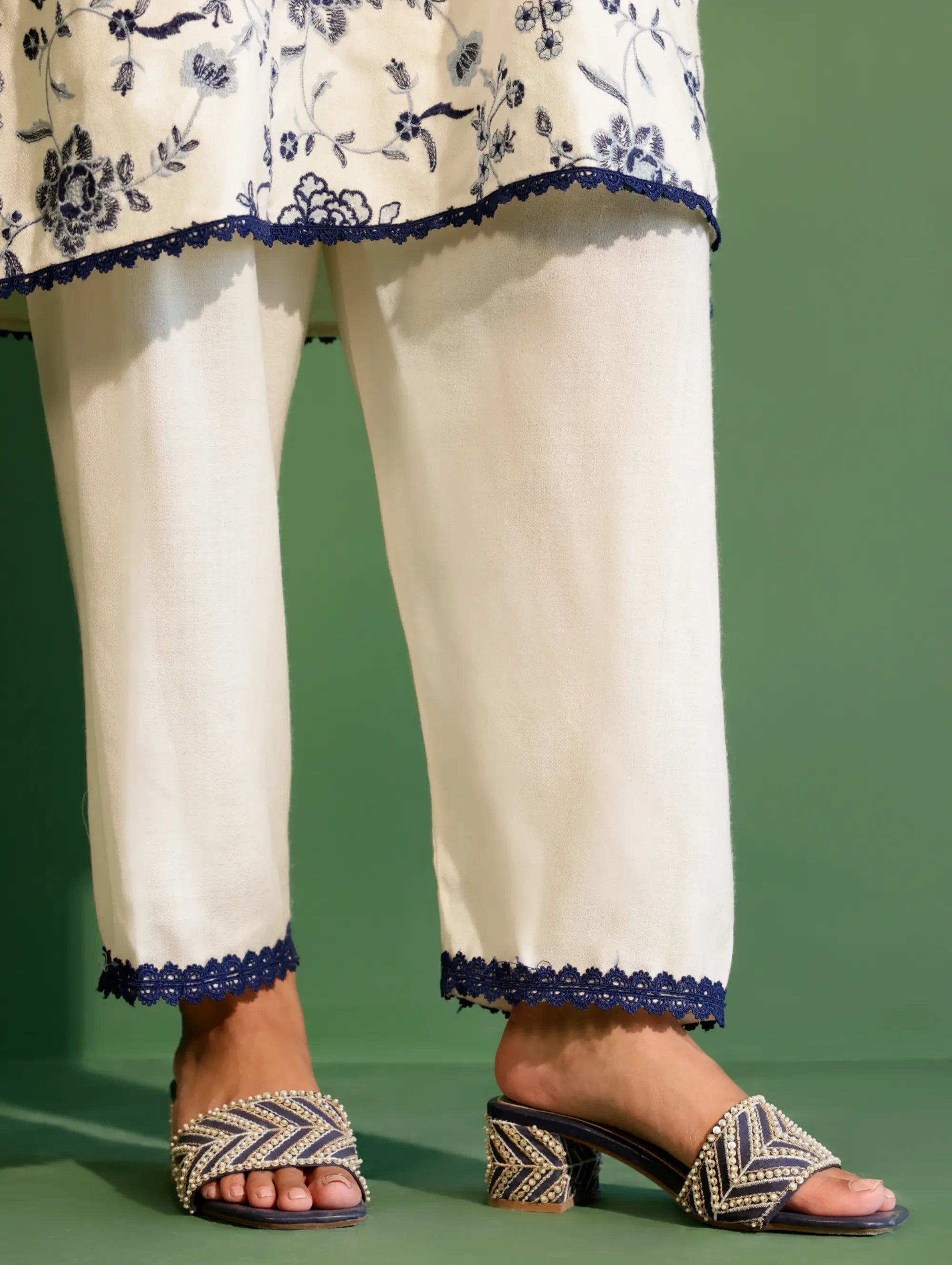 This classic white wool set combines comfort and elegance for a refined winter look. The kurta is adorned with intricate floral embroidery in contrasting navy, accented by a V-neckline framed with scalloped lace detailing. The sleeves feature embroidered cuffs with scalloped edges, adding a touch of sophistication. The matching tailored pants offer a sleek silhouette, completed with scalloped navy lace along the hem for a cohesive finish. Complete the set with a matching embroidered dupatta, creating an effortlessly elegant ensemble. Crafted from premium Marino wool, this set ensures both warmth and style.