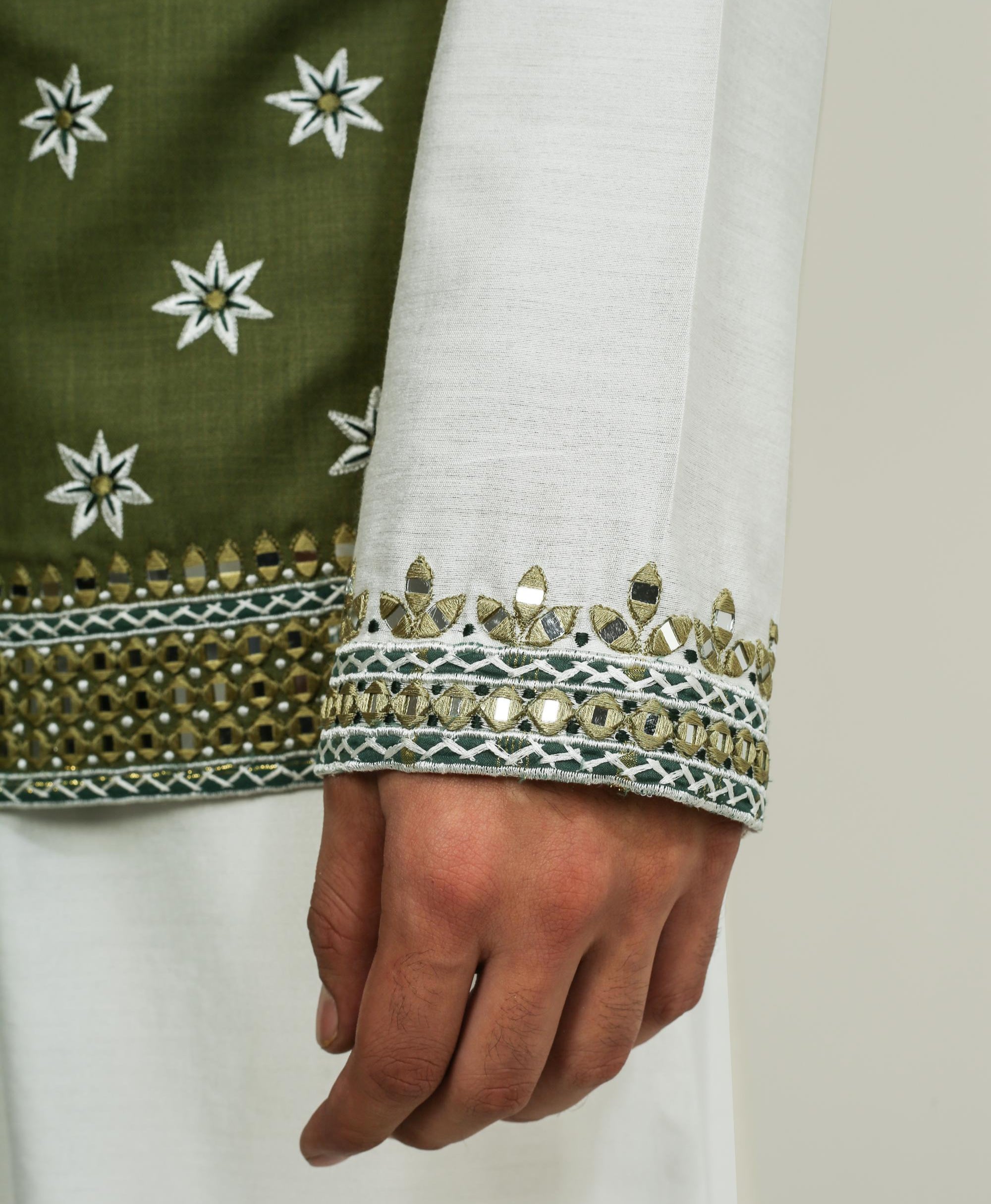 A celebration of subtle sparkle and timeless tradition, the White Kurta with Mirror Work Nehru Jacket is designed for understated elegance. The pristine white kurta provides a clean, classic foundation, while the mirror-embellished Nehru jacket adds a festive shimmer that catches the light with every move. Ideal for daytime events, mehendi functions, or festive gatherings, this ensemble balances comfort with refined glamour. Perfect for the modern man who appreciates heritage craftsmanship with a contemporary twist.