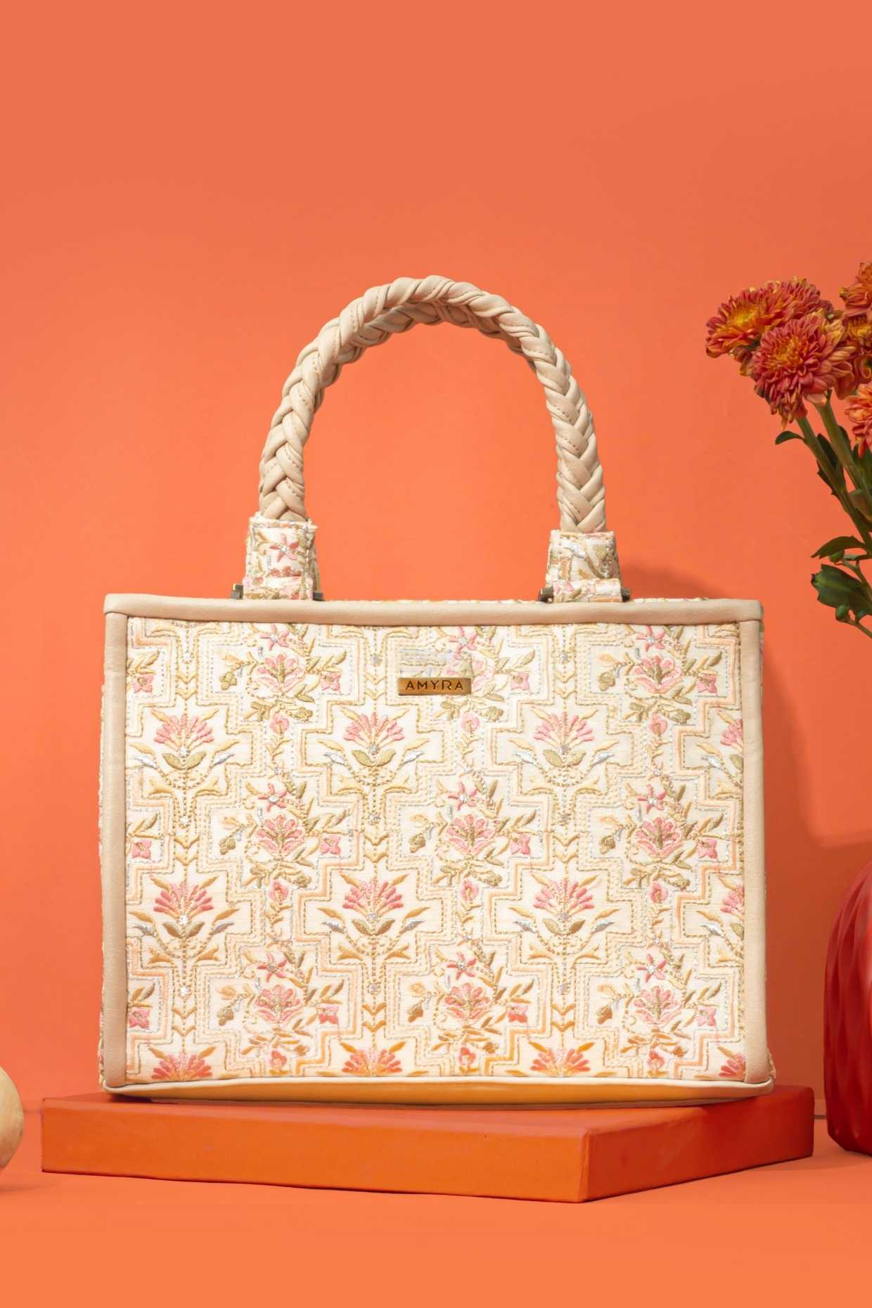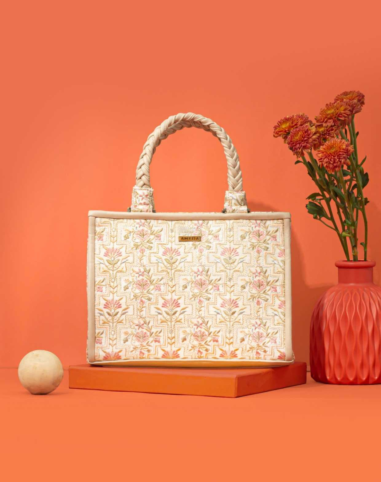 Inspired by the timeless beauty of jasmine blooms, the White Mogra Embroidered Handbag is a poetic blend of tradition and elegance. Intricately hand-embroidered with floral motifs on a pristine white canvas, this bag evokes softness, purity, and quiet luxury. Its classic silhouette offers versatility — perfect for wedding festivities, cultural celebrations, or day-to-evening occasions. Designed for the woman who cherishes artisanal finesse with a serene, sophisticated charm.
