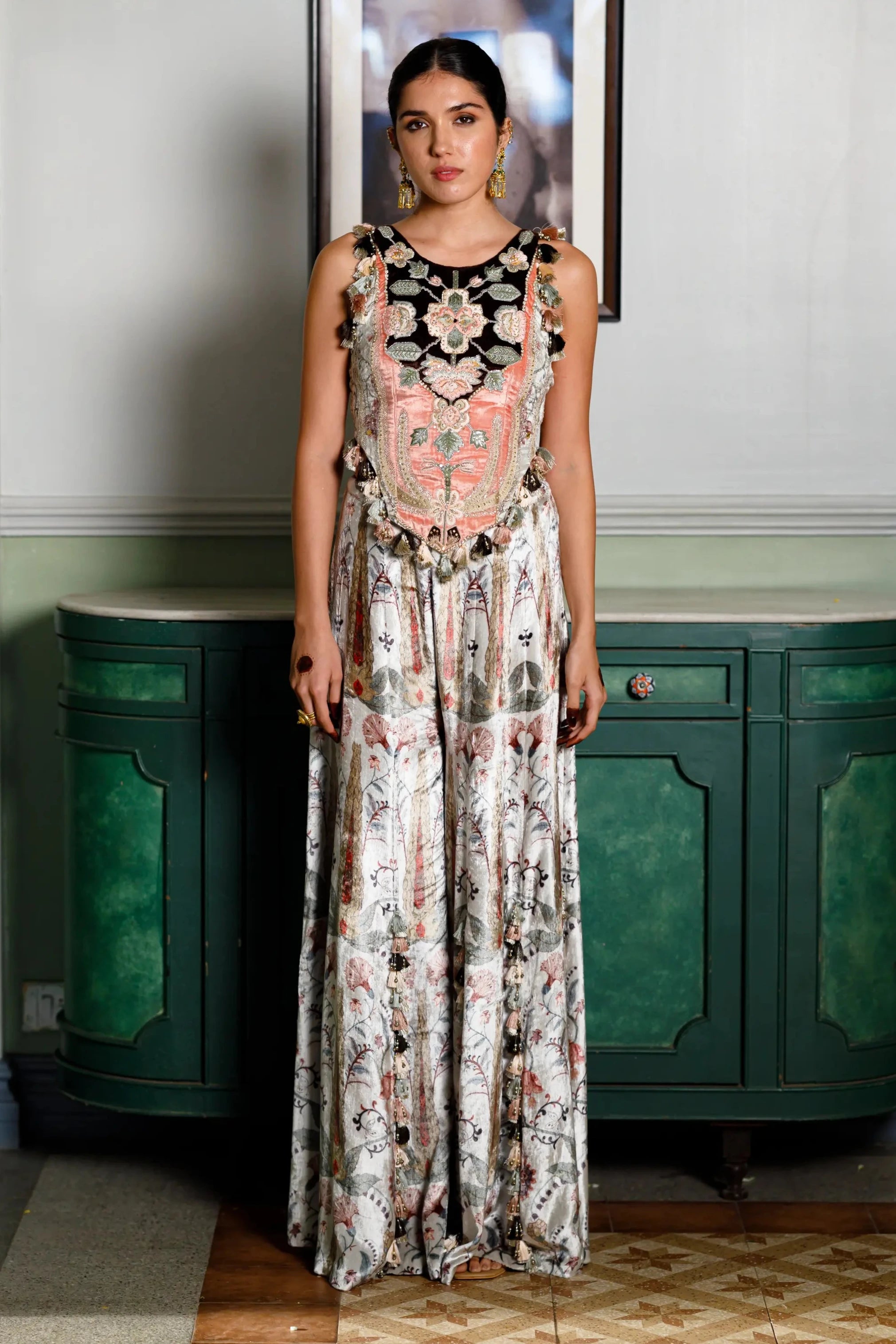 The Kainat Ochre Forest Whisper Printed Embroidered Back Tie-Up Choli paired with a flowing sharara creates a striking and modern ensemble. The embroidered back tie-up choli features intricate detailing, while the ochre forest whisper print adds a bold, earthy charm. Perfect for weddings, festivals, or special occasions, this set blends contemporary design with traditional craftsmanship for a unique, stylish look.