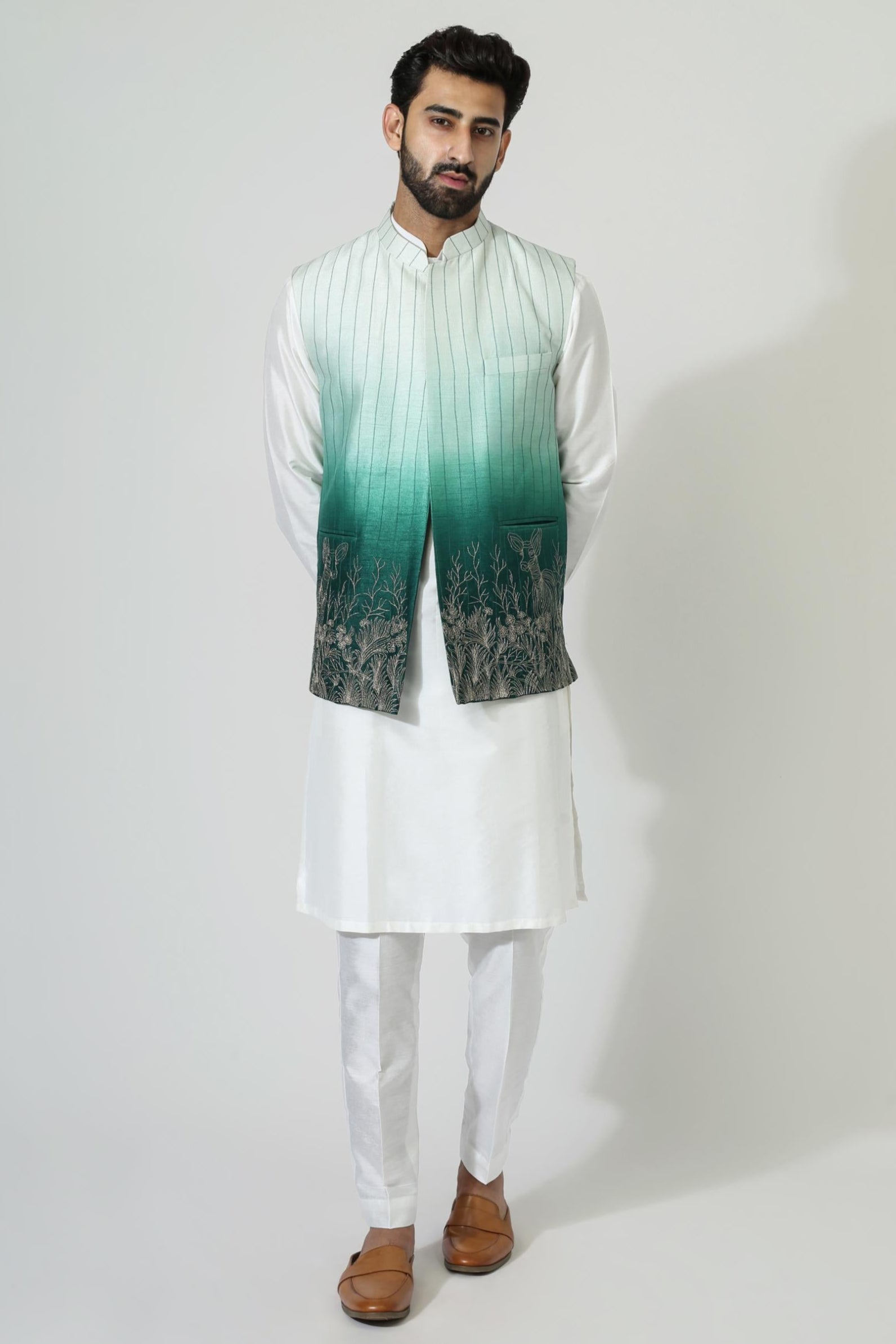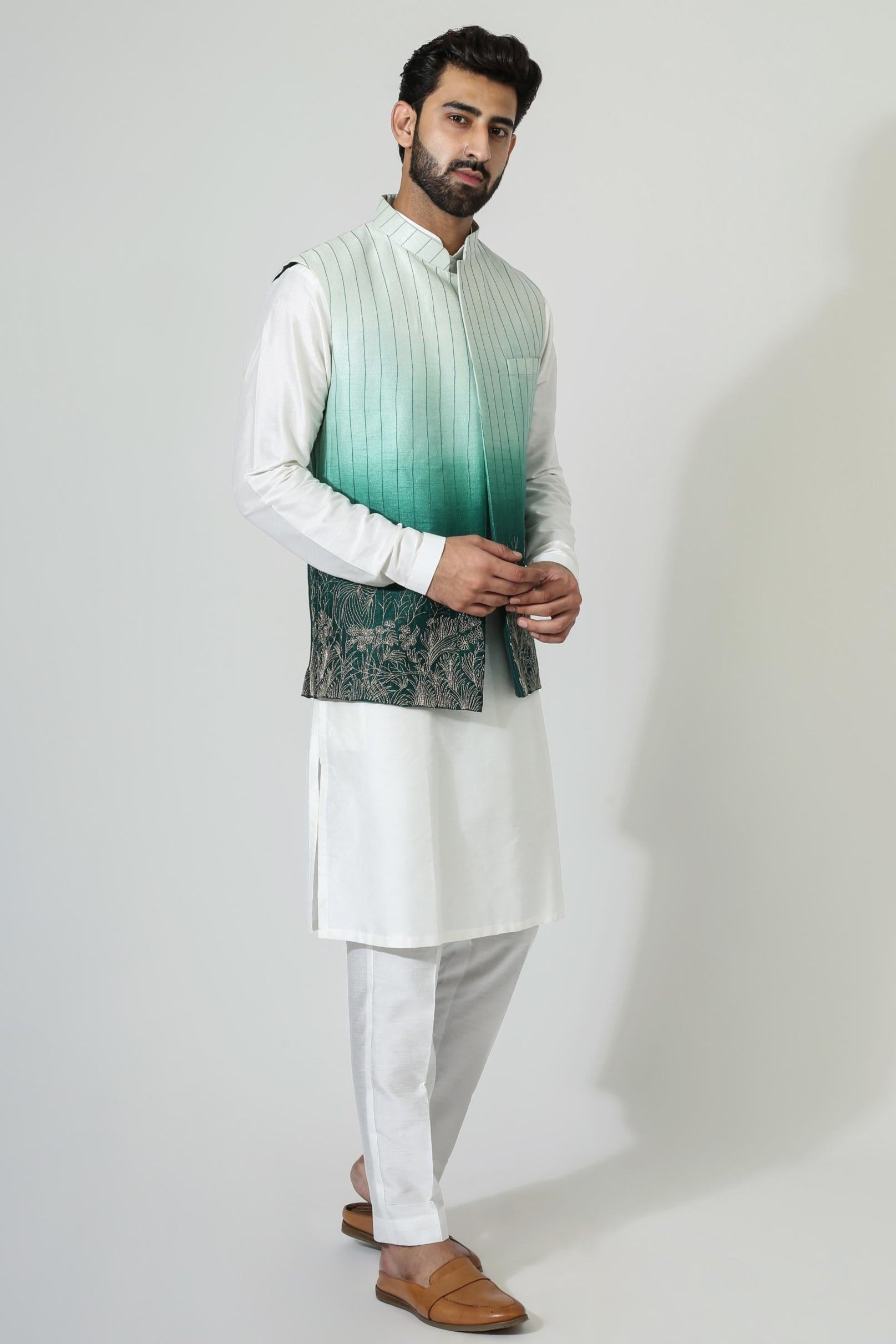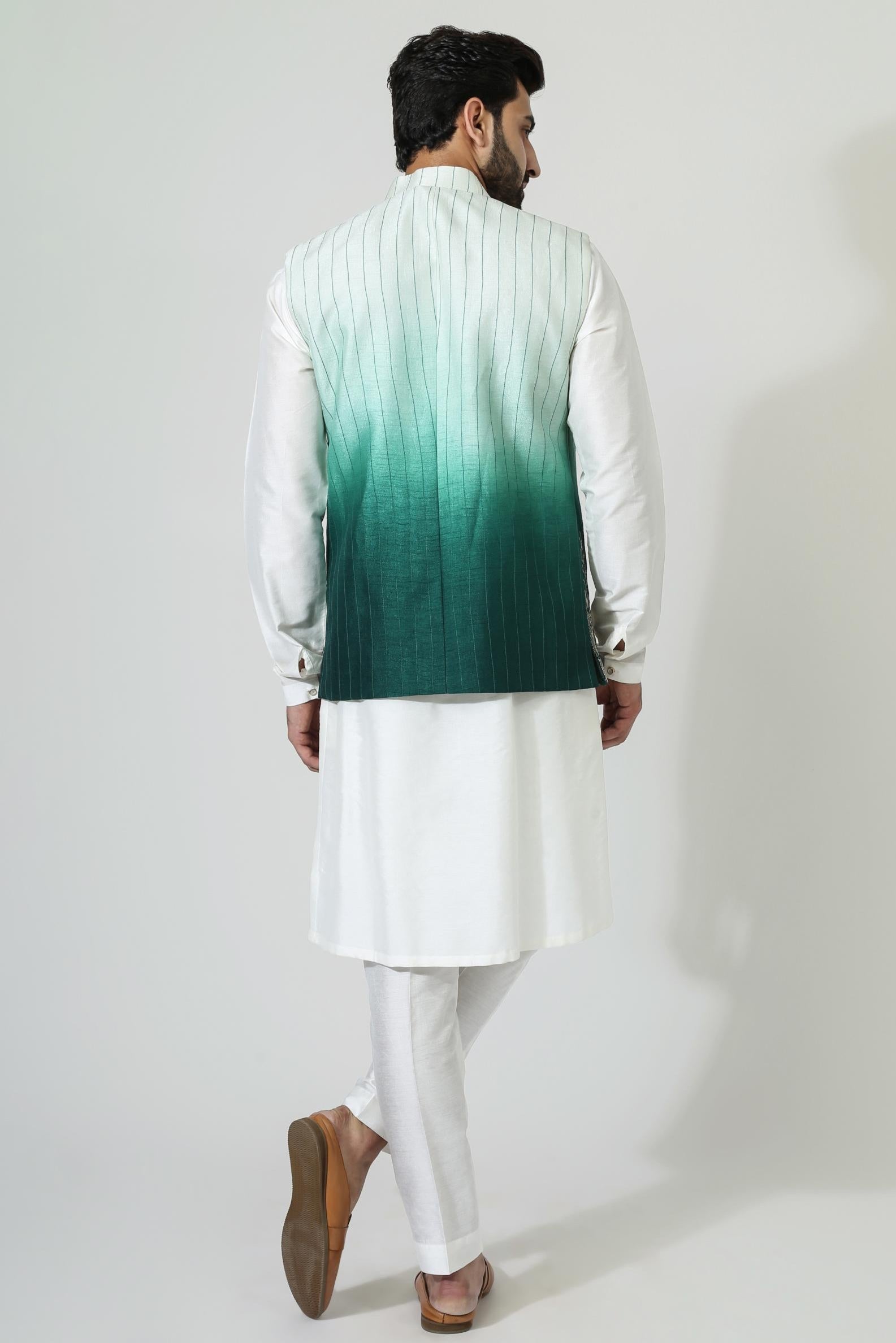 Elegant and understated, the White Ombre Nehru Jacket with Kurta and Pyjama offers a refined spin on classic festivewear. The Nehru jacket features a subtle ombre effect that adds visual depth and modern appeal, layered over a crisp white kurta and pyjama for a timeless silhouette. Ideal for day functions, festive celebrations, or intimate wedding events, this ensemble is crafted for the man who appreciates minimalist detail and contemporary sophistication with a cultural edge.