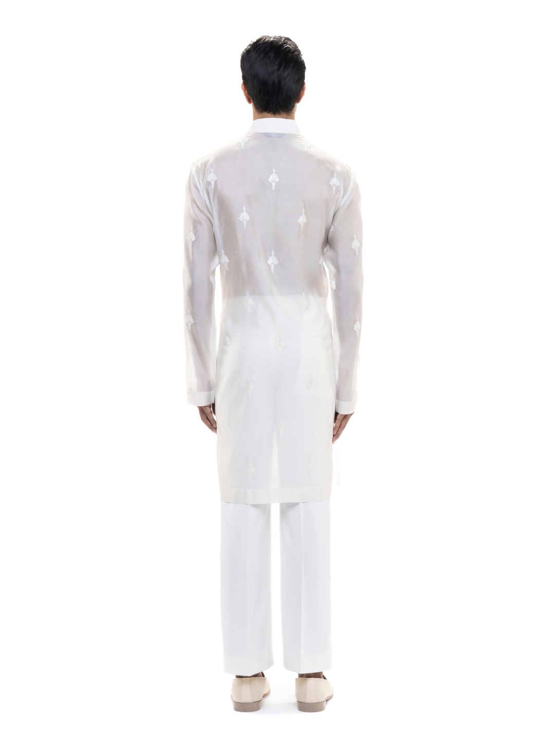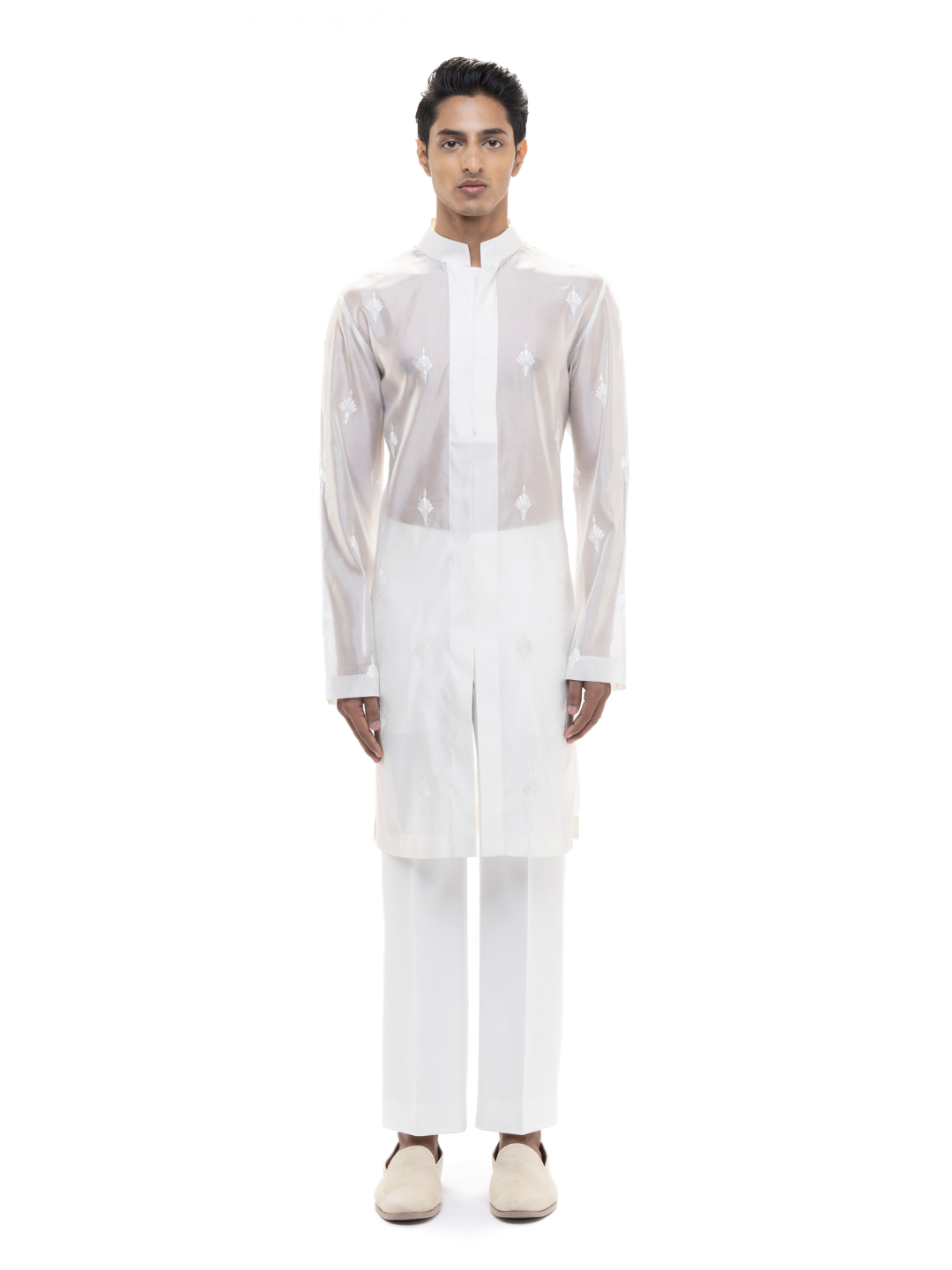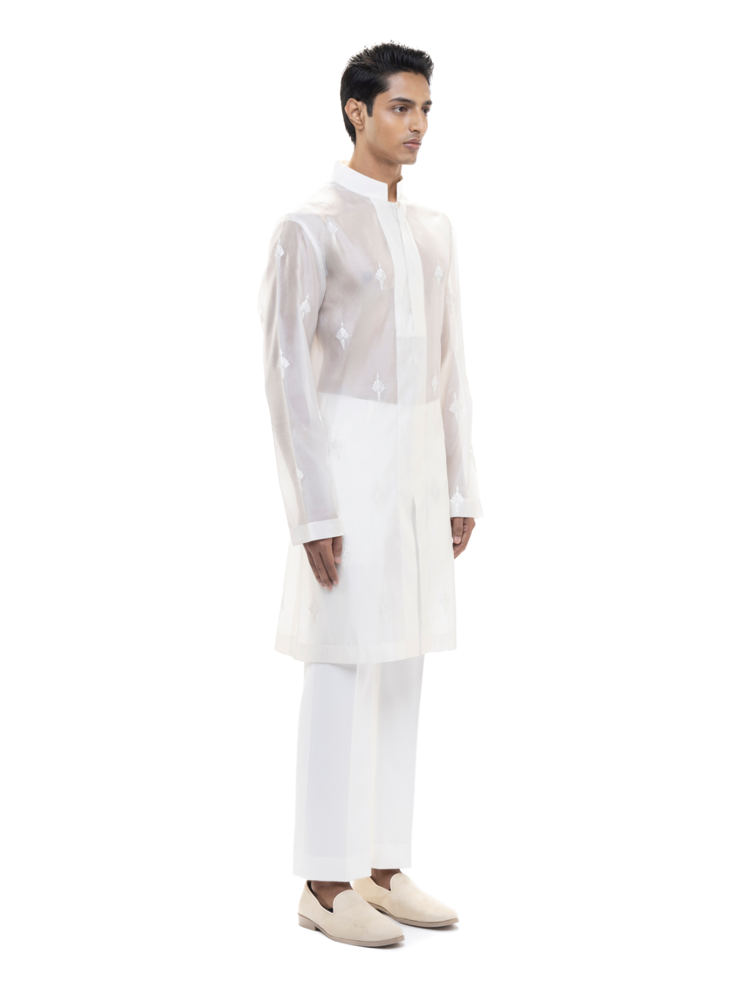 Delicate yet striking, this White Organza Translucent Kurta Set is a modern take on minimal elegance. Crafted from sheer organza, it features a translucent finish that adds a contemporary edge. Designed with a stand collar, concealed placket, and refined Mother of Pearl buttons, it maintains a clean silhouette with a straight hem and regular fit-perfect for fashion-forward festive looks or intimate celebrations.