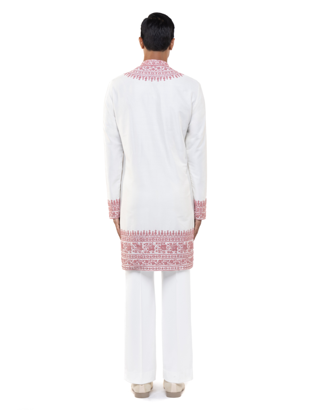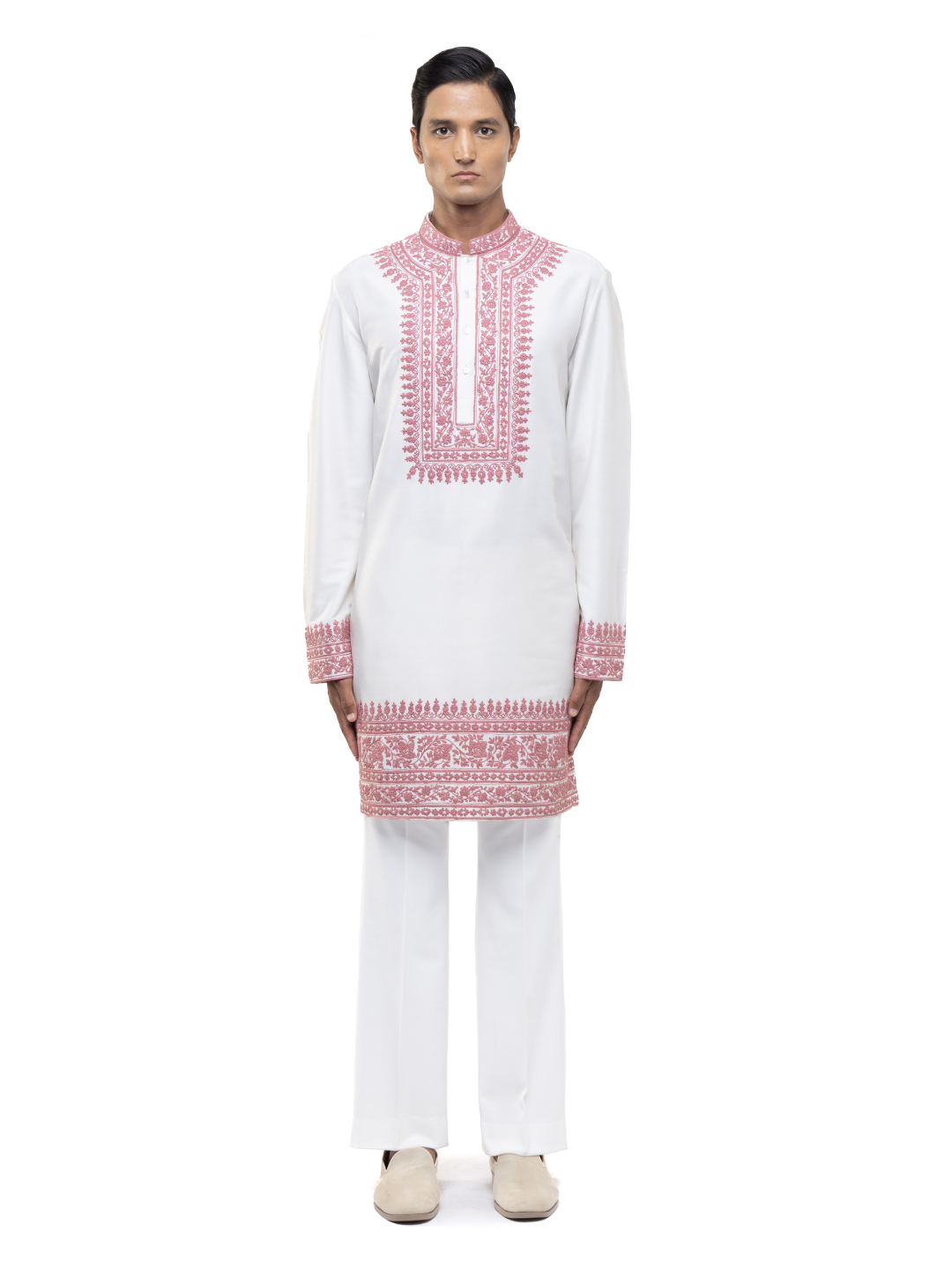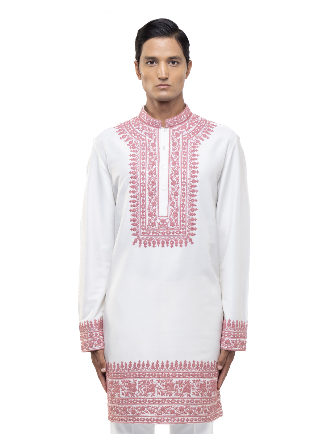 Delicate and vibrant, this White & Pink Dori Embroidery Kurta Set combines traditional craftsmanship with fresh colors. Crafted from smooth silk, it showcases intricate pink dori embroidery on a pristine white base, creating a beautiful contrast. The stand collar, concealed placket, and Mother of Pearl buttons enhance the elegant design. With a straight hem and regular fit, this set is perfect for festive celebrations, daytime events, or wedding ceremonies.
