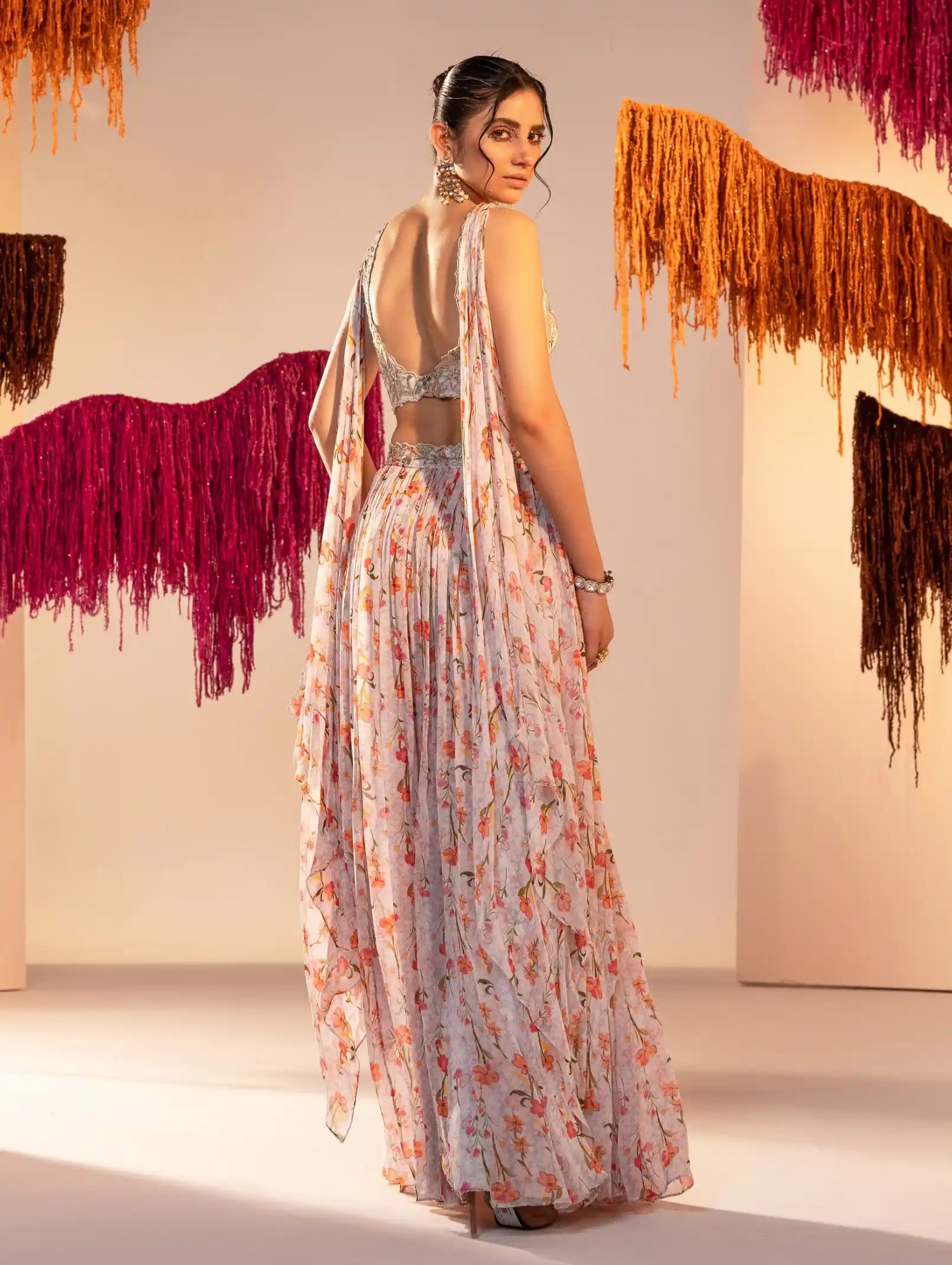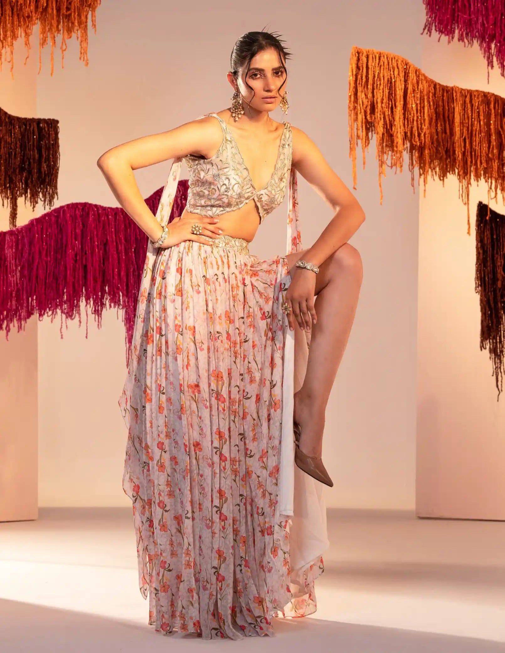 Step into elegance with our white v hem embroidered blouse featuring delicate drapes, paired with a stunning printed slit lehenga. This sophisticated ensemble blends intricate embroidery with contemporary flair, offering a flattering silhouette and a playful touch. Perfect for festive occasions or special events, it’s a beautiful choice that radiates style and grace!