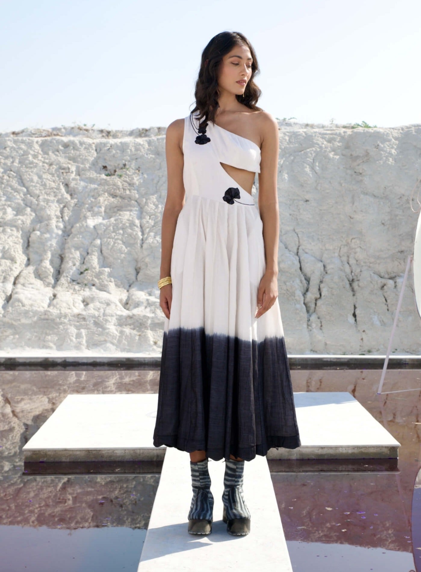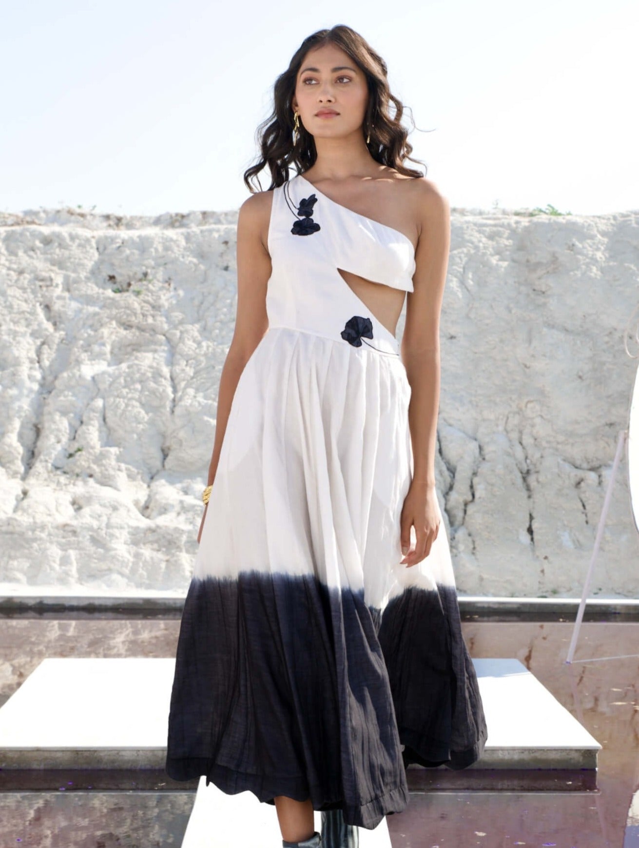Introducing our showstopper, the 'White Raven' dress. This striking one-shoulder bias cut gown features a daring cut-out detail at the waist and under the bust. Crafted from the softest handwoven chanderi silk, it showcases a mesmerizing ombre in pearl white and raven black. Intricately crafted peony flower stems adorn the waistline and shoulder, adding a touch of artistry and elegance. Complete with two practical side pockets and fine appliqued sea waves at the hem, this classic dress is designed to captivate and inspire.