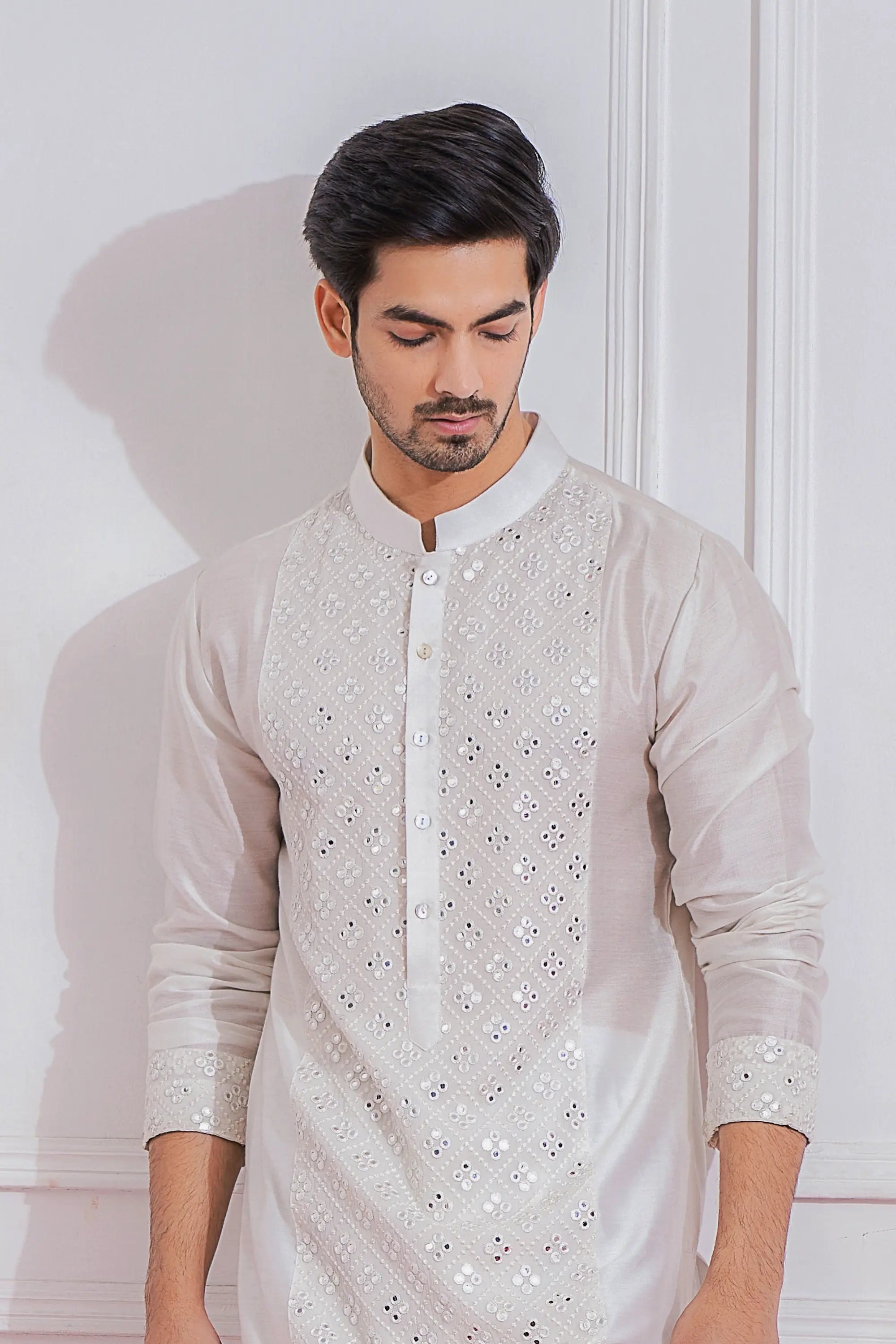 Introducing the White Sadiqabad Kurta Set, a timeless piece that embodies elegance and traditional charm. This expertly crafted ensemble features a beautifully tailored kurta made from high-quality fabric, ensuring comfort and sophistication for any occasion. The classic white hue symbolizes purity and grace, making it an ideal choice for weddings, festive celebrations, and formal gatherings.