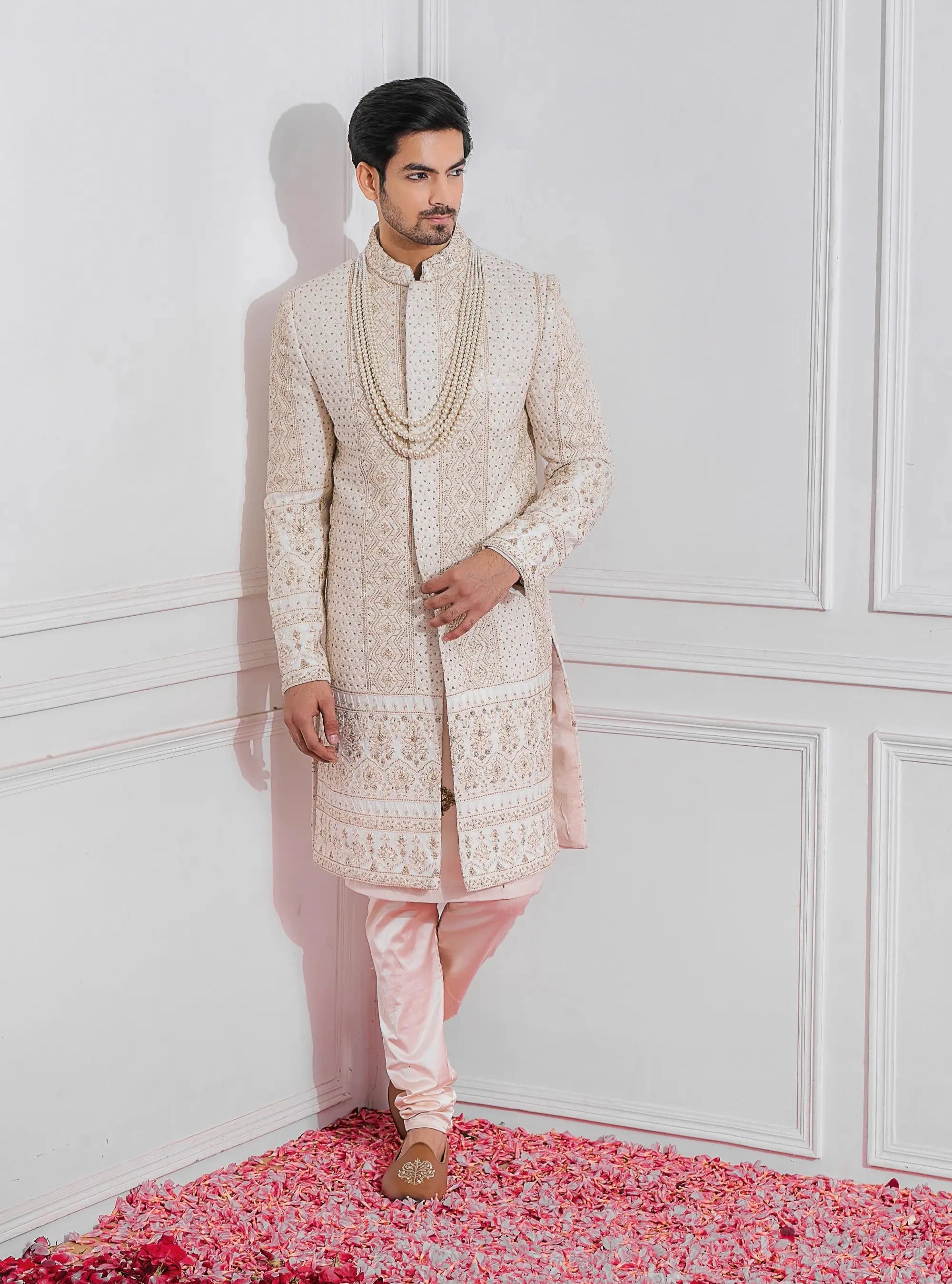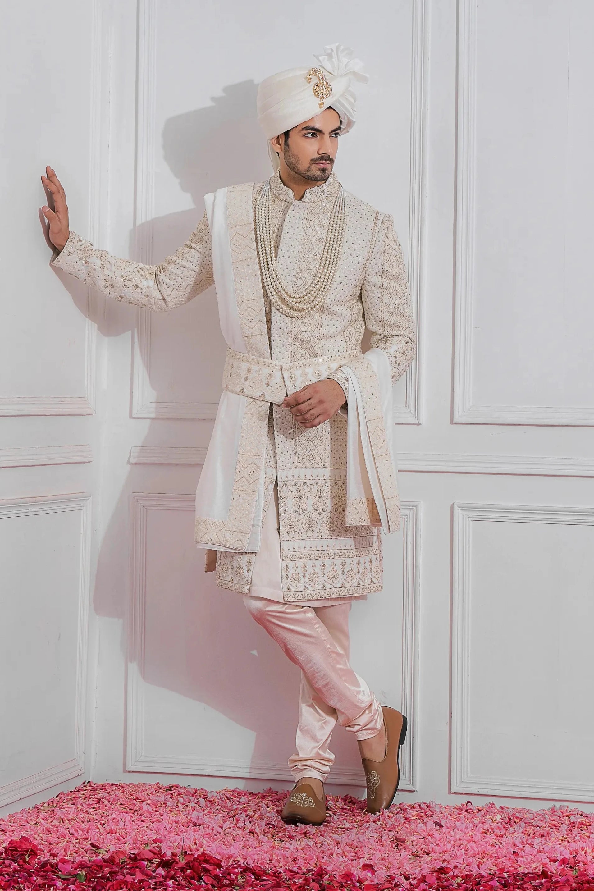 Components: 7 pieces (Sherwani, Kurta, Churidar, Kamarbandh, Stole, Safaa fabric and Shoes)
