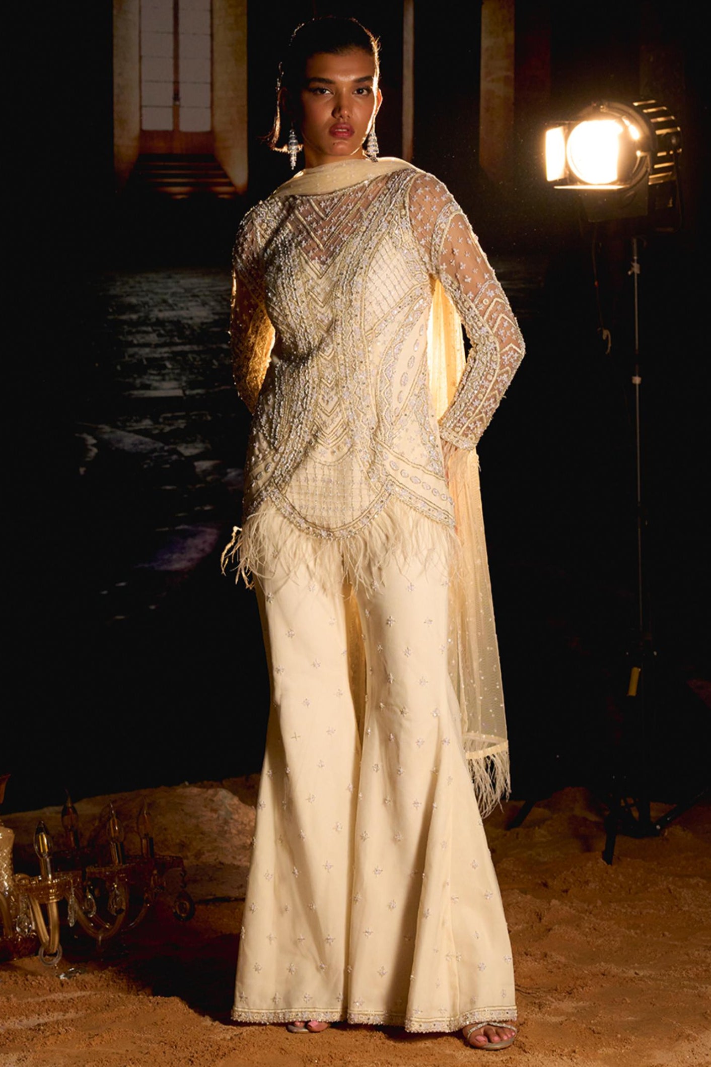 Embrace timeless elegance with this ivory white set featuring tonal embroidery on the kurta and flared palazzos. Paired with a delicate net embroidered dupatta, this ensemble is perfect for weddings, festive occasions, or daytime celebrations. Sophisticated and graceful, itÕs designed to leave a lasting impression.