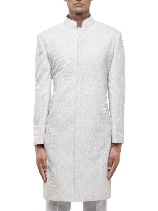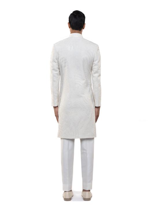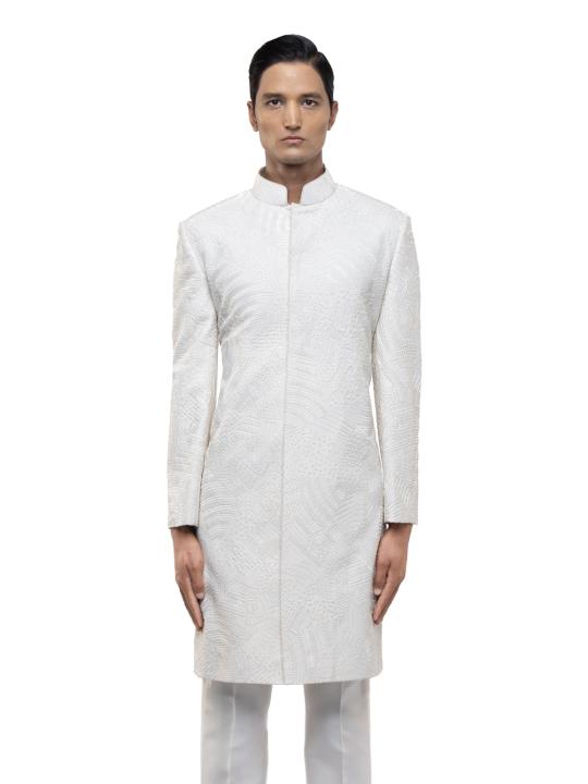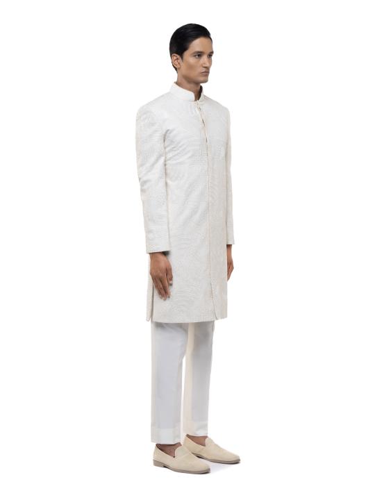 Sleek and contemporary, this White Silk Sequin Embroidered Modern Sherwani Set shines with subtle sequin detailing that adds a refined sparkle. Crafted from luxurious silk, it features a stand collar, concealed placket, and elegant Mother of Pearl buttons. The regular fit and straight hem offer a polished, comfortable silhouette-perfect for weddings, receptions, and stylish celebrations with a modern edge.