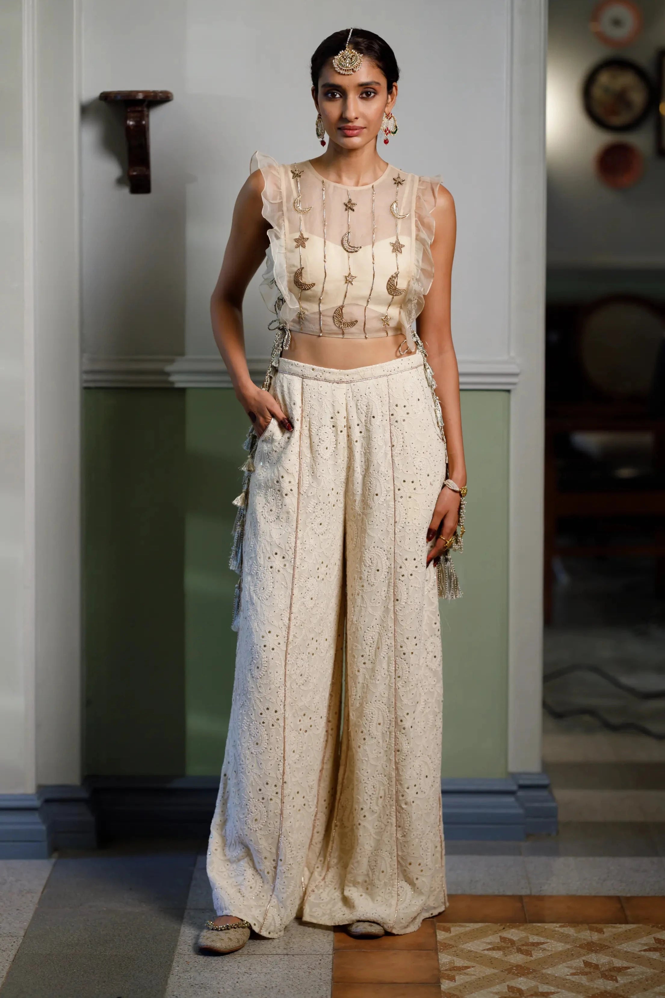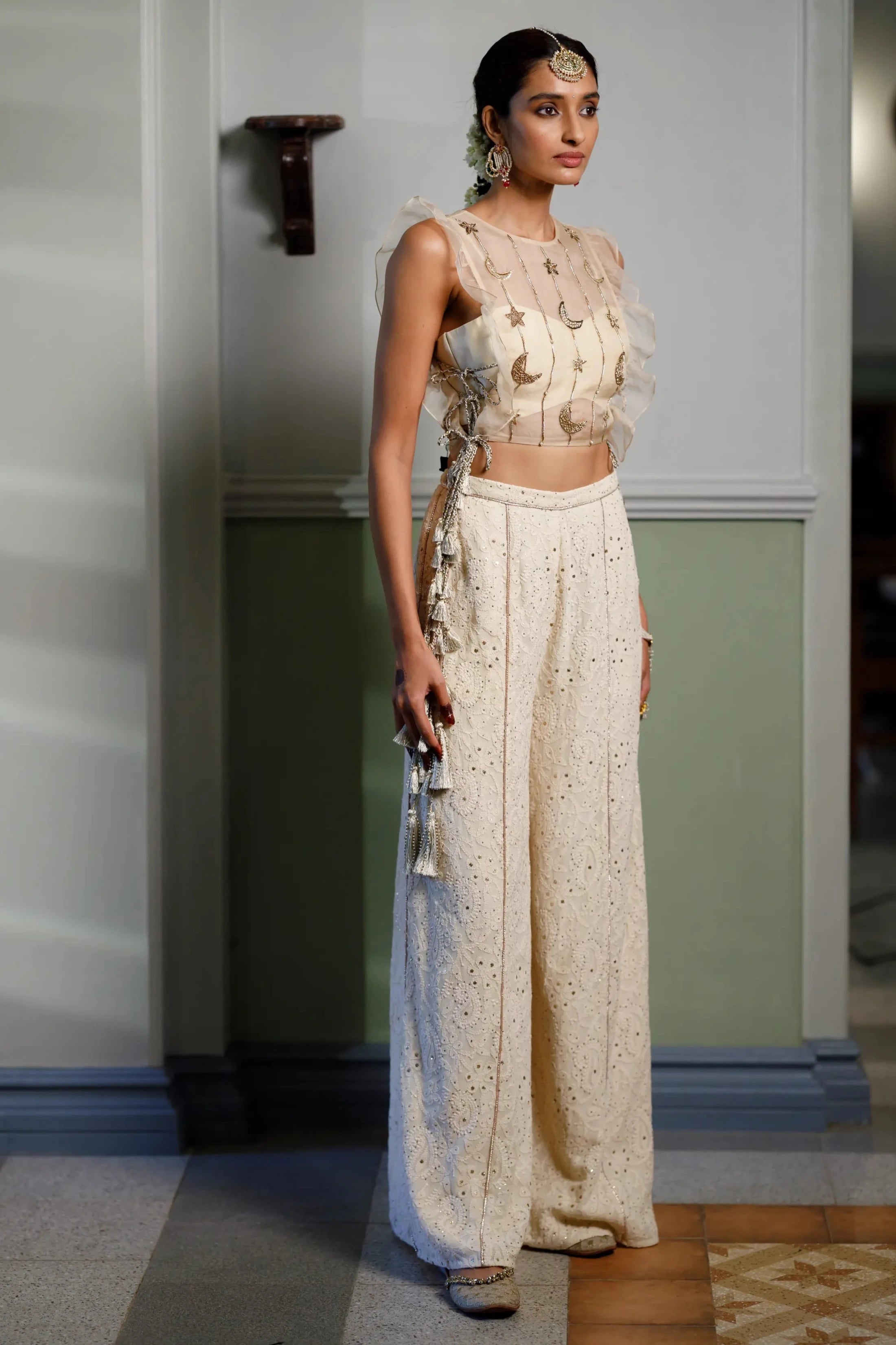 Beige stone embroidered bib with ruffle and side tie-up bustier with pant