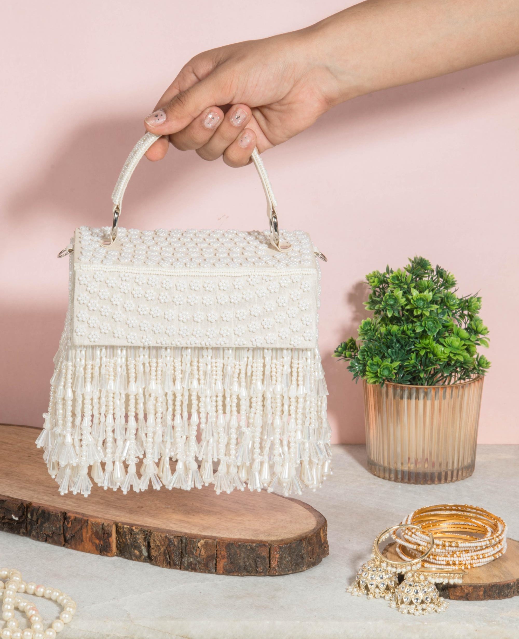 The White The Apsara Clutch is a graceful accessory that embodies elegance and sophistication. Crafted in a pristine white shade with intricate detailing, this clutch is perfect for weddings, festive occasions, and formal events. Its sleek design and refined craftsmanship make it an ideal choice for those who appreciate timeless beauty with a modern touch.
