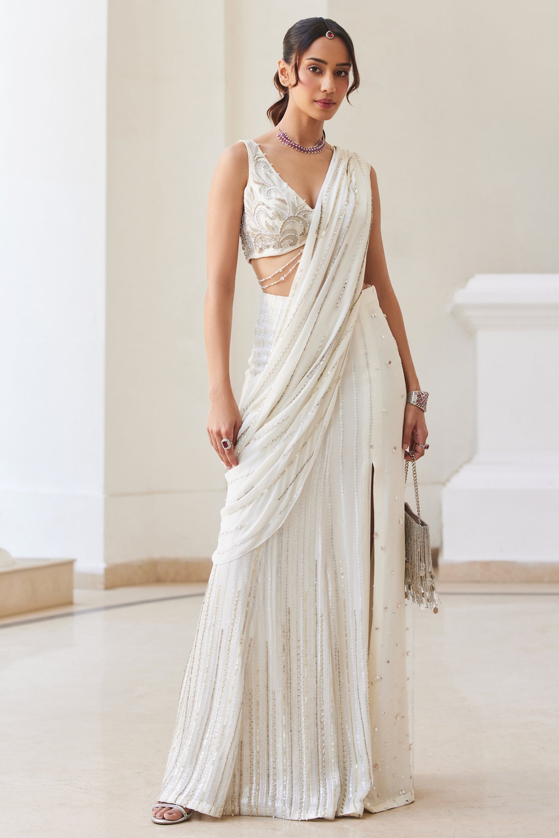 The White Twin Flames Slit Saree Set redefines traditional elegance with a contemporary twist. Featuring a crisp white saree with a stylish slit and intricate detailing, paired with a coordinating blouse, this ensemble offers both grace and ease of movement. Perfect for weddings, festive events, or evening soirees, it combines classic charm with modern sophistication. A bold and elegant choice for those who love timeless style with a fashionable edge.