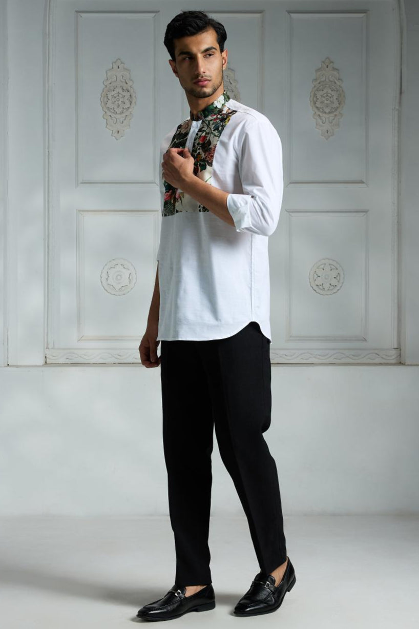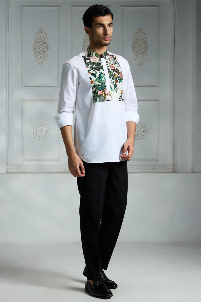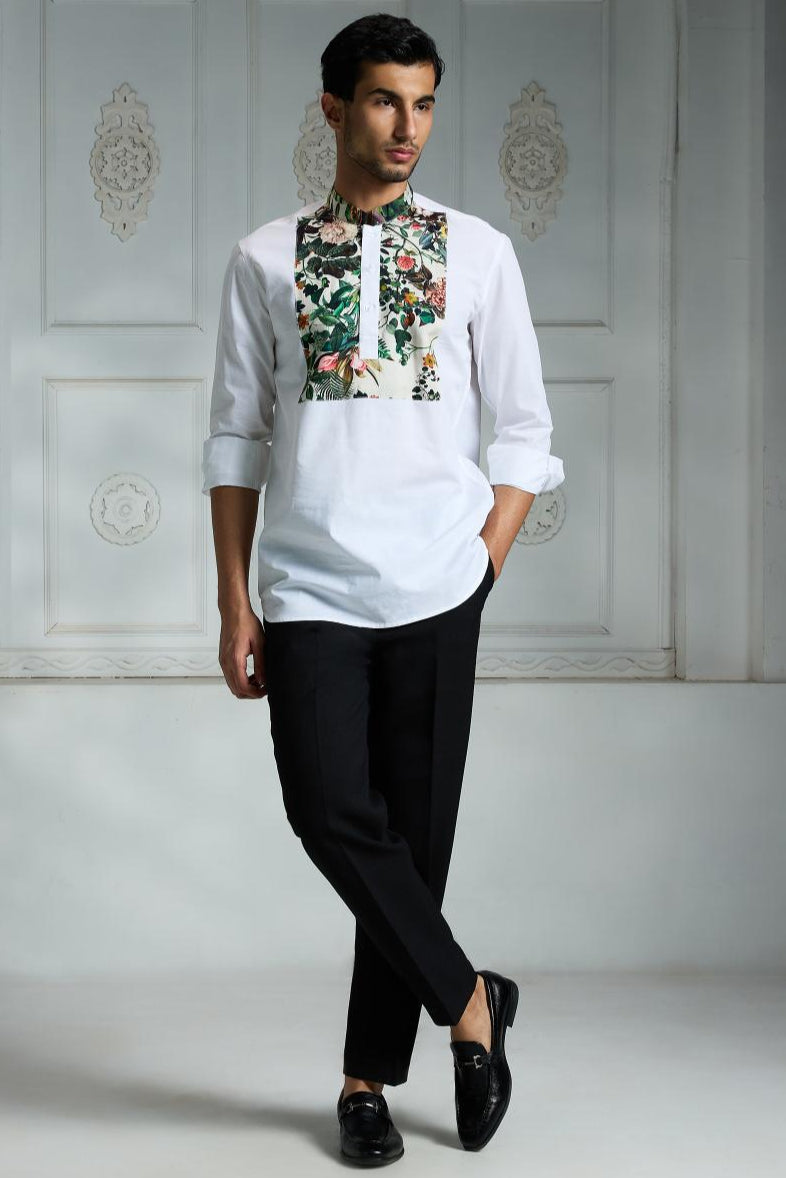 This white long-sleeved shirt features a unique floral and foliage pattern beautifully printed on the front yoke and collar, adding an elegant touch to a classic design. Made from soft, breathable fabric, it includes a buttoned placket with three white buttons down the front for a clean, polished look. Ideal for both formal and casual occasions, this shirt pairs perfectly with fitted trousers to create a sleek and sophisticated silhouette that stands out effortlessly.
