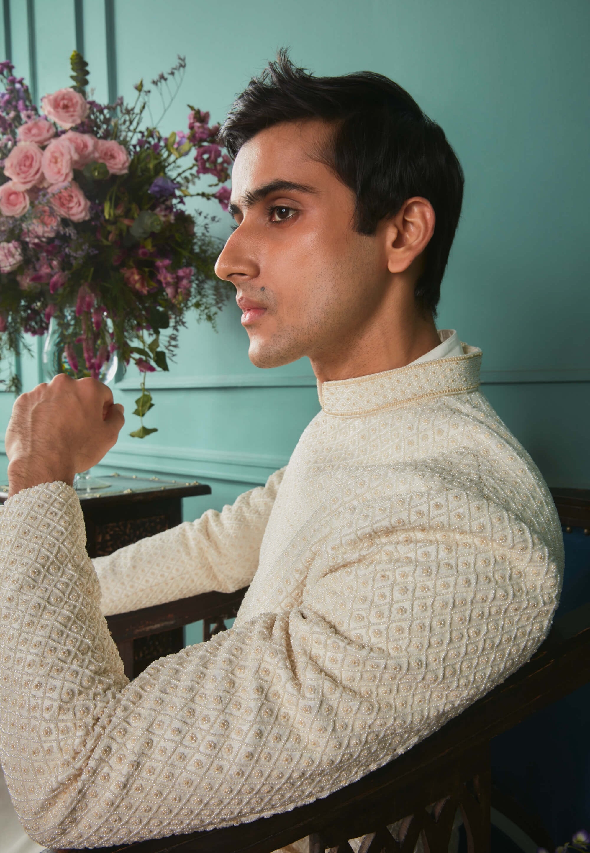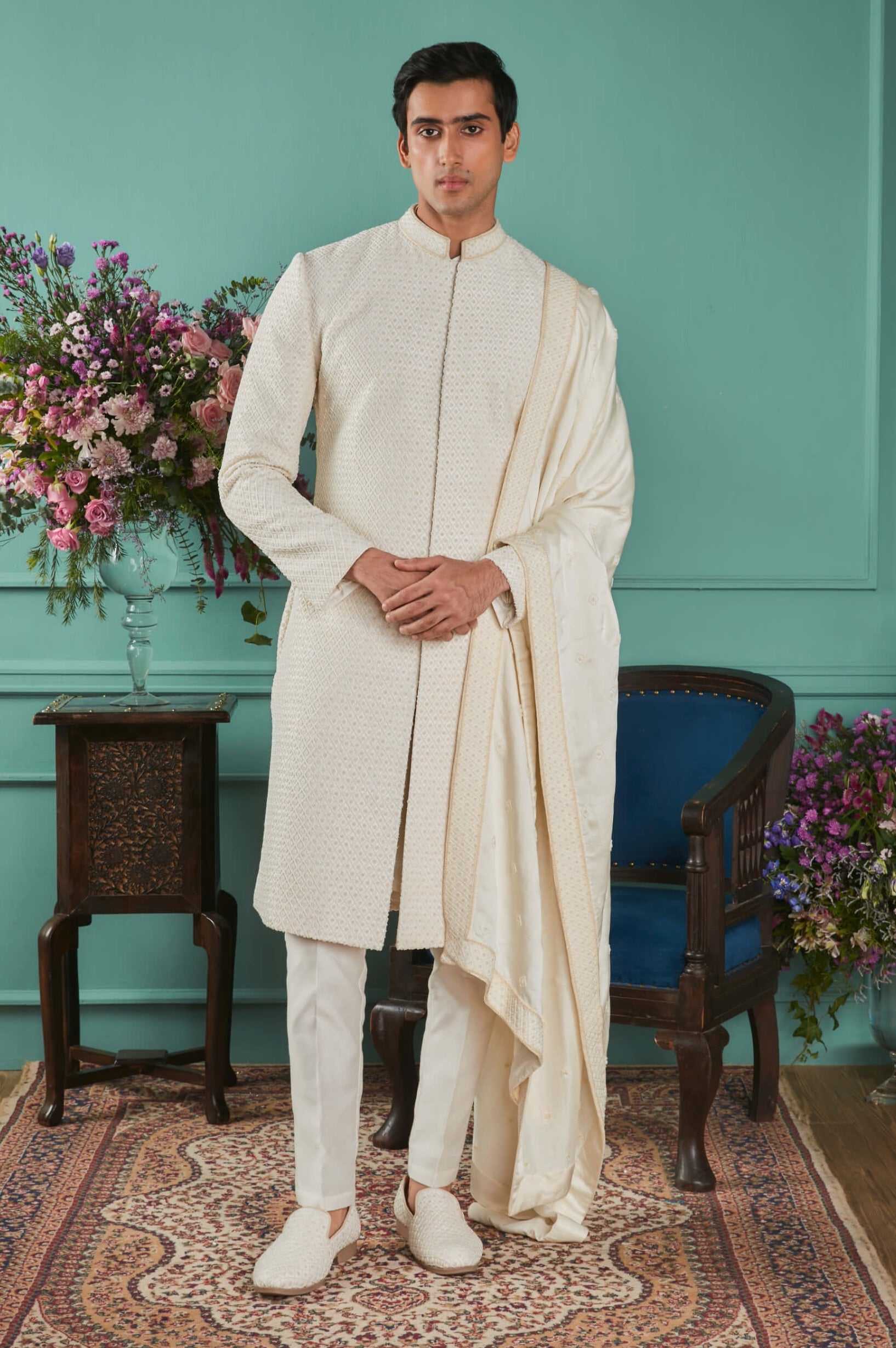 This exquisite sherwani set in silk is designed for men who want to make a memorable statement. Crafted from luxurious lucknowi fabric the sherwani features elegant french knots and ivory bead embroidery throughout. The ensemble includes a refined kurta and pants in chanderi a sophisticated linen satin dupatta and matching shoes. Perfect for weddings this set combines traditional craftsmanship with contemporary style for a truly sophisticated look.