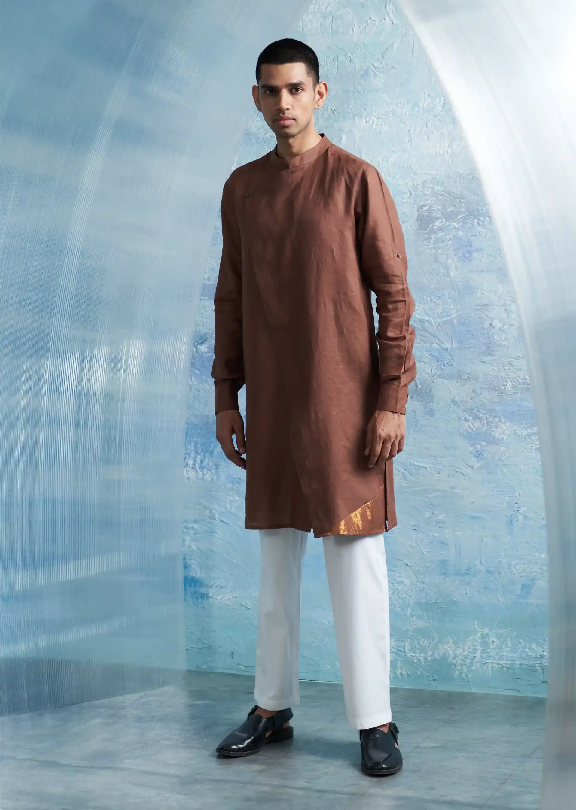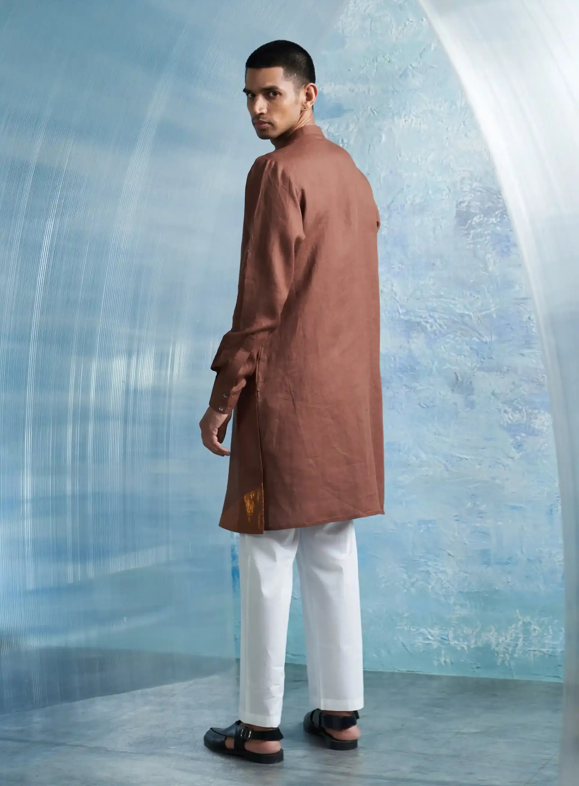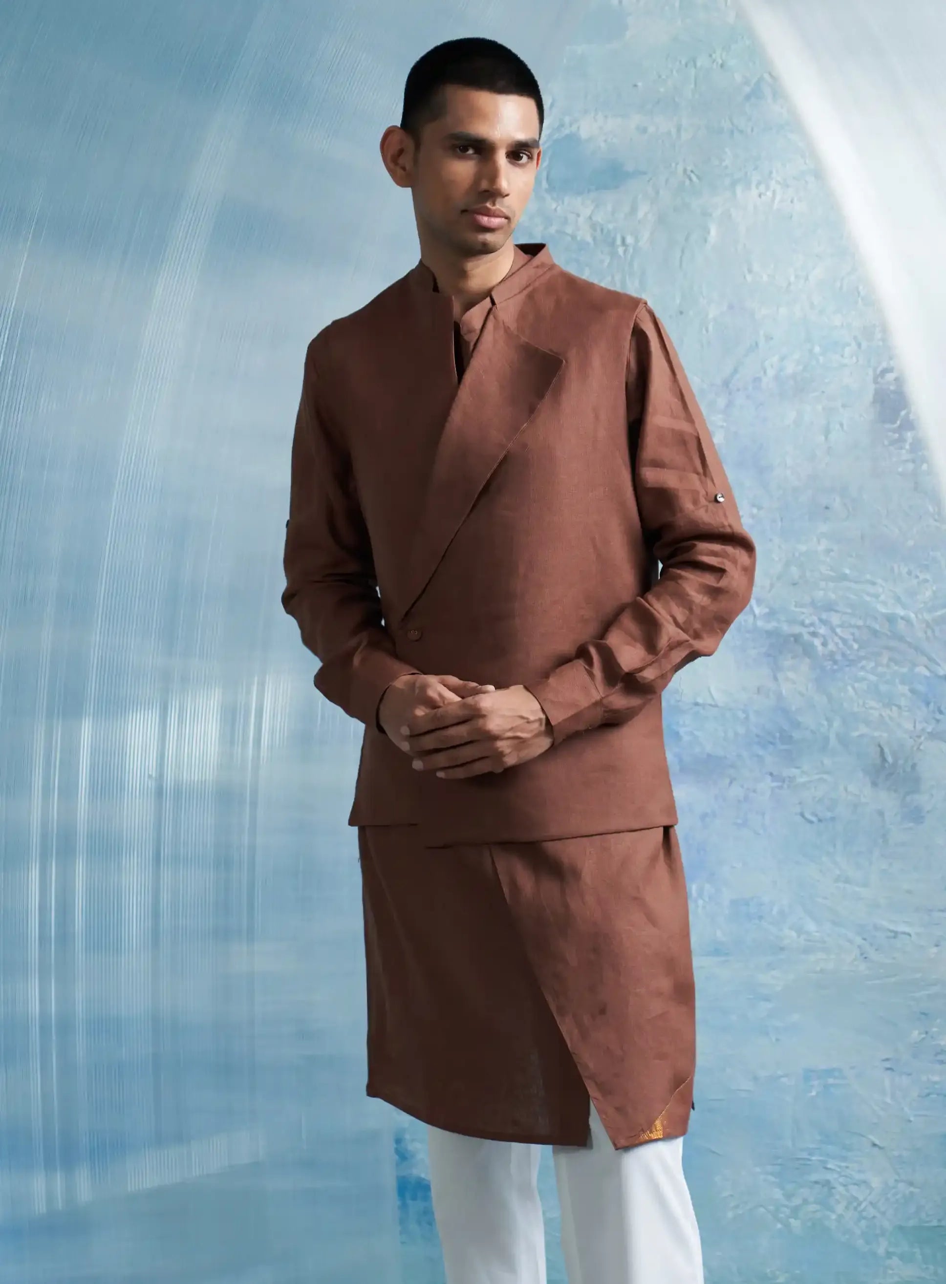 Step into elegance with our meticulously crafted 3-piece ensemble, featuring a statement woody brown linen kurta and jacket designed to turn heads. Adorned with a full-front placket and a mandarin collar, this kurta exudes timeless charm with a contemporary twist. Artfully placed shimmer, highlighted by a flap, adds a touch of allure and uniqueness to the design. Paired with comfortable cotton pants and a uniquely cut overlap jacket, this ensemble is perfect for any occasion. Elevate your style effortlessly with this stunning combination that balances sophistication and modern flair.