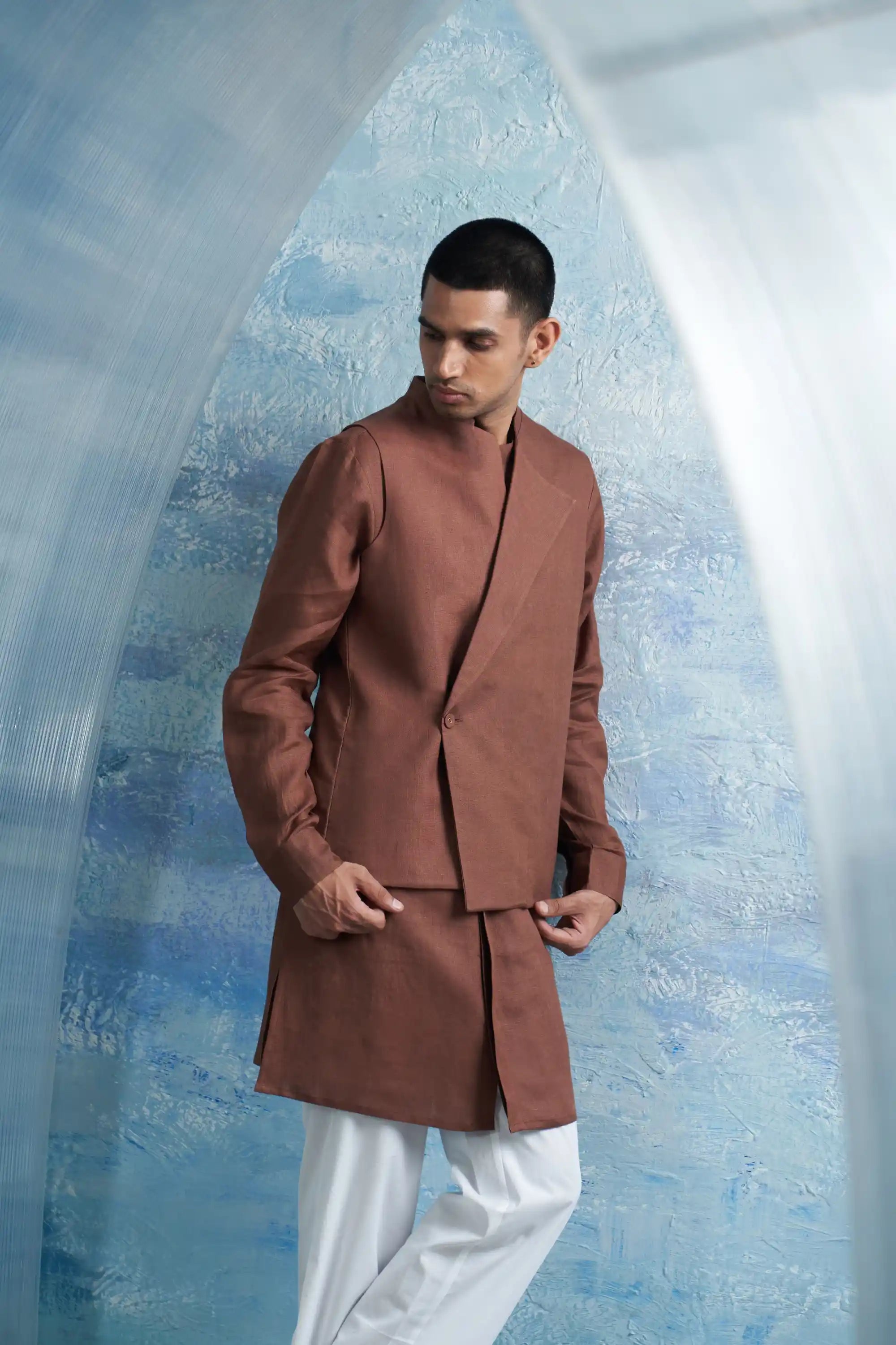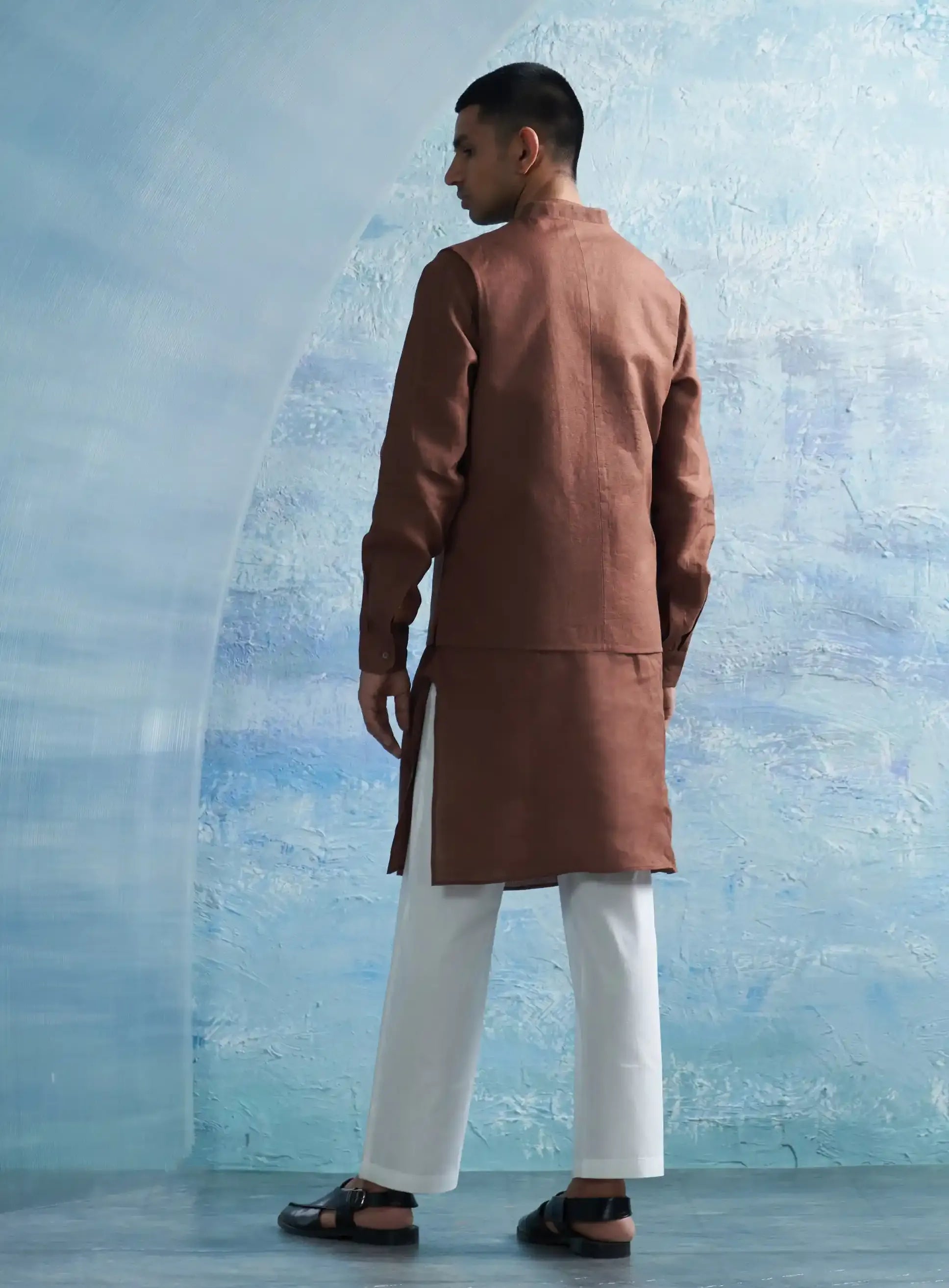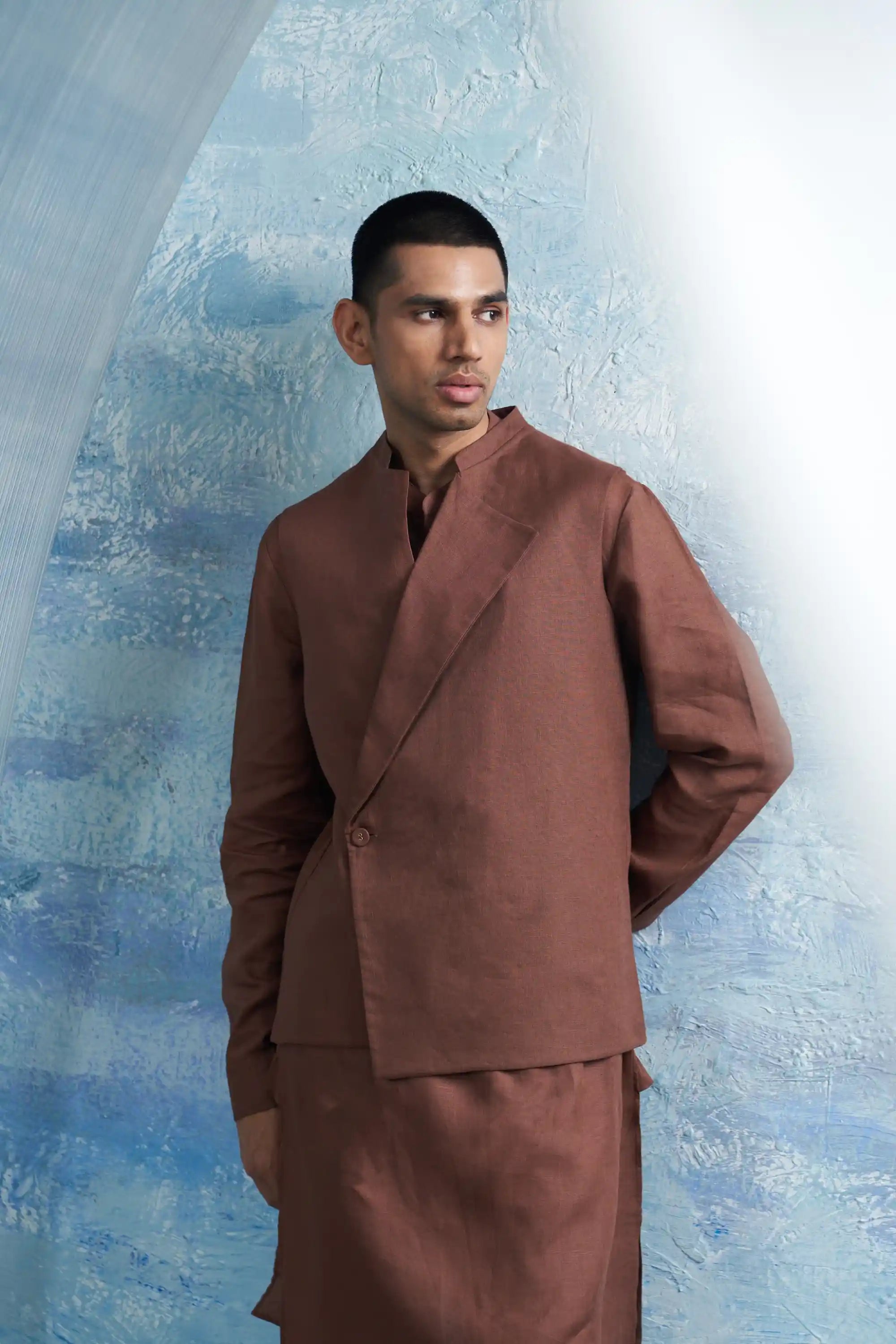 Introducing a statement ensemble featuring a straight kurta and jacket in standout woody brown linen—a distinguished addition to your wardrobe. This exceptional kurta boasts subtle touches of shimmer on the placket and cuffs, enhancing its elegant design. Paired with comfortable cotton pants and an overlap jacket, this ensemble creates a power-packed look that exudes confidence and style. Perfect for any occasion, this versatile set effortlessly combines sophistication with modern flair, making it a must-have for your collection.