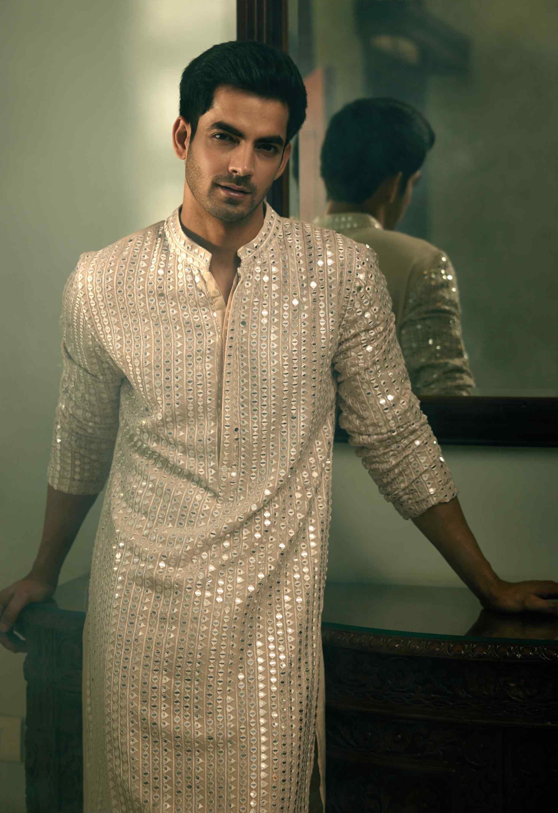 Experience refined elegance with our bespoke kurta set, crafted from luxurious cotton silk and airy georgette in a sophisticated soft beige shade. This exquisite ensemble features intricate mirror work and detailed machine embroidery on the front and sleeves, adding a touch of opulent artistry. Ideal for outdoor events, this kurta set is a standout choice for the modern groom or groomsmen seeking a blend of traditional charm and contemporary style. The set is complemented by an ivory classic salwar, offering a harmonious contrast that enhances the overall look. Embrace a perfect balance of grace and modernity with this stunning outfit, designed to make your special occasion unforgettable.