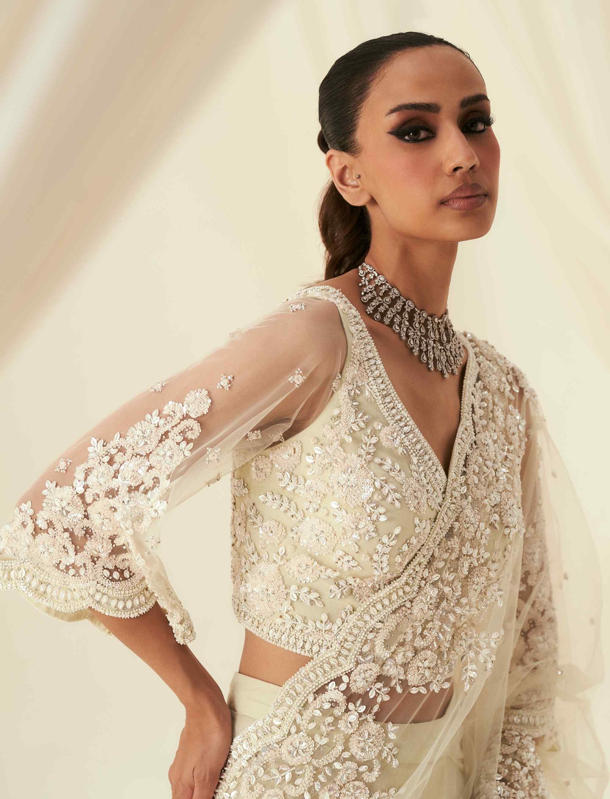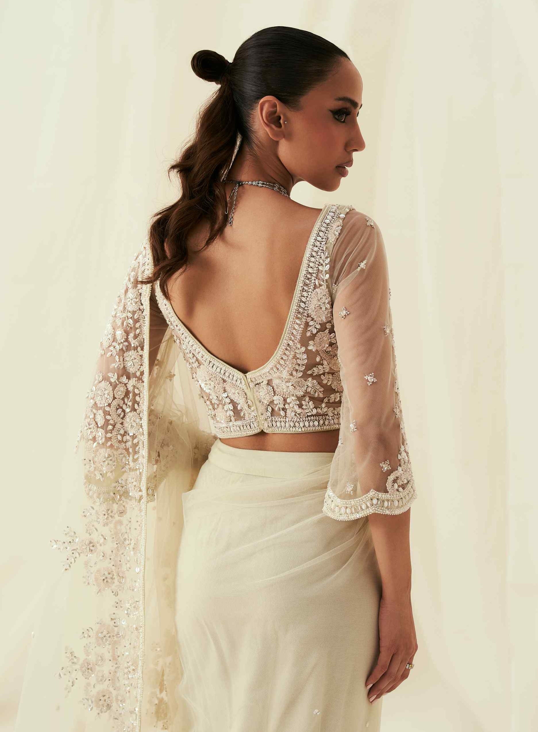 Indulge in the allure of our pre-draped saree, crafted from delicate butterfly net and adorned with intricate embroidery that exudes timeless elegance. This stunning saree features a sophisticated arrangement of sequins, pearls, and cutdana, meticulously embellished to create a mesmerizing pattern that catches the light beautifully.