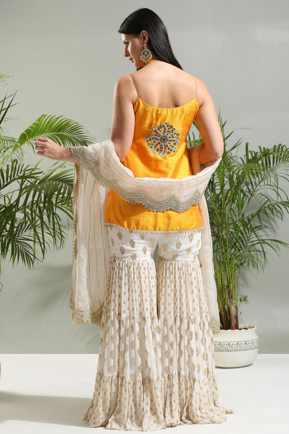 Yellow raw silk mirror work skip kurta with ivory butti georgette sharara and ivory organza dupatta