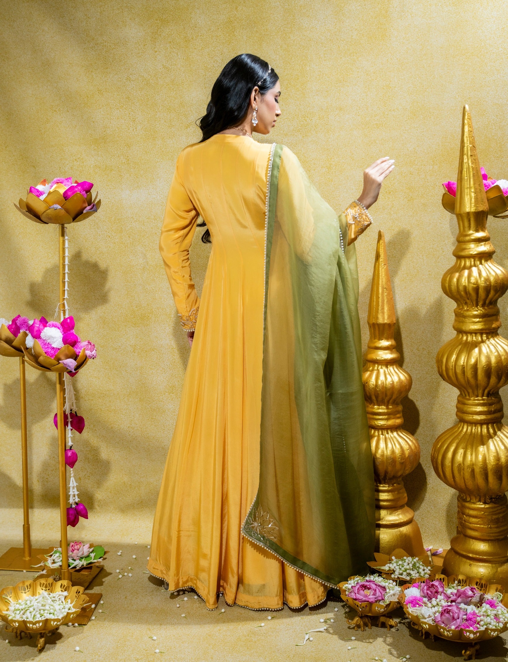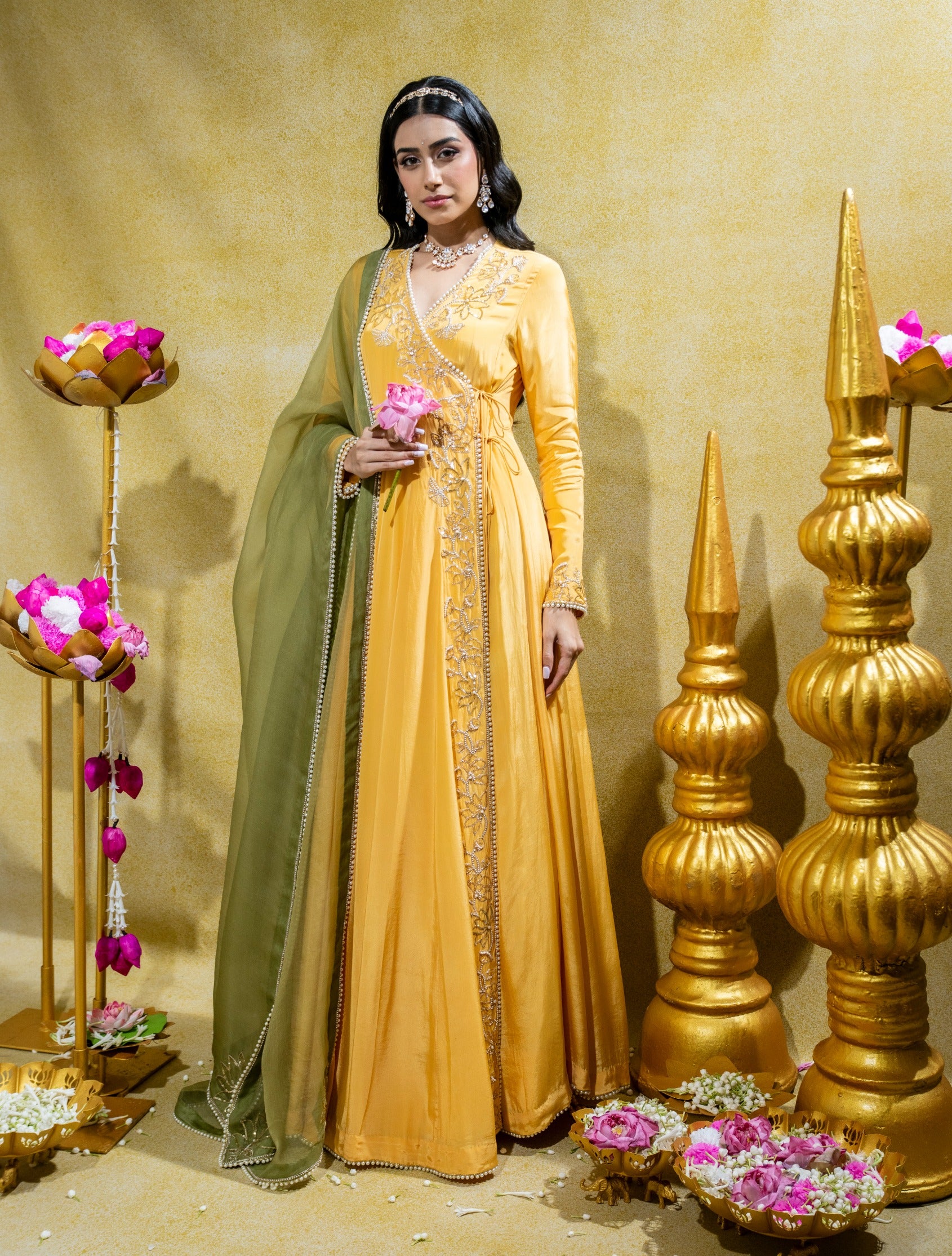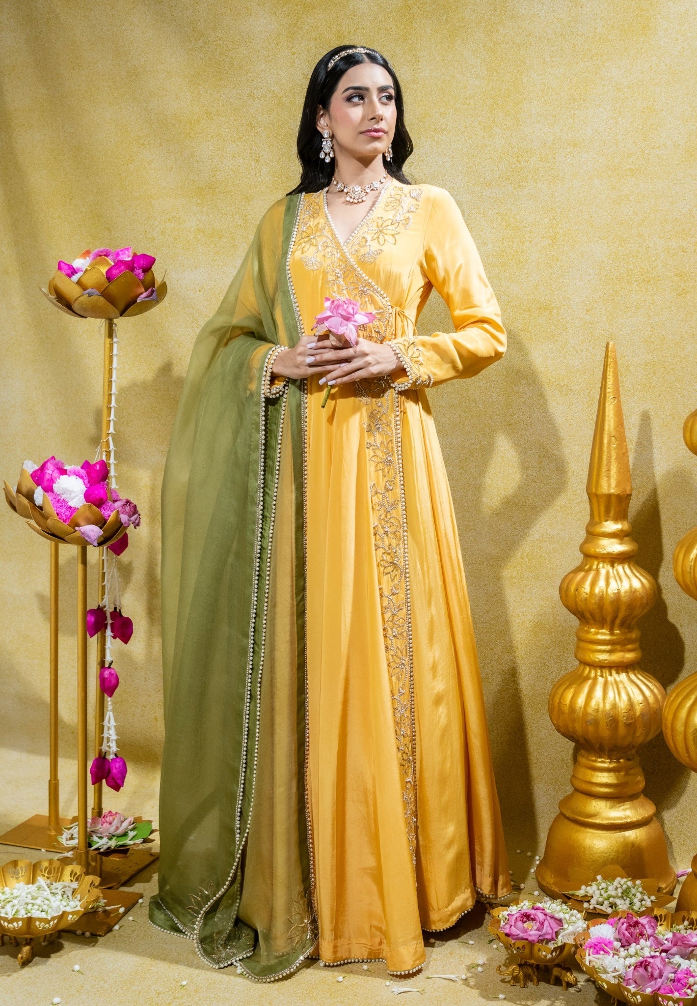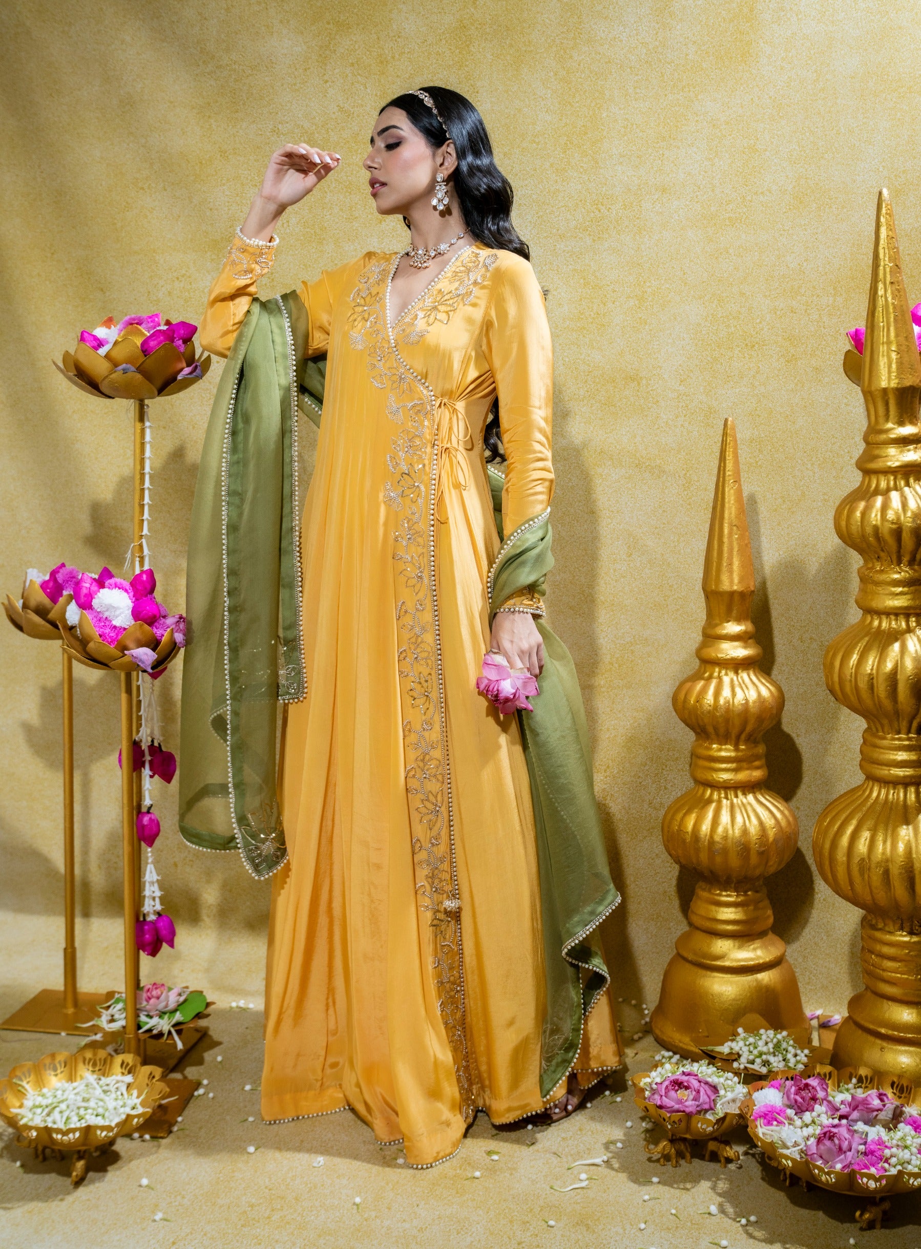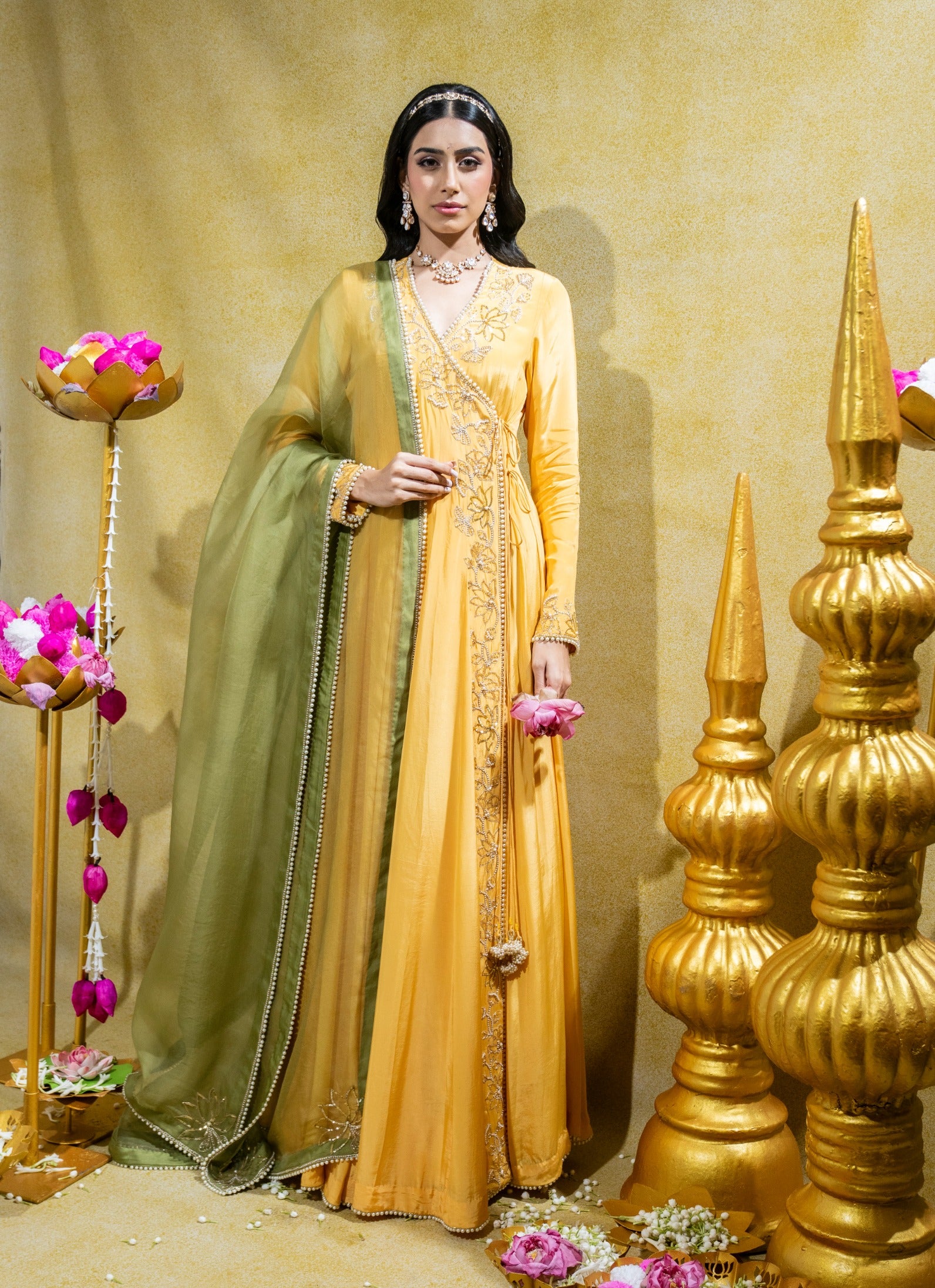 Experience unparalleled elegance with our crepe embroidered multipaneled angarkha, beautifully paired with a luxurious silk organza dupatta. The angarkha, crafted from high-quality crepe, features an intricate embroidery design that adds a touch of sophistication to its multipaneled silhouette. This traditional garment is complemented by a delicate silk organza dupatta, which provides an ethereal, flowing quality that enhances the overall grace of the ensemble. Ideal for festive celebrations or formal events, this outfit effortlessly merges classic elegance with contemporary flair, making it a standout choice for any special occasion.