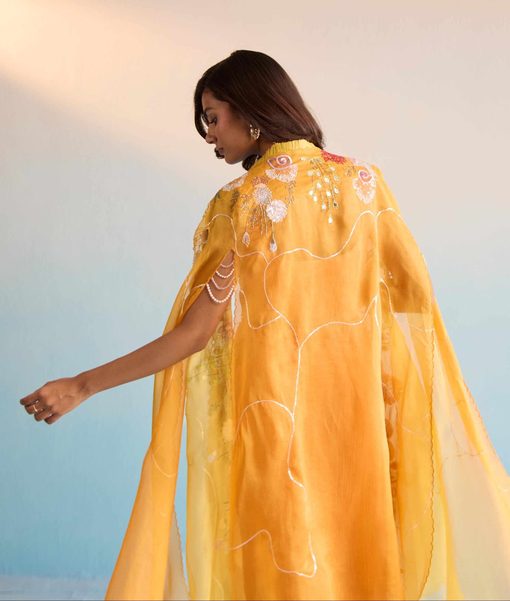 Sunlit and striking, the Yellow Bahaar Orania Cape with Skirt brings together radiant color and contemporary elegance. The ensemble features a beautifully embroidered blouse, a flowing skirt, and a sheer, lightweight cape that adds graceful movement to the look. Crafted in a joyful yellow hue, it's perfect for haldi celebrations, destination weddings, or festive brunches. The Yellow Bahaar Orania Cape with Skirt is designed for the woman who celebrates tradition with a vibrant, modern spirit.