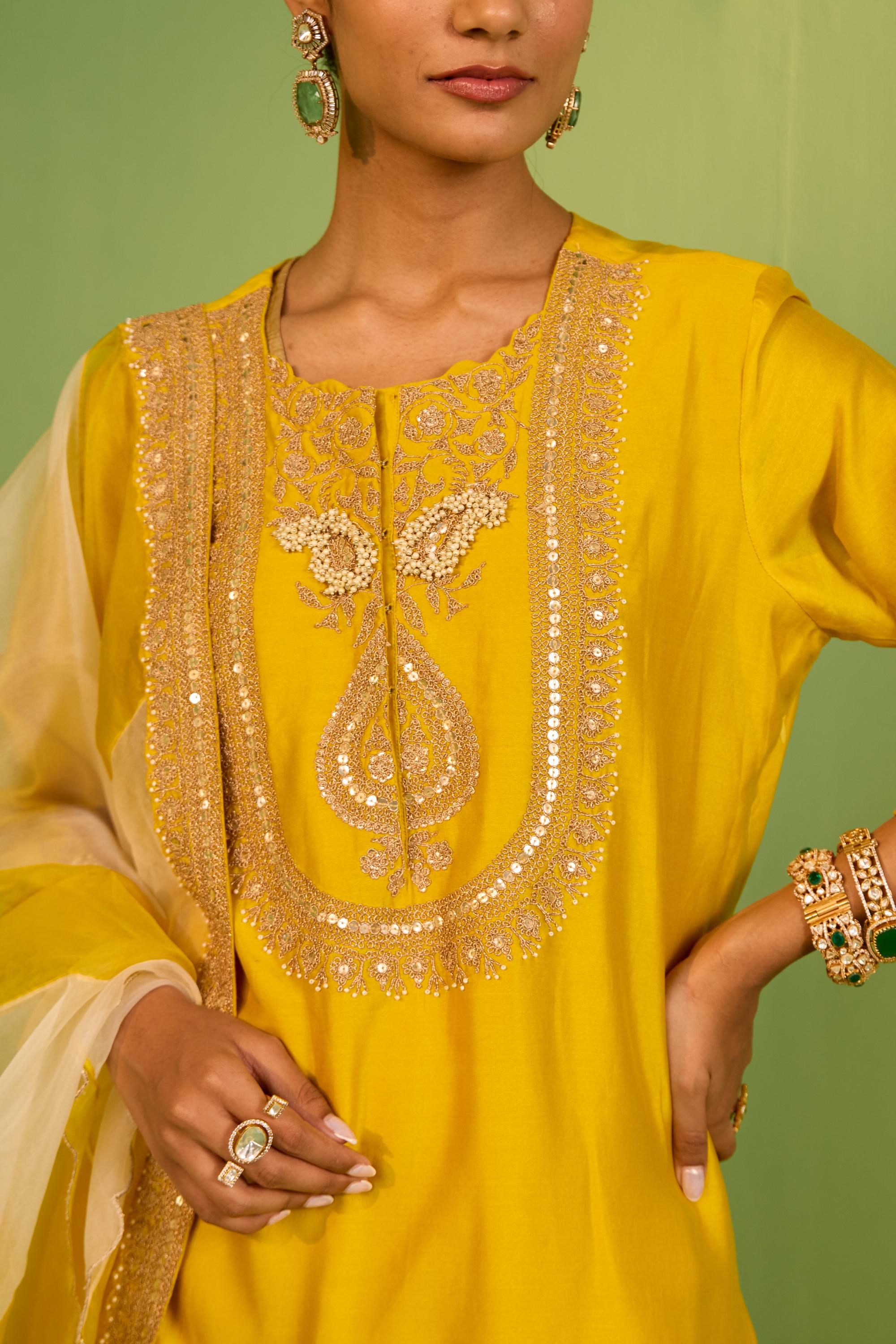 Joyful and radiant, the Yellow Bahaar Sophia Sharara Set brings together traditional charm and contemporary finesse. Drenched in a vibrant yellow hue, this ensemble features a delicately embroidered kurta paired with wide-legged sharara pants and a lightweight dupatta that adds fluidity and flair. Ideal for haldi ceremonies, mehendi functions, or festive daytime celebrations, the Yellow Bahaar Sophia Sharara Set is for the woman who lights up every occasion with her warmth, grace, and timeless style.