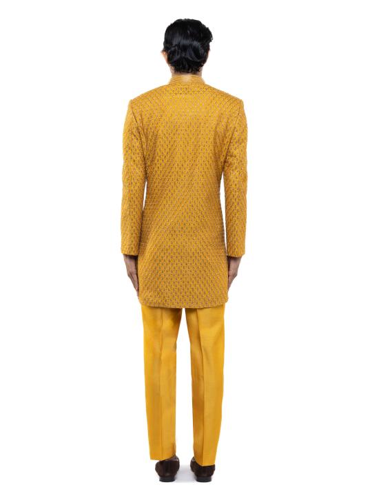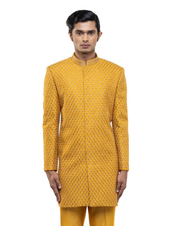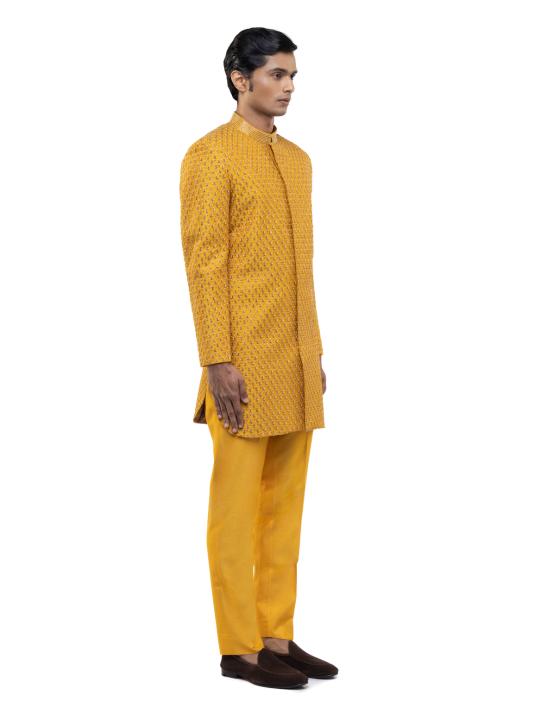 Bright and elegant, this Yellow Silk Beaded Embroidery Sherwani Set features exquisite beadwork that adds a subtle shimmer and texture. Crafted from luxurious silk, it includes a stand collar, concealed placket, and refined Mother of Pearl buttons. The regular fit and straight hem create a classic silhouette-perfect for weddings, festive occasions, and celebrations where you want to stand out with grace.