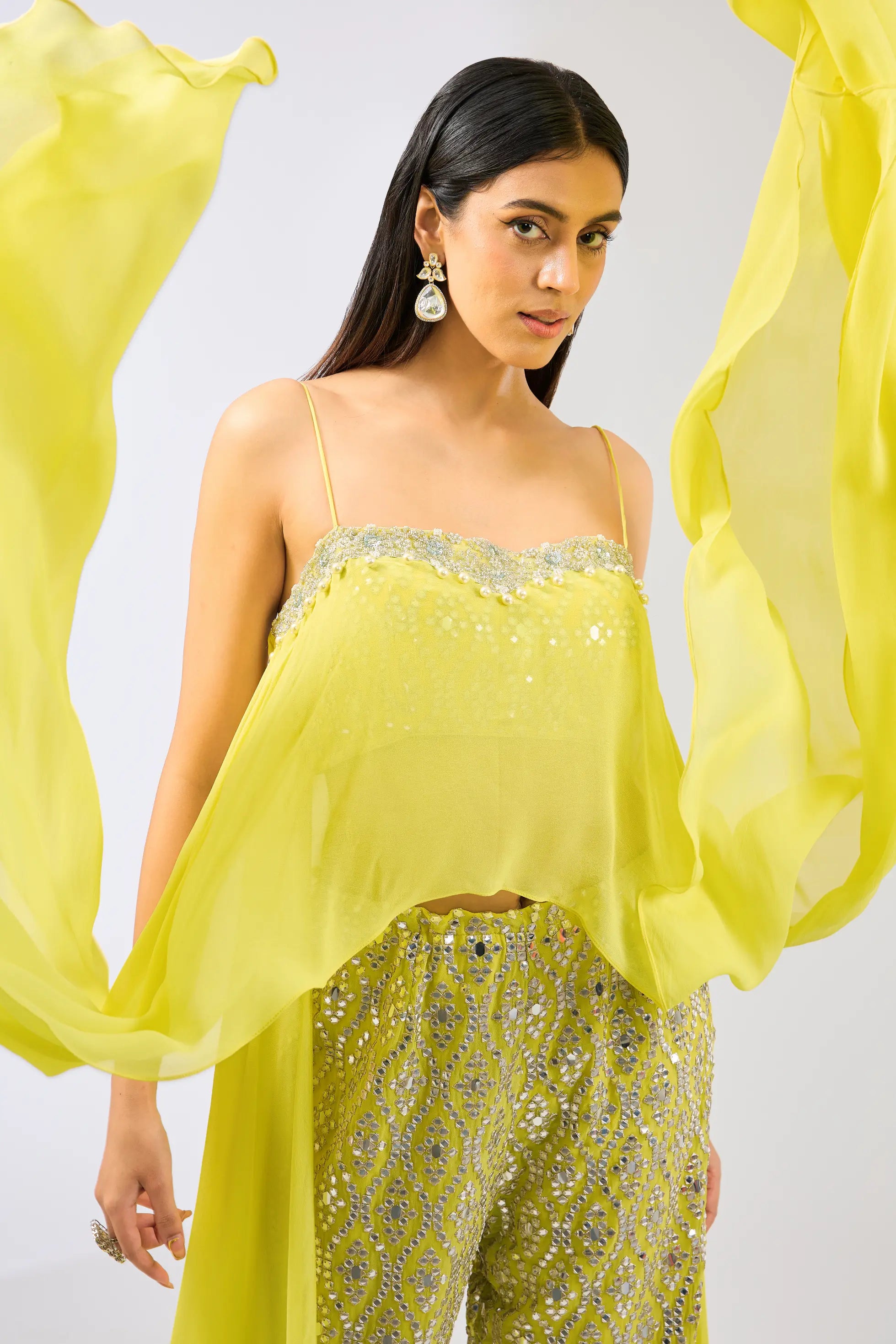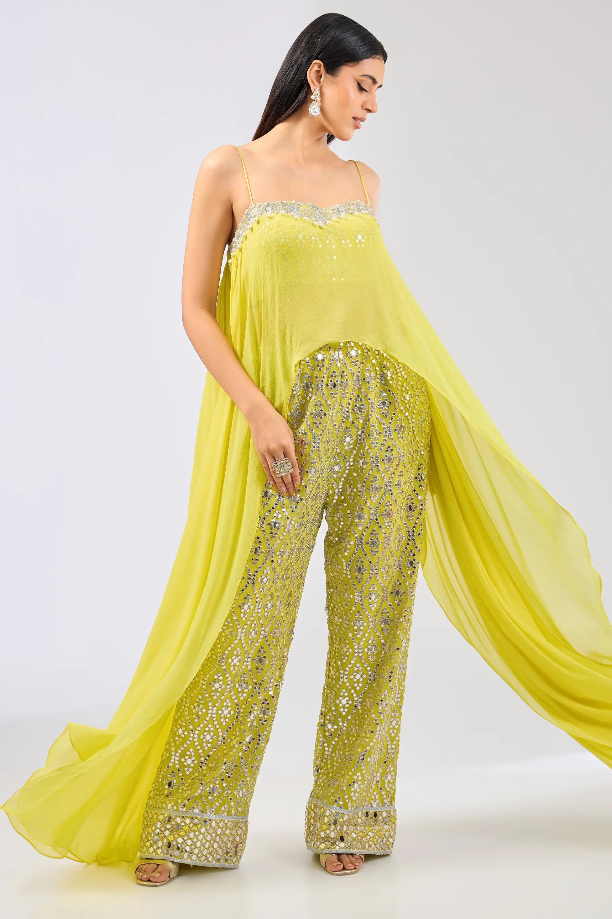 Yellow cape with attached blouse and mirror work pallazo