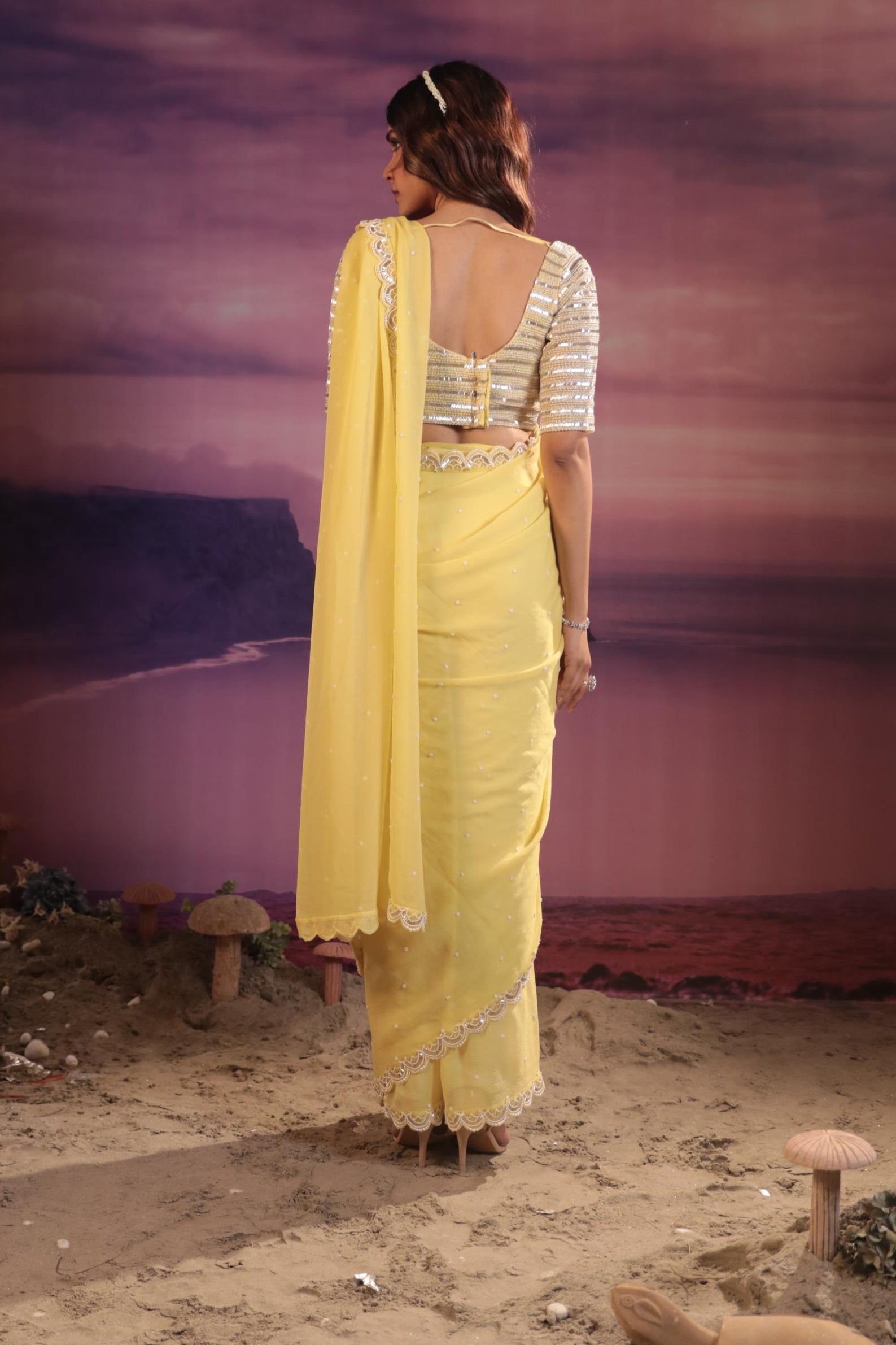 Add a touch of elegance with this stunning saree featuring booties scattered all over with a scallop border at the edge. Paired with a blouse showcasing horizontal embroidered lines, this outfit combines modern sophistication with traditional charm, making it perfect for weddings or festive gatherings.
