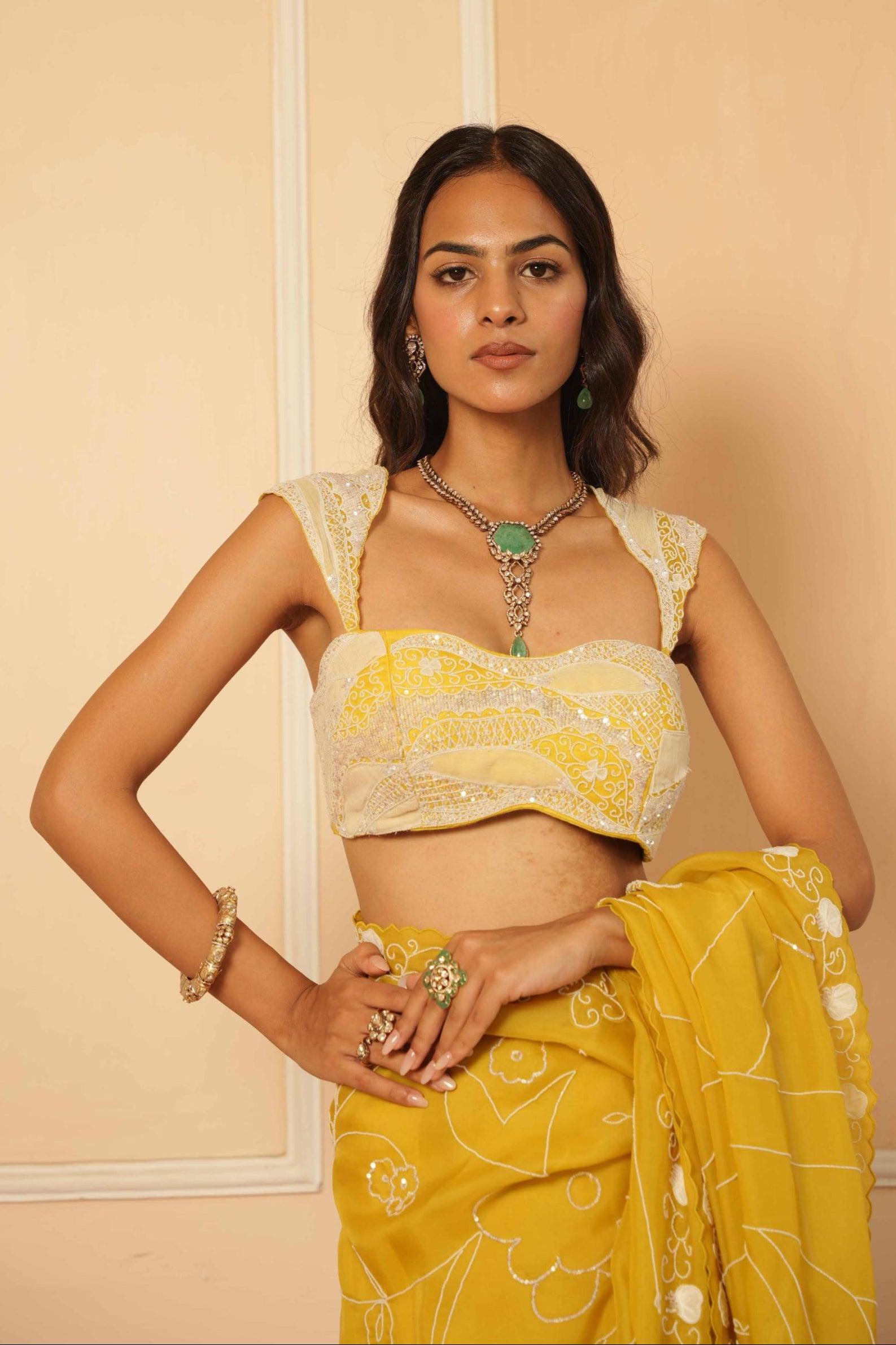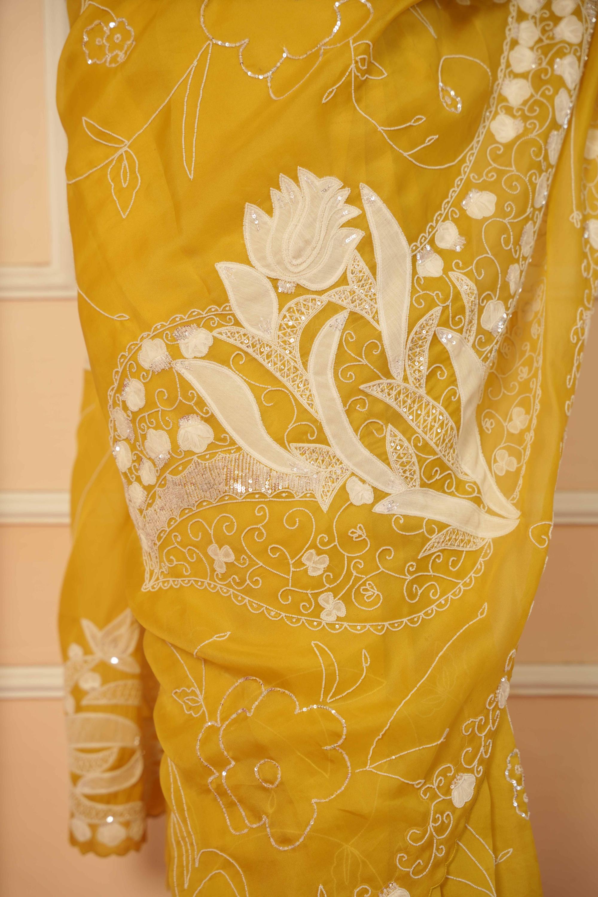 The Yellow Dil Se Aya Saree is a radiant homage to joy, tradition, and effortless femininity. Drenched in a luminous yellow hue, this saree is crafted for sunlit celebrations and heartfelt moments. With fluid draping and delicate detailing, it brings a sense of warmth and optimism—perfect for the woman who leads with grace and a spark of sunshine in her soul. Ideal for haldi ceremonies, daytime festivities, or vibrant pre-wedding rituals. Pair with fresh florals and a soft glow for a look that’s joyful, timeless, and truly dil se.