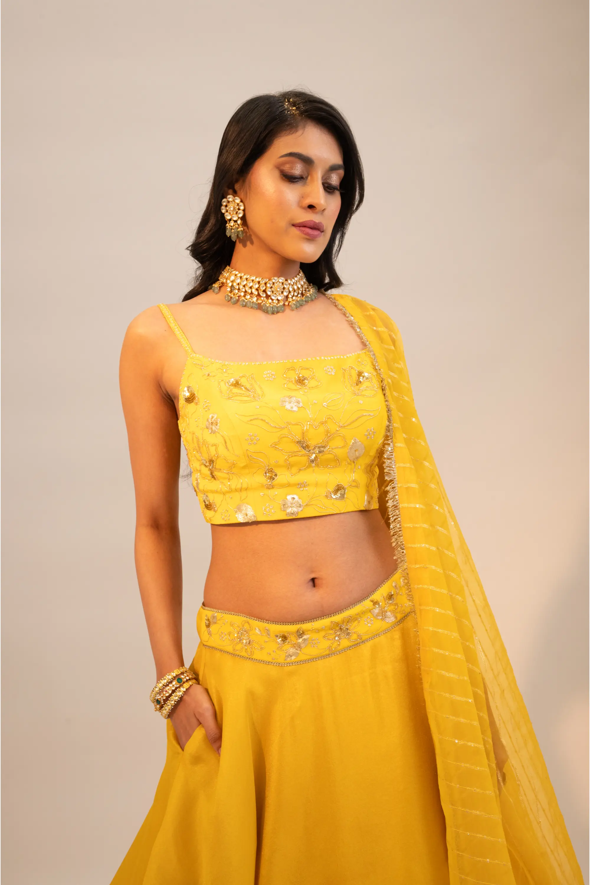 Yellow embroidered lehenga and blouse paired with dupatta