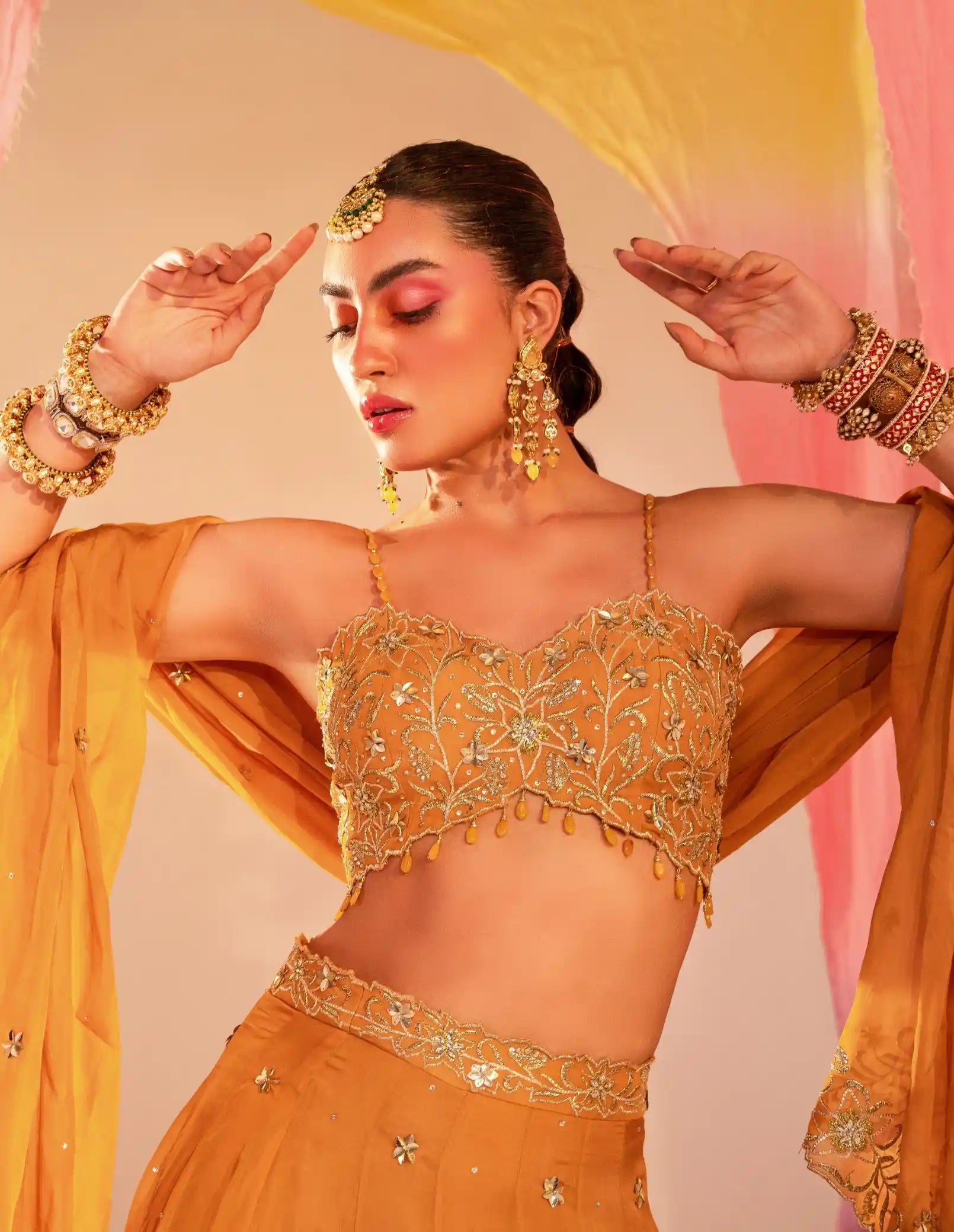 Brighten your wardrobe with our yellow v hem embroidered blouse, beautifully paired with a matching lehenga and an embroidered dupatta. This vibrant set features intricate embroidery and a flattering silhouette, perfect for making a statement at any festive occasion. Embrace elegance and charm in this stunning ensemble!