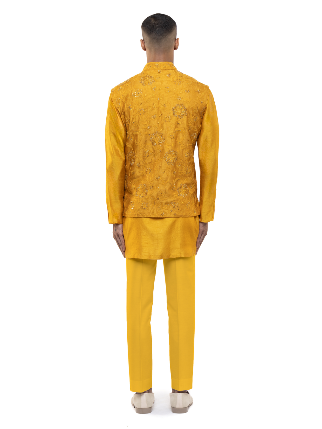 Bright and festive, this Yellow Floral Embroidery Kurta Bandi Set adds a cheerful charm to traditional wear. Crafted from lightweight georgette, the kurta features delicate floral embroidery paired with a coordinated bandi for added elegance. Finished with a stand collar, concealed placket, and Mother of Pearl buttons, it offers a refined silhouette with a straight hem and regular fit perfect for haldi functions, summer weddings, or celebratory gatherings.
