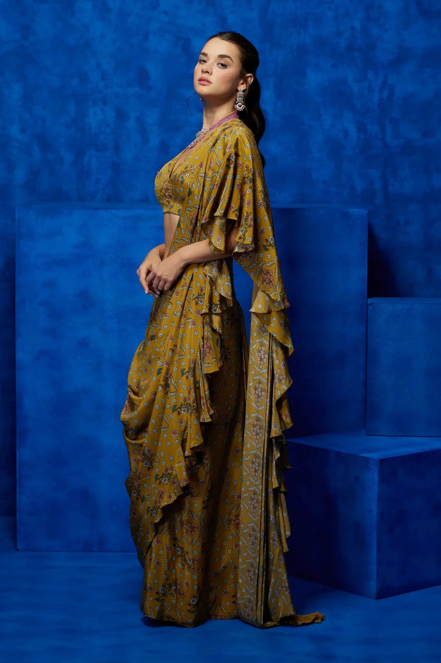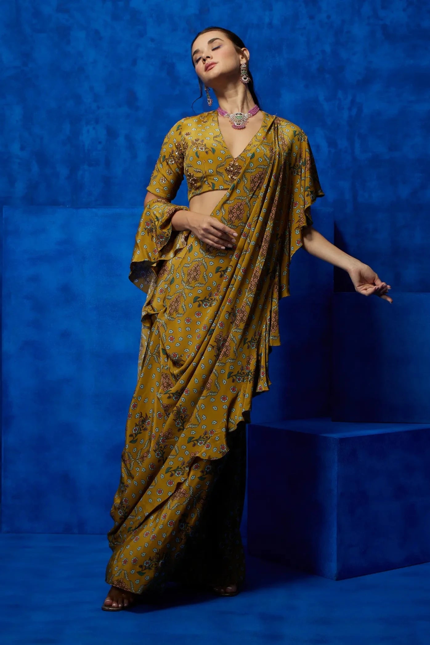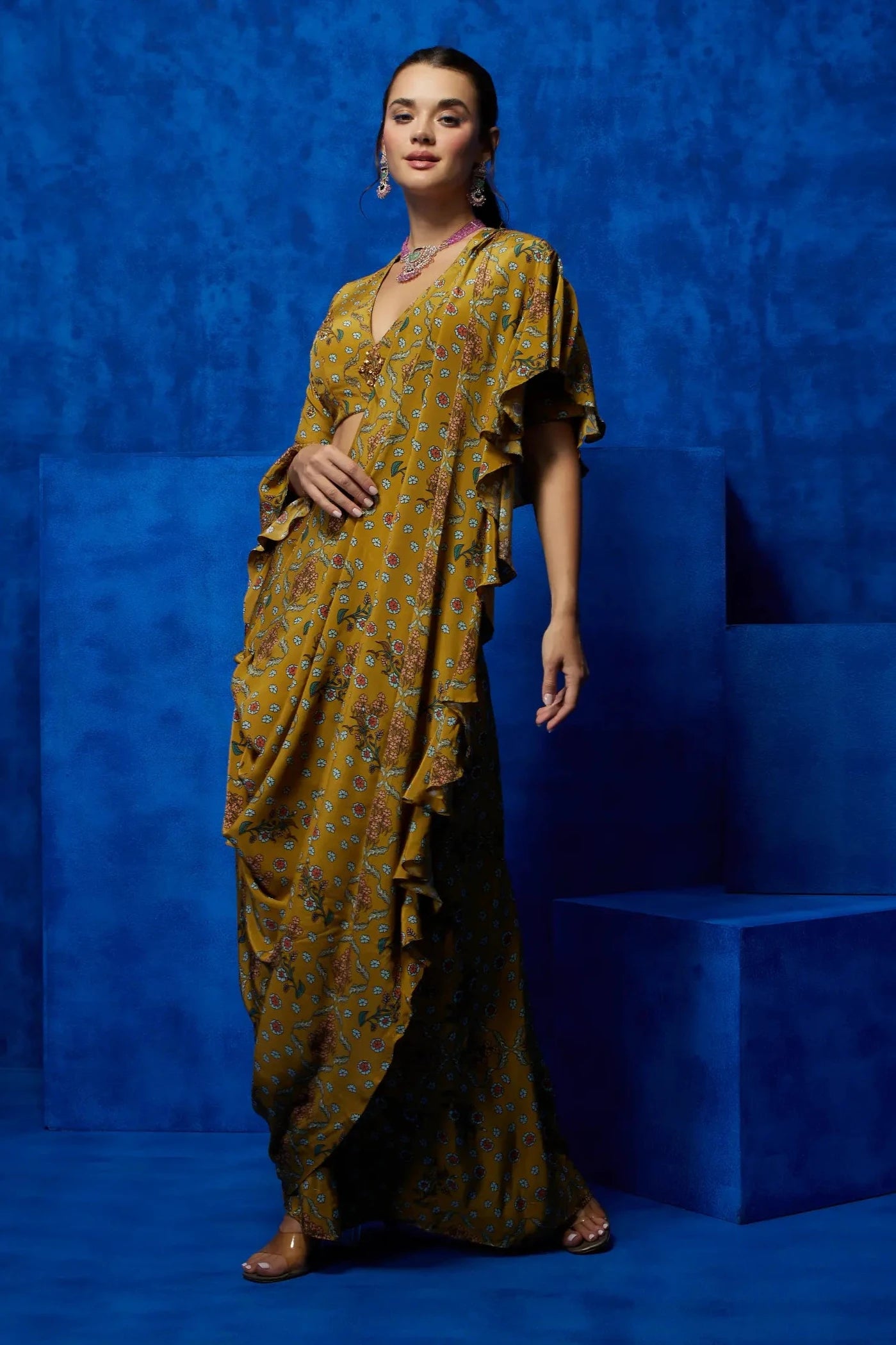 Step into a world of vibrant elegance with this yellow floral printed drape saree. The bright yellow hue, complemented by delicate floral prints, creates a cheerful yet sophisticated look. The draped design ensures effortless flow and comfort, making it perfect for weddings, festive occasions, or evening gatherings. With its modern appeal and timeless charm, this saree offers a refreshing take on traditional style.