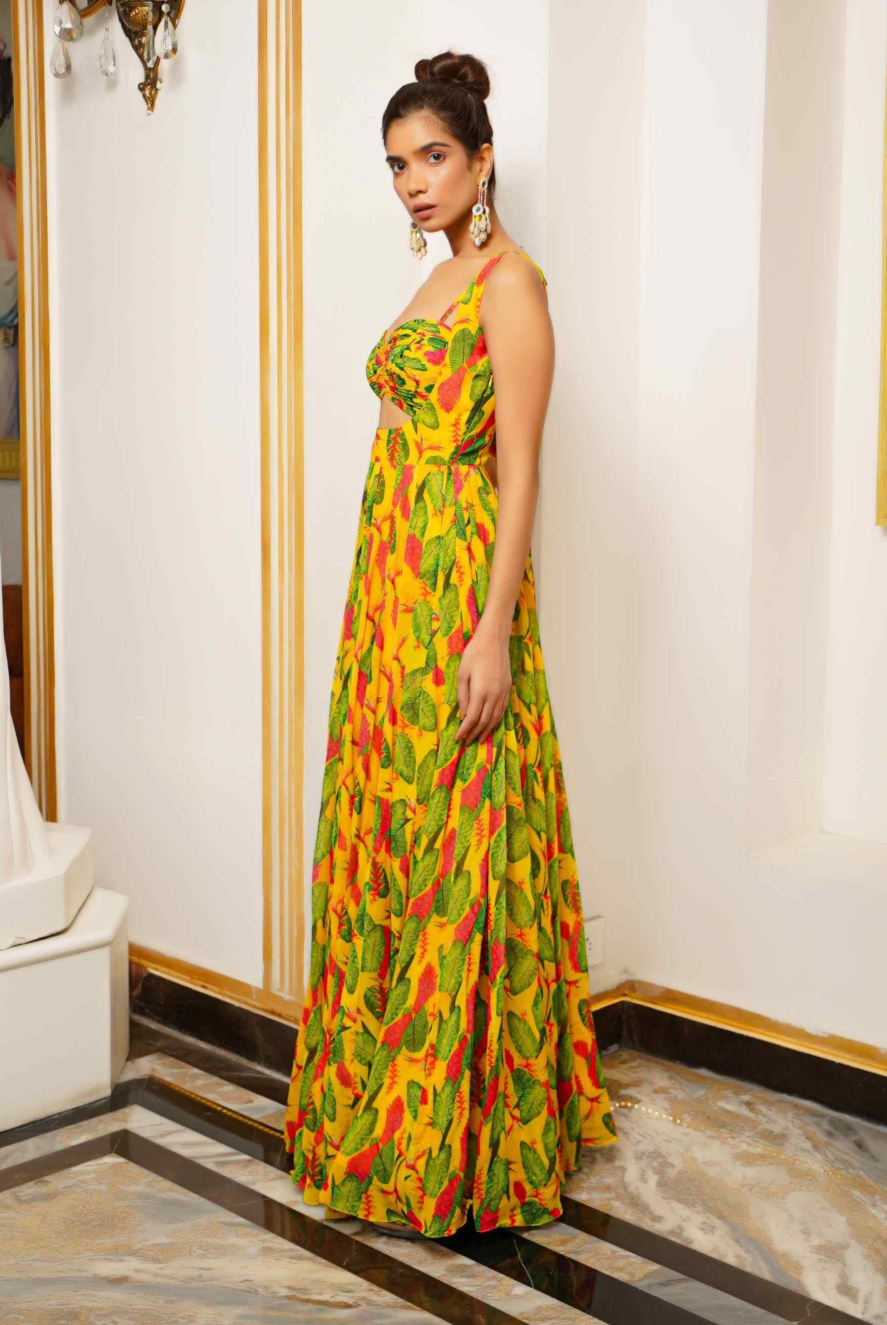 Discover the epitome of modern elegance with this stunning set. Featuring a ruched padded bustier with a stylish back knot, this ensemble effortlessly combines sophistication with contemporary design. The long lehenga dress, with its daring high slit, offers a dramatic yet graceful silhouette. Perfect for making a bold statement at any high-profile event, this set seamlessly blends comfort with high fashion.