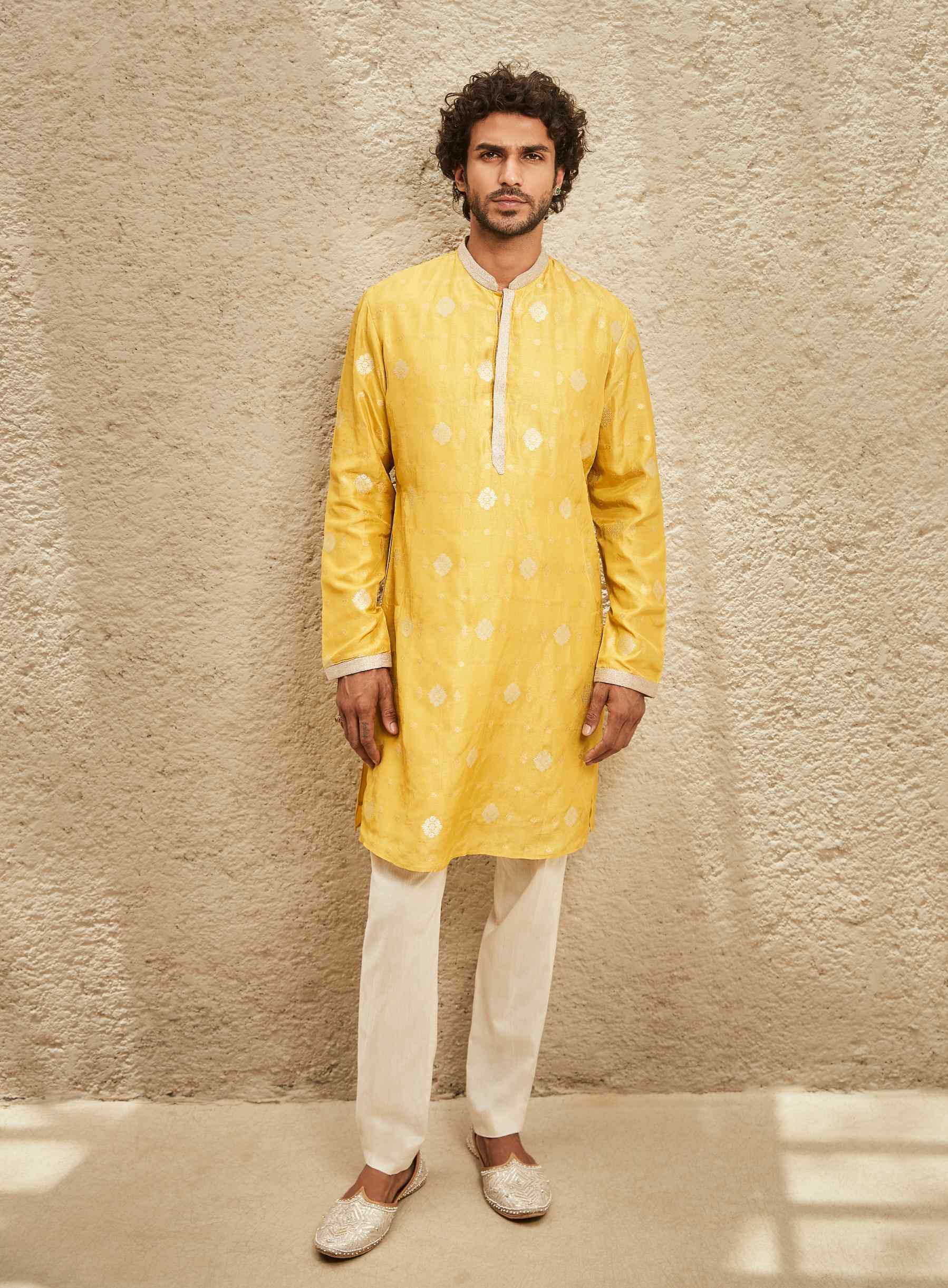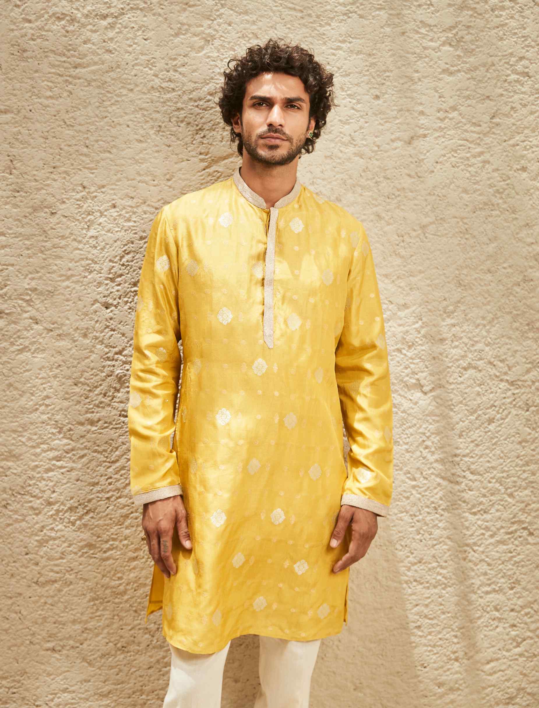 Experience a vibrant reinterpretation of a timeless classic with this yellow kurta set from Matsya's Heritage Pret '23 collection. Handcrafted in luxurious pure Banarasi buti fabric, this ensemble features exquisite dori work embellished with shimmering silver zari thread. The result is an opulent kurta set that exudes sophistication and is perfect for any celebratory occasion. Embrace the blend of tradition and modern elegance with this standout piece, designed to make every revelry unforgettable.