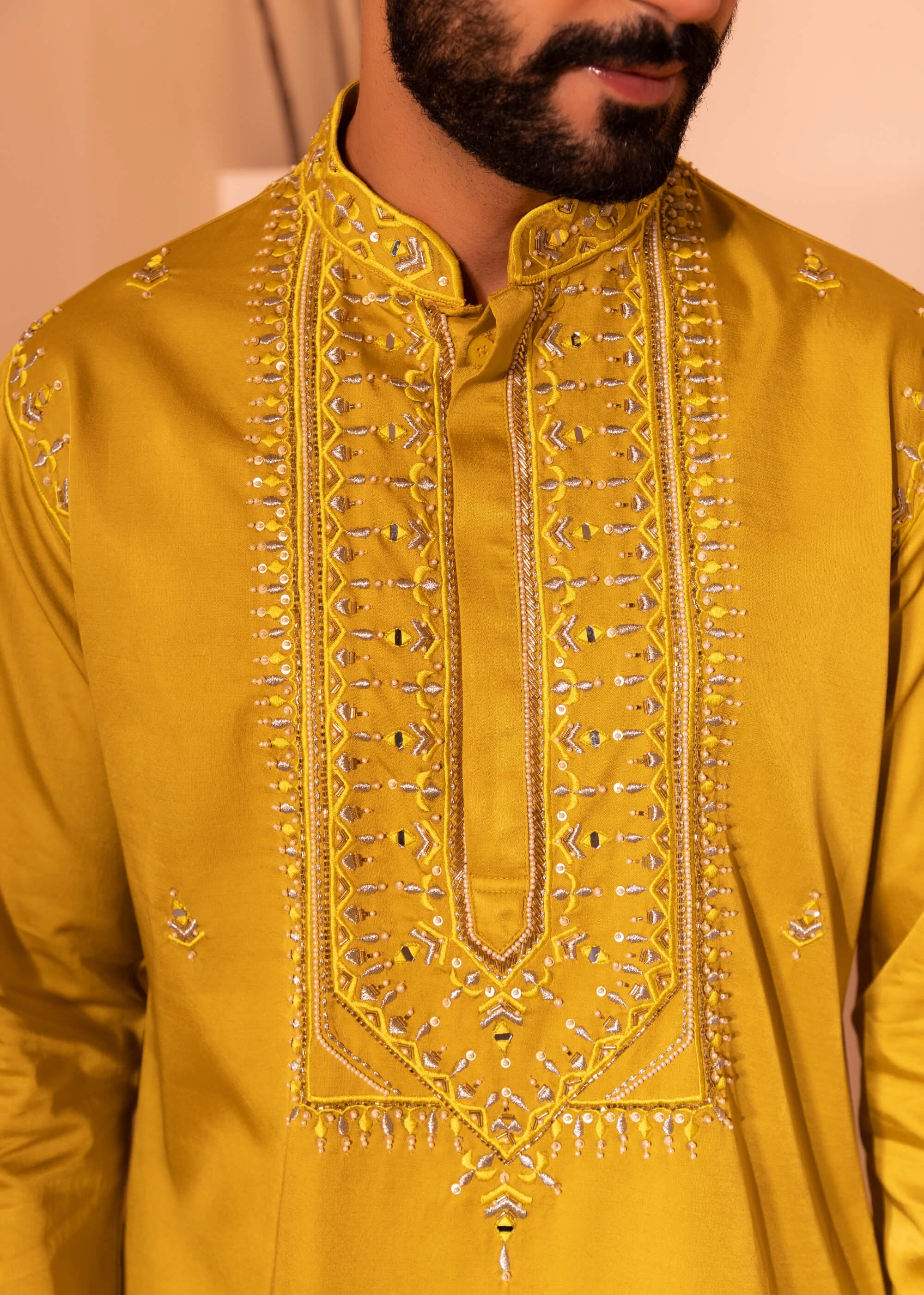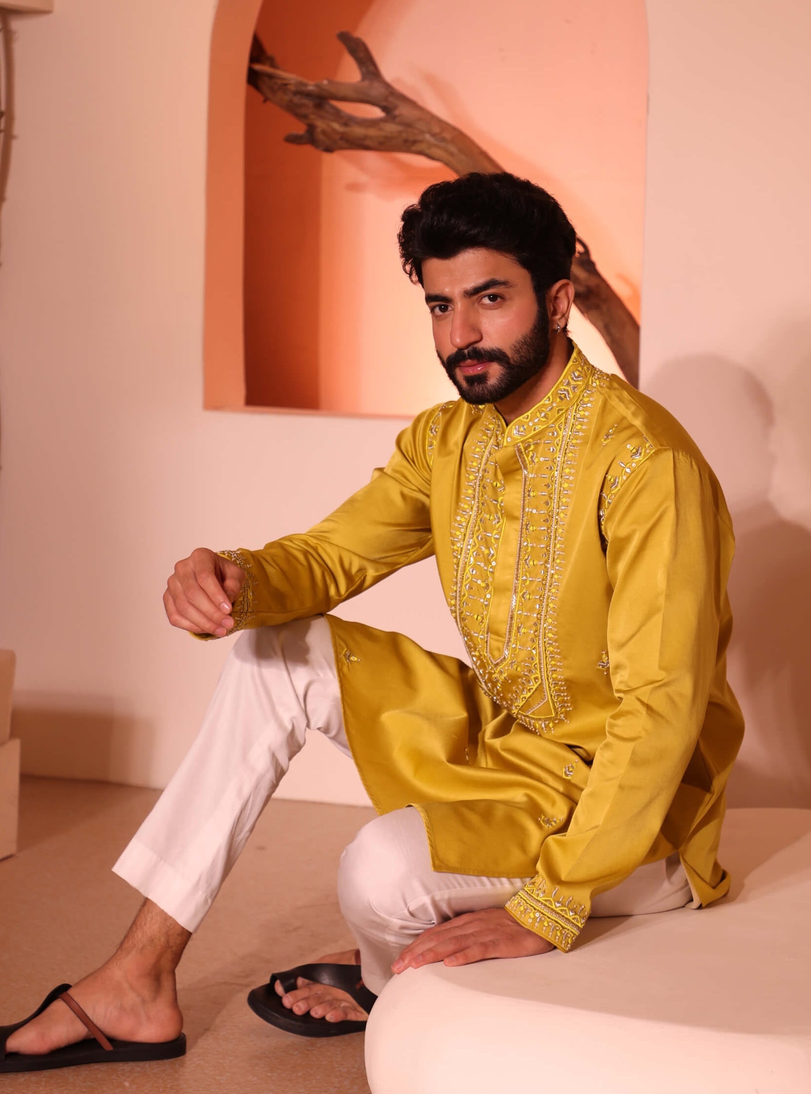 Experience the exquisite craftsmanship of the Hasrat Kurta, featuring intricate hand embroidery on the hem and yoke. This elegant kurta is adorned with detailed threadwork, sequins, mirror accents, and beads, creating a stunning visual effect. The addition of inside lining ensures a comfortable and perfect fit. Ideal for special occasions, the Hasrat Kurta seamlessly blends traditional artistry with contemporary style, offering a timeless addition to your wardrobe.