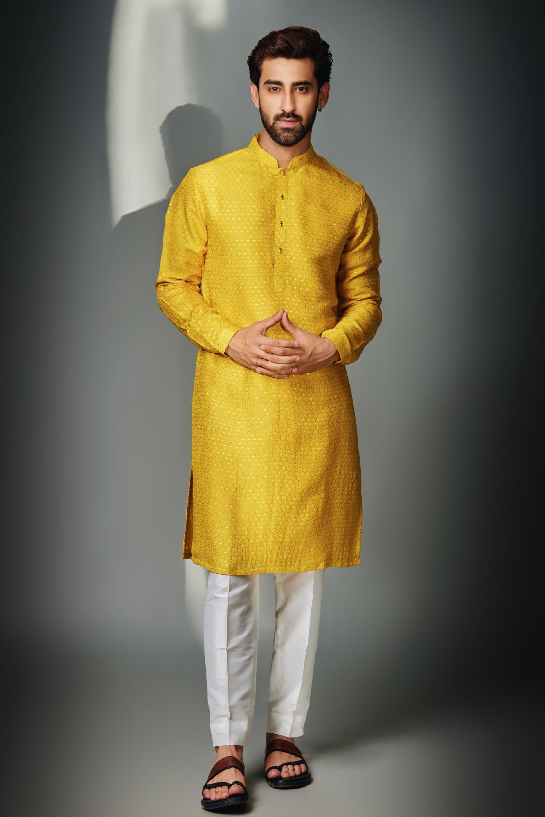 Vibrant yet subtle, the Yellow Hexagon Self Kurta with Pant is a refreshing take on traditional menswear. Featuring a geometric hexagon self-texture, this bright yellow kurta brings depth and character to a classic silhouette. Tailored for comfort and ease, it's paired with coordinated pants, making it a perfect pick for haldi ceremonies, summer weddings, or festive gatherings. A cheerful ensemble that balances structure with statement.