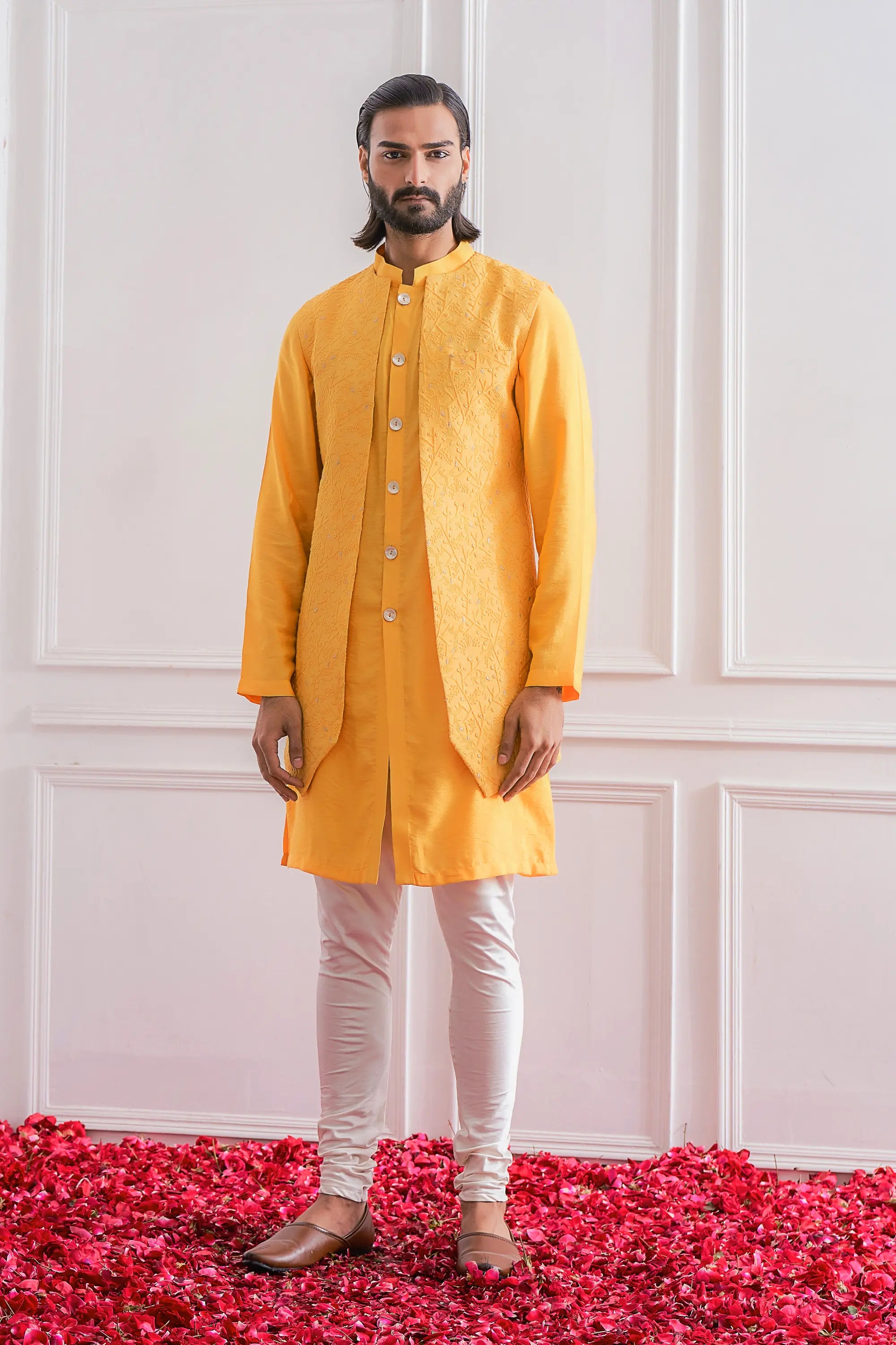 Introducing the Yellow Khushab Bandi Set, a delightful fusion of traditional elegance and contemporary style. This meticulously crafted ensemble features a beautifully tailored bandi (waistcoat) paired with a high-quality kurta, ensuring both comfort and sophistication for any occasion. The vibrant yellow hue adds a cheerful and refreshing touch, making it perfect for weddings, festive celebrations, and special gatherings.