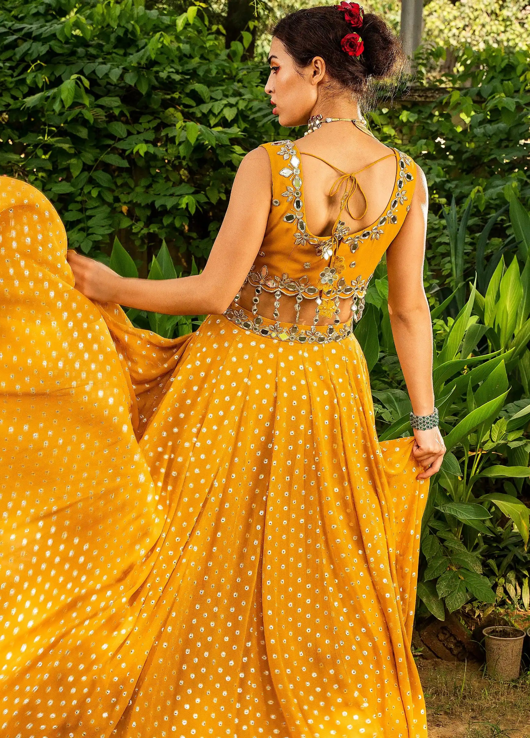 Shine in this exquisite lurex georgette lehenga adorned with a scalloped mirror work blouse and matching dupatta. Perfect for festive celebrations, this ensemble is designed to make you the center of attention. Embrace the beauty of tradition while showcasing your unique style with this stunning outfit.