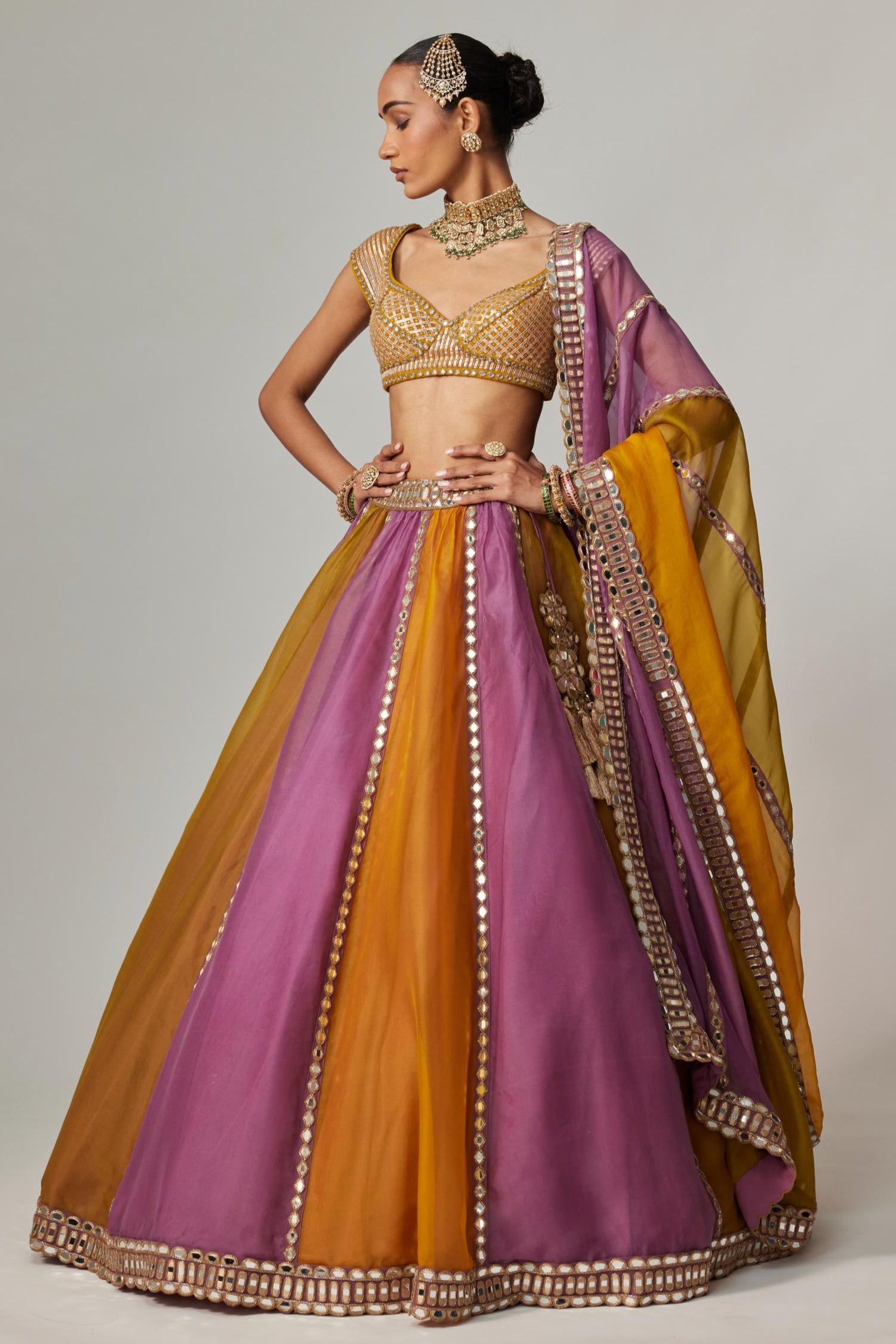 Yellow multicolor noorani linear lehenga with cap sleeve blouse