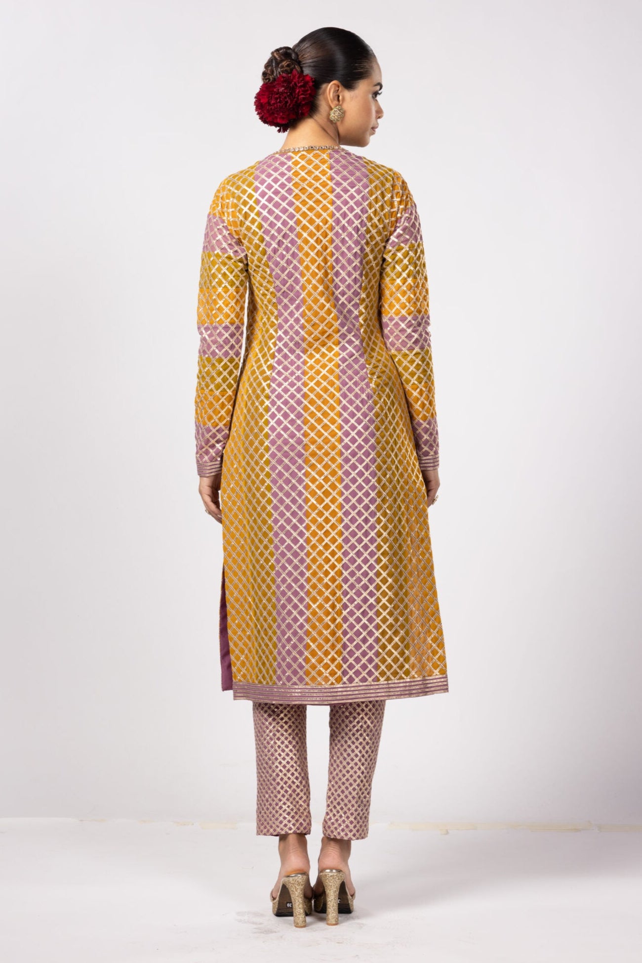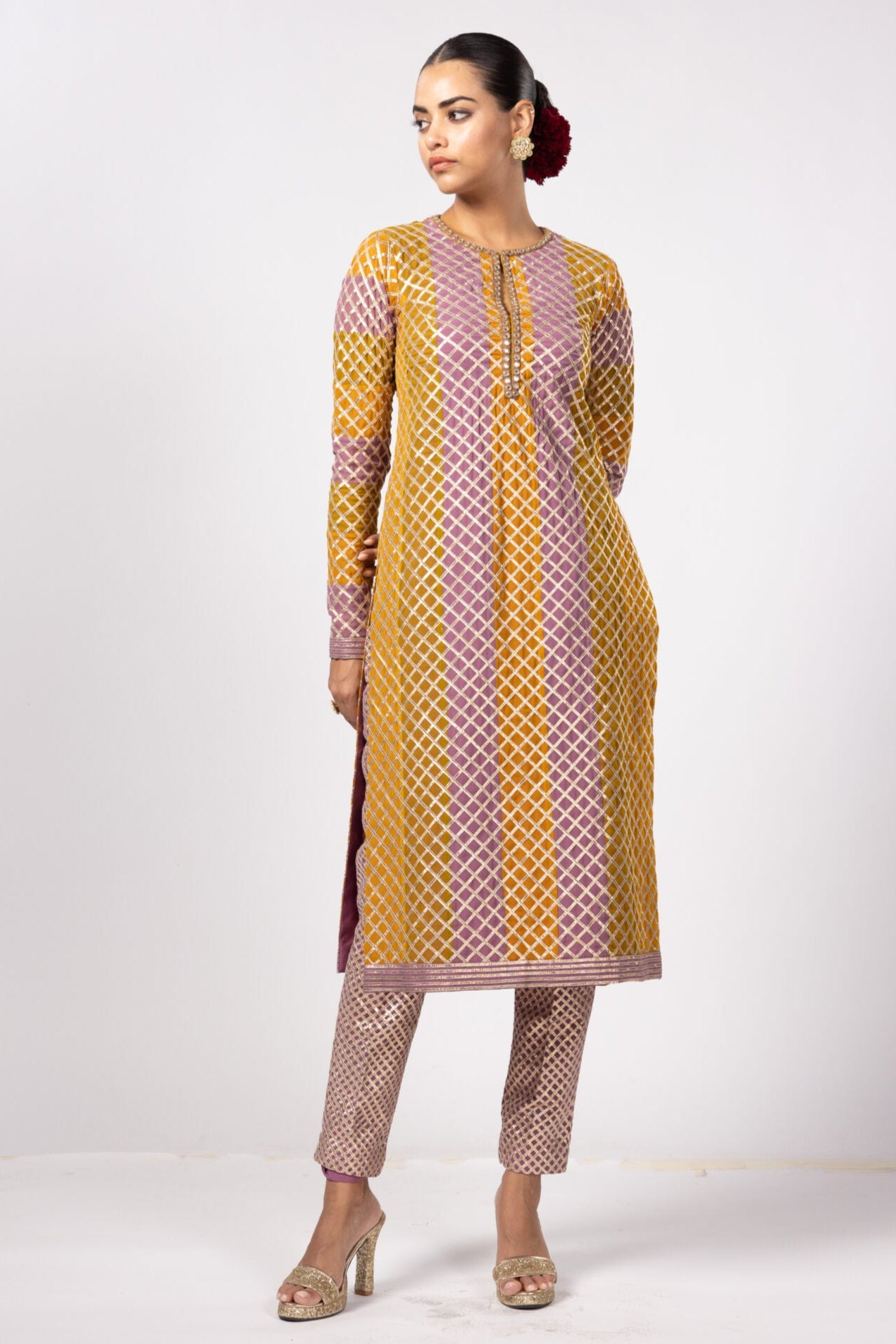 Radiating warmth and festive charm the Yellow Noorani Multicolor Kurta and Pant set is the perfect pick for daytime celebrations. The kurta crafted in a bright yellow hue is brought to life with intricate multicolor embroidery that adds a playful and artisanal touch. Paired with sleek tailored pants for modern ease this ensemble is ideal for haldi functions mehendi ceremonies or intimate festive gatherings. Designed for the woman who blends tradition with contemporary style it’s a celebration of color comfort and culture.