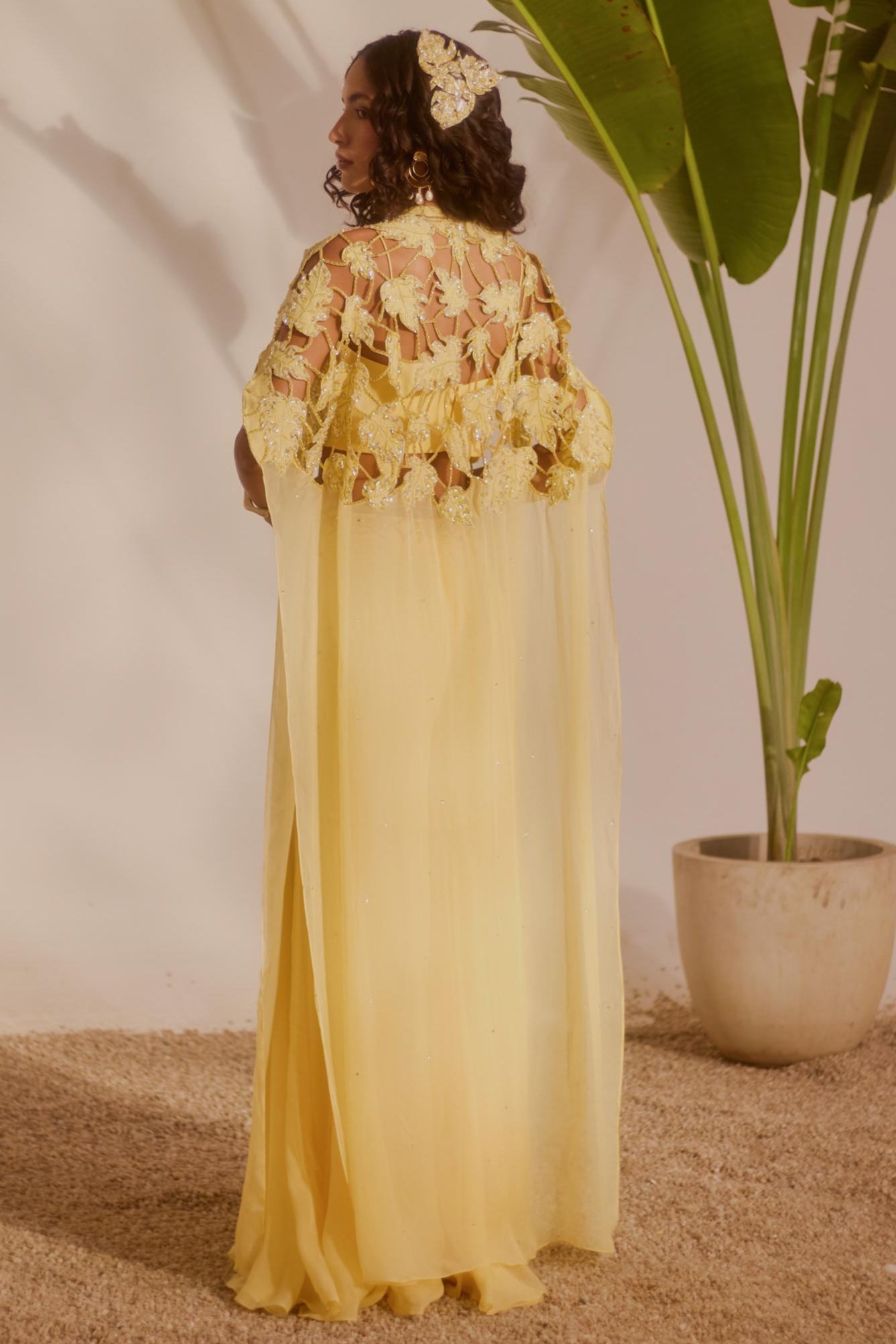 The Yellow Nyra Solana Cape Set is a radiant blend of fluidity and finesse. Drenched in a golden sunshine hue, this ensemble features a breezy cape layered over a contemporary blouse and flowing pants or skirt. The silhouette is effortlessly elegant, perfect for pre-wedding festivities or a summer soiree. Light, luminous, and fashion-forward, it embodies modern Indian glam with a spirited twist.