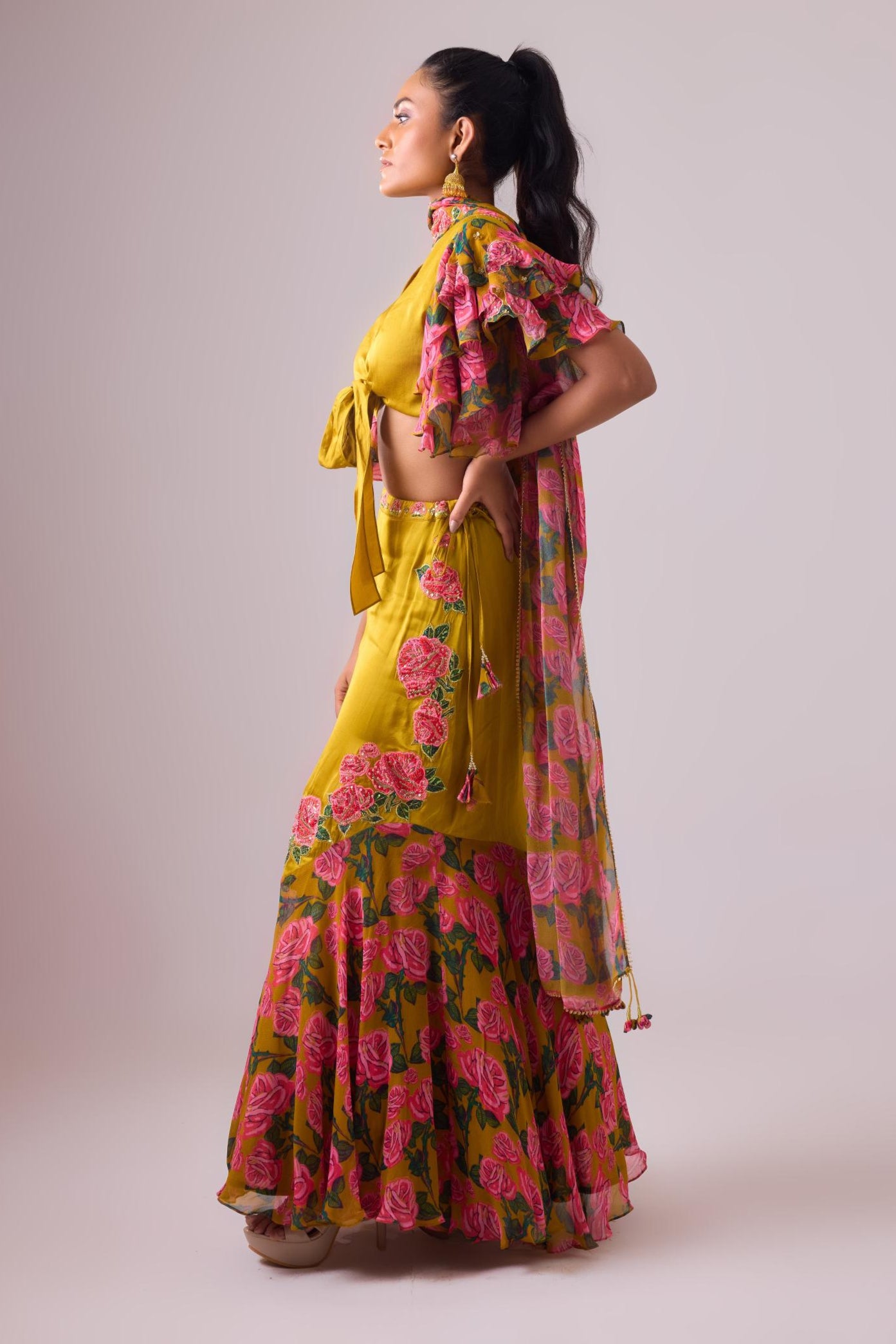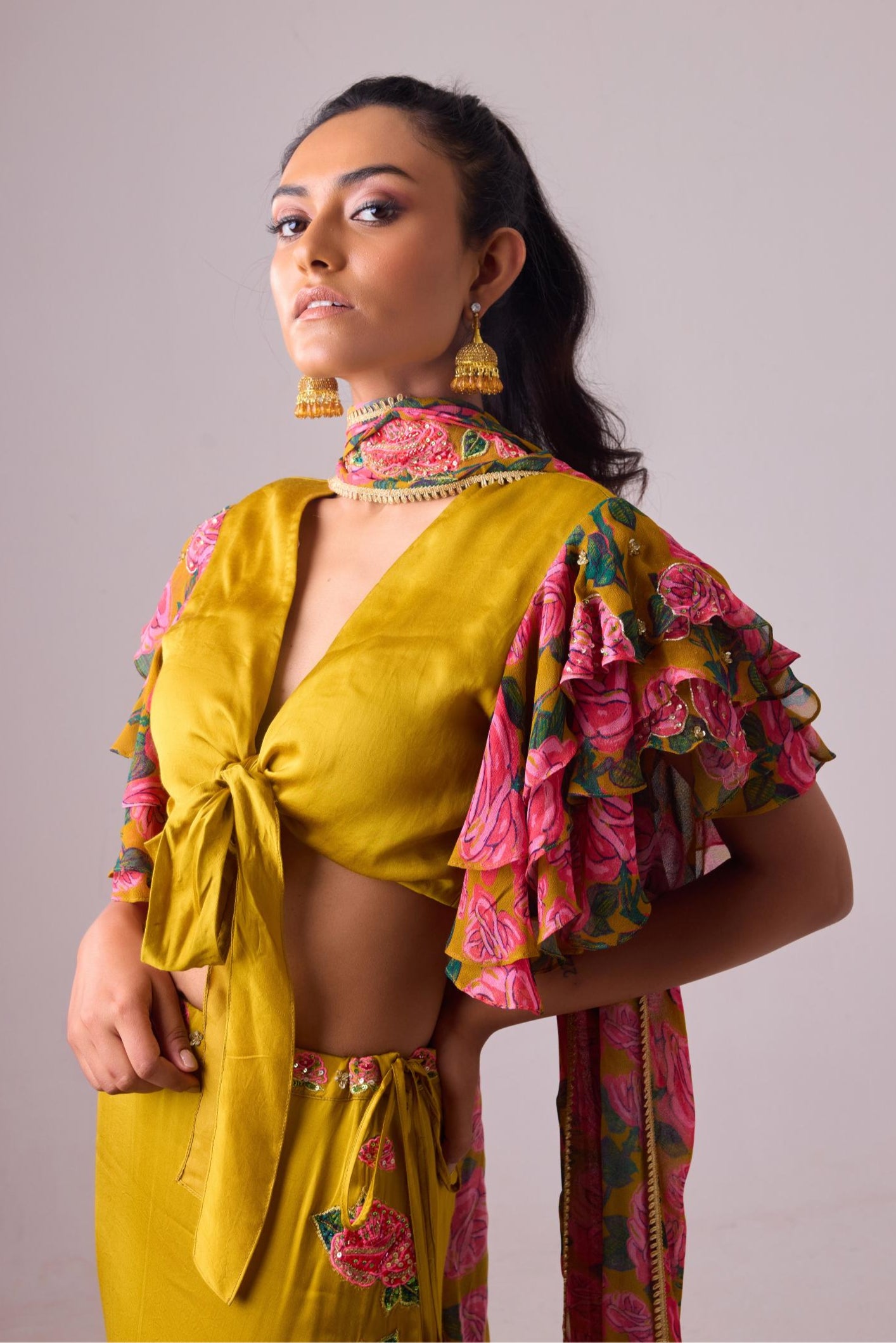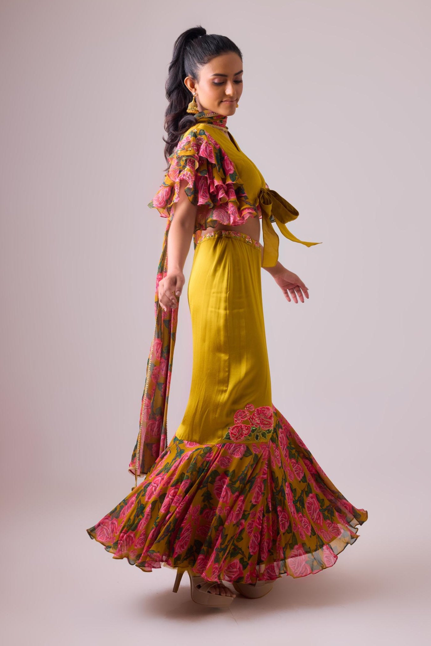 Yellow ochre lehenga with twist of frills and blouse with flared sleeves