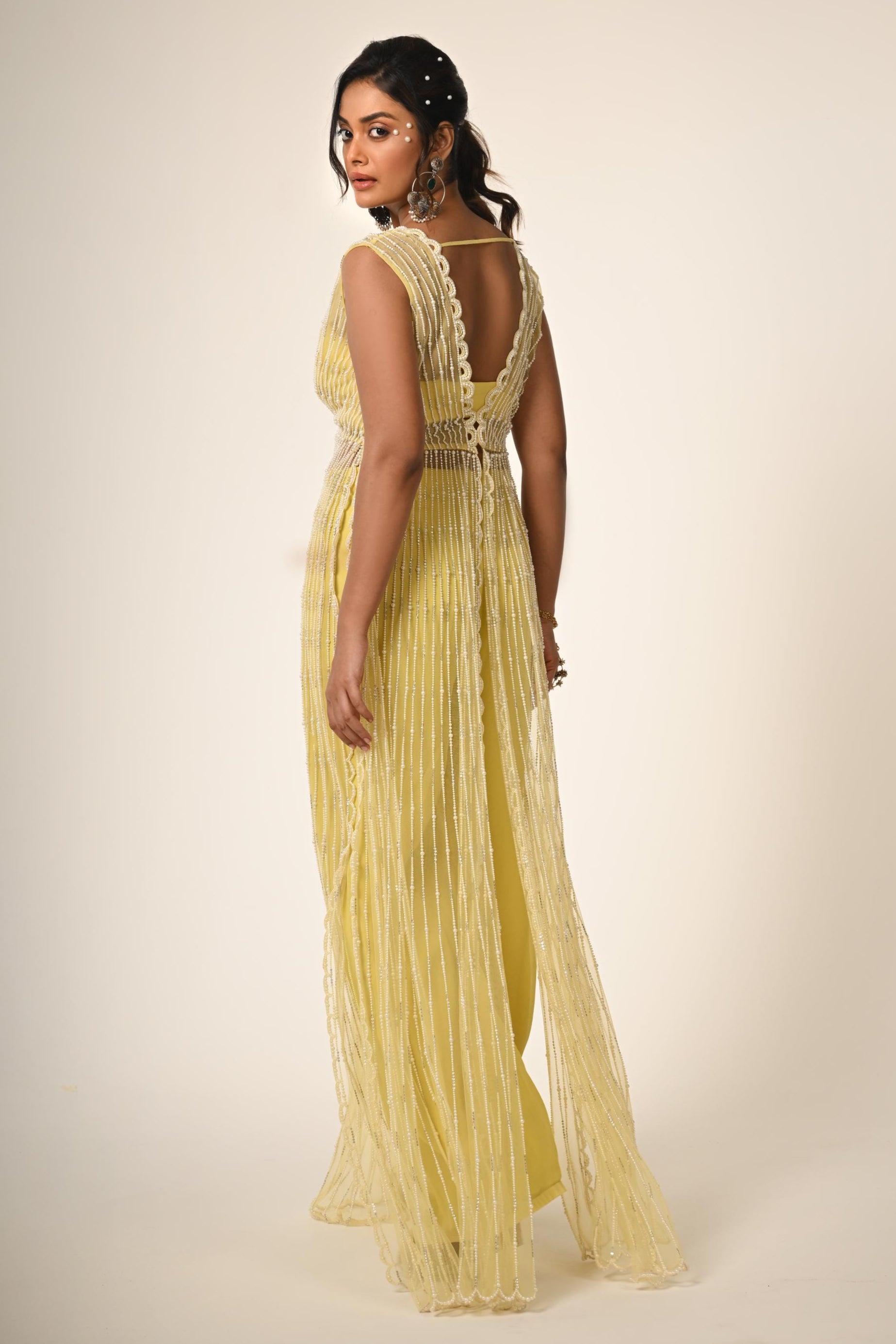 Radiant and reimagined, the Yellow Pearls Cape with Bustier and Pants brings a fresh twist to traditional drapes. Crafted in a soft, flowing fabric, the saree is paired with a delicately embellished cape featuring pearl embroidery that adds a hint of opulence and grace. The cape replaces the conventional blouse, offering both coverage and couture appeal. Perfect for haldi functions, destination weddings, or modern festive soirées, this ensemble combines elegance, ease, and statement-making style.