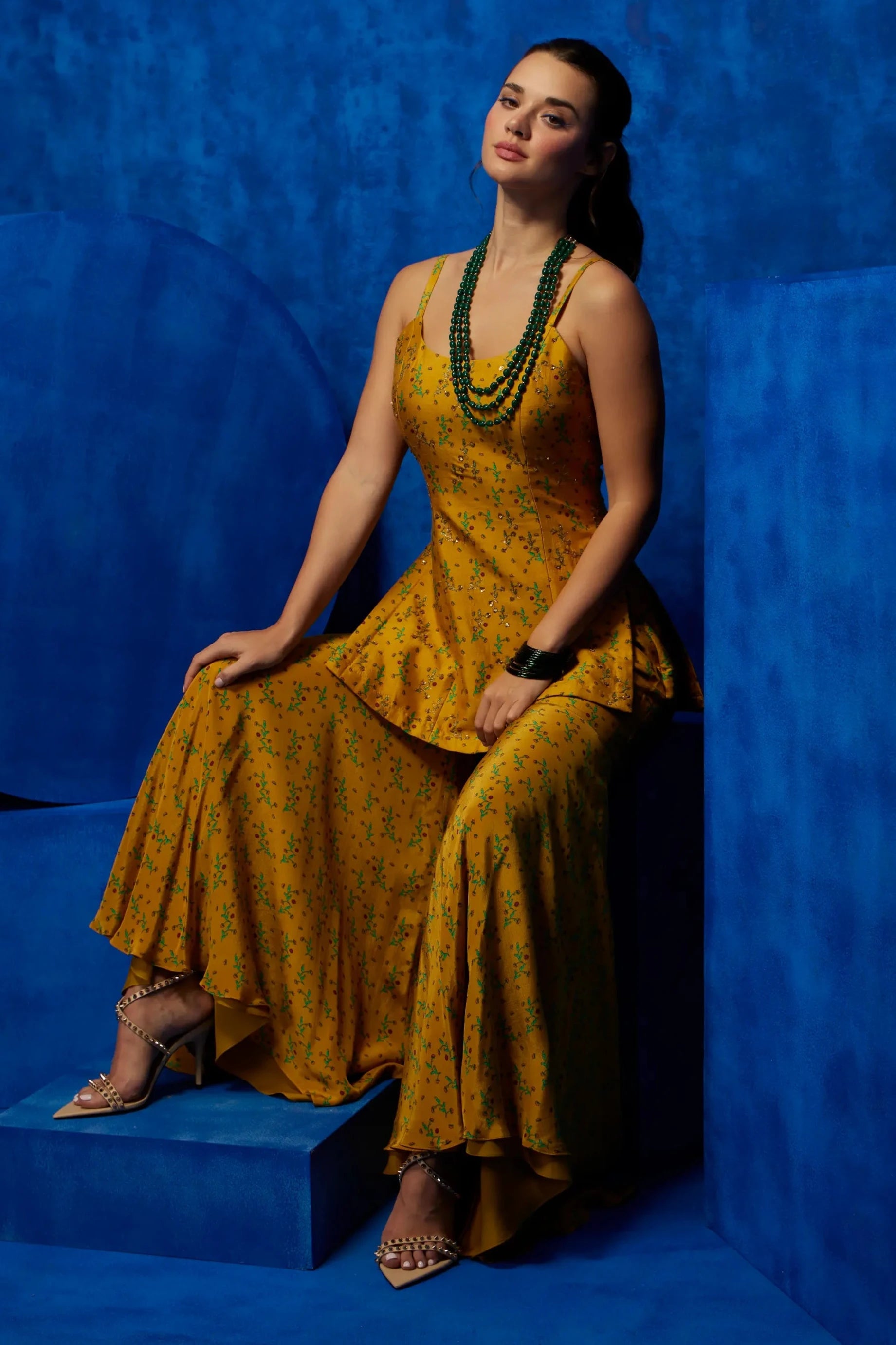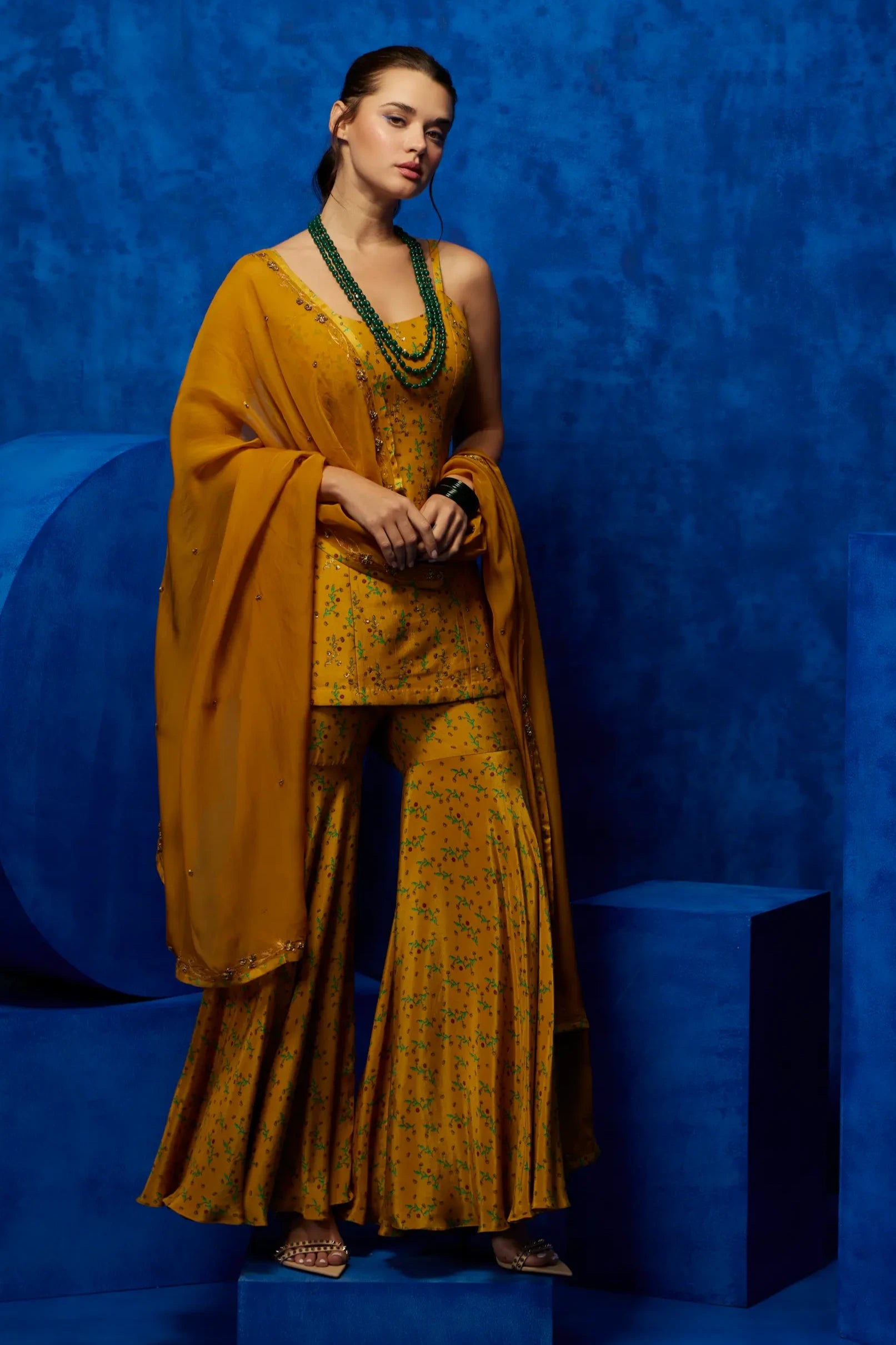 Brighten up your wardrobe with this yellow printed sharara set. The vibrant yellow hue, paired with intricate prints, creates a stunning, lively look. The flowy sharara pants offer a comfortable, flattering fit, while the matching top completes the ensemble with a chic, traditional flair. Perfect for weddings, festivals, or any special occasion, this set combines elegance and contemporary style for a standout look.