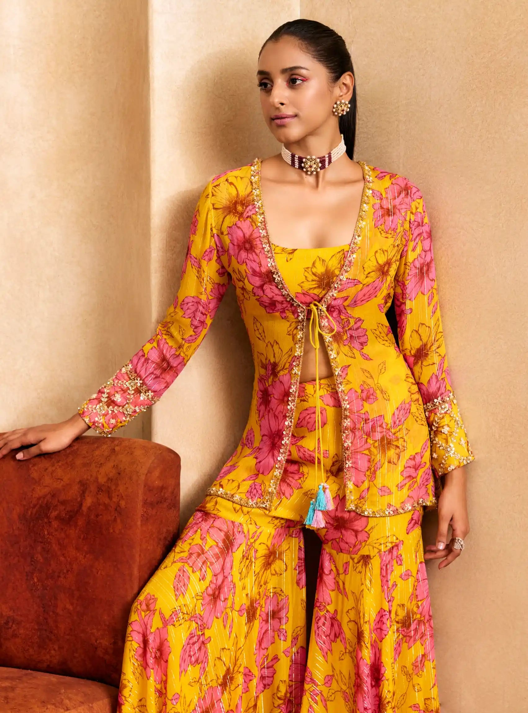 Elevate your style with this stunning yellow and pink floral printed short jacket, made from lightweight georgette fabric featuring shimmering lurex stripes. Adorned with exquisite hand embroidery, this jacket adds a touch of elegance to any ensemble. It pairs beautifully with a coordinating blouse and a flared sharara, creating a chic and fashionable look. Perfect for festive occasions or gatherings, this outfit combines contemporary flair with traditional charm, ensuring you stand out effortlessly!