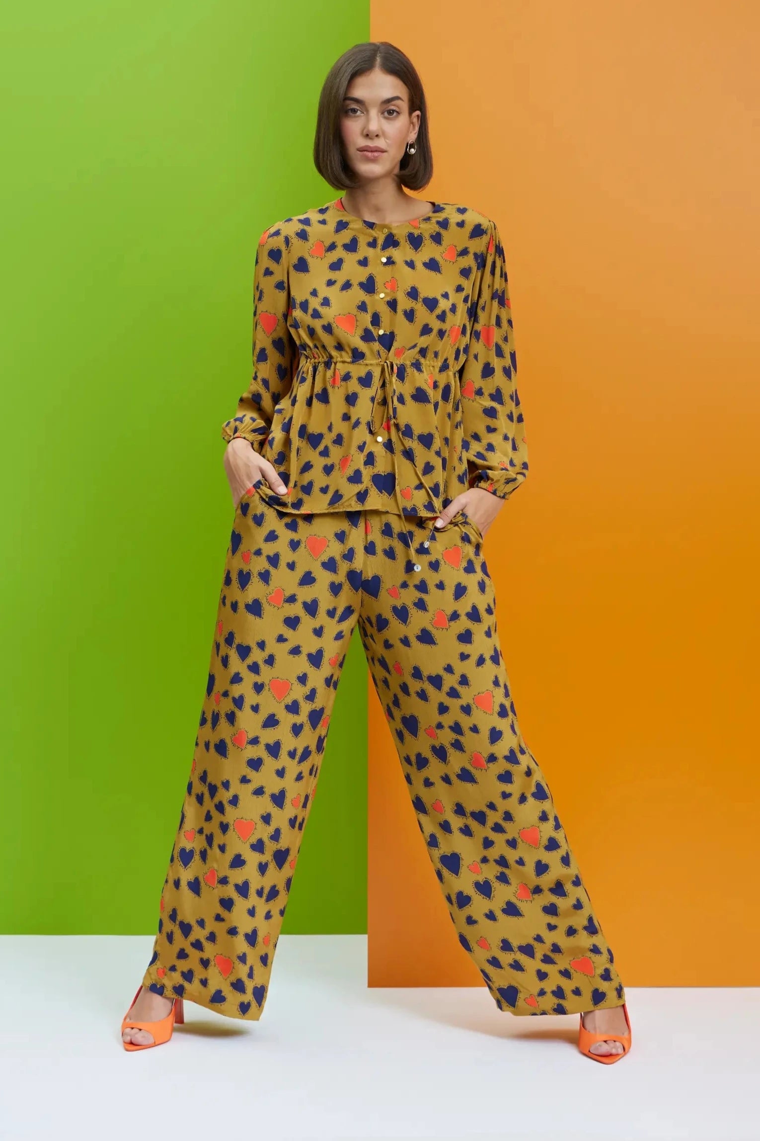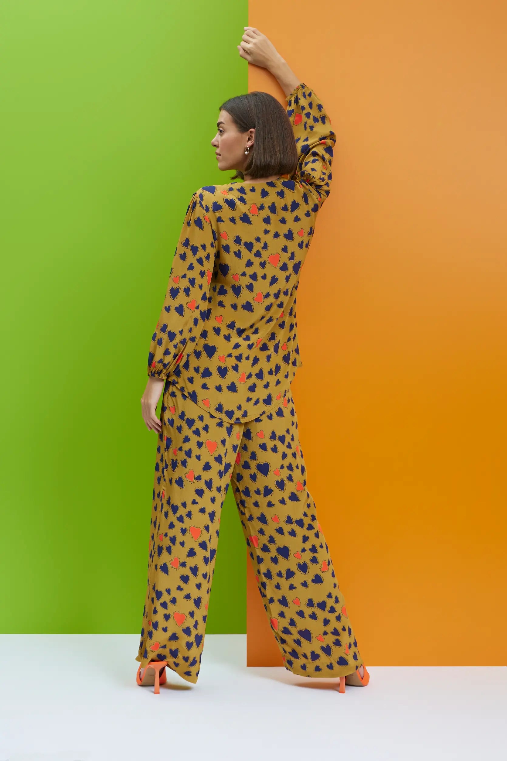 Add a vibrant touch to your wardrobe with this yellow printed tie-up shirt with pants. The playful tie-up detail at the waist enhances the shirt's relaxed fit, while the bold print brings a burst of color to your look. Paired with matching pants, this chic set is perfect for casual outings, brunches, or weekend adventures, combining style, comfort, and a pop of sunshine in one effortlessly fashionable ensemble.
